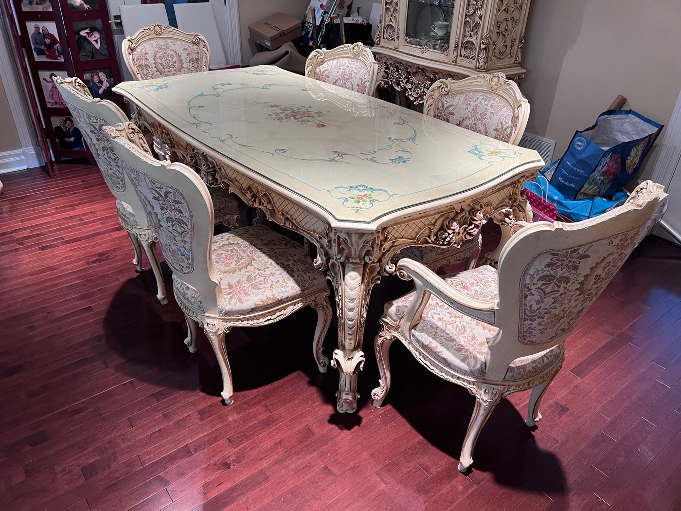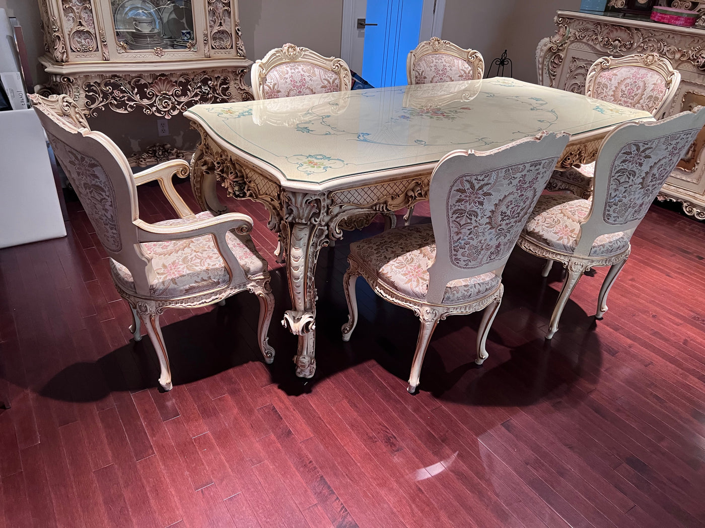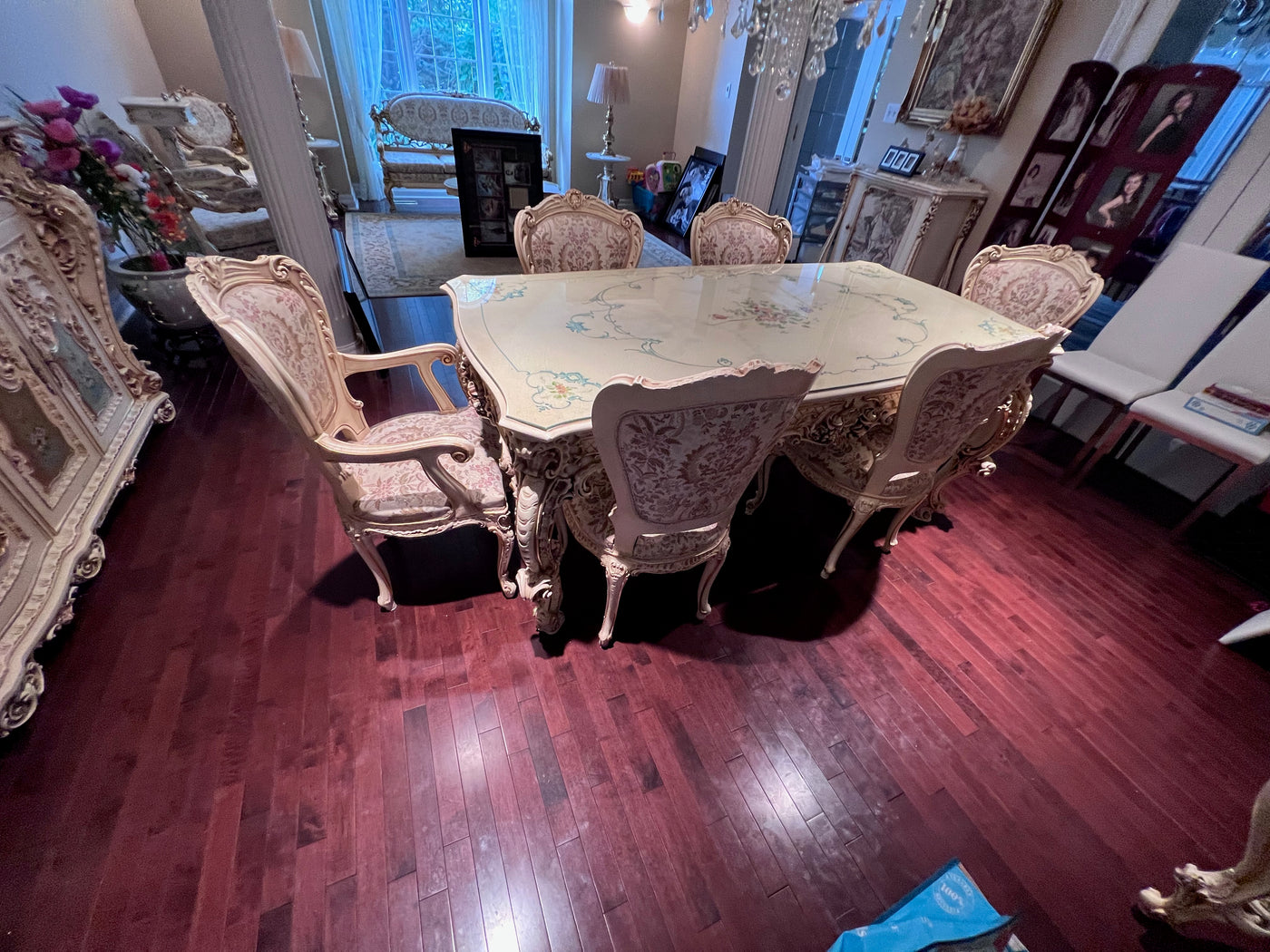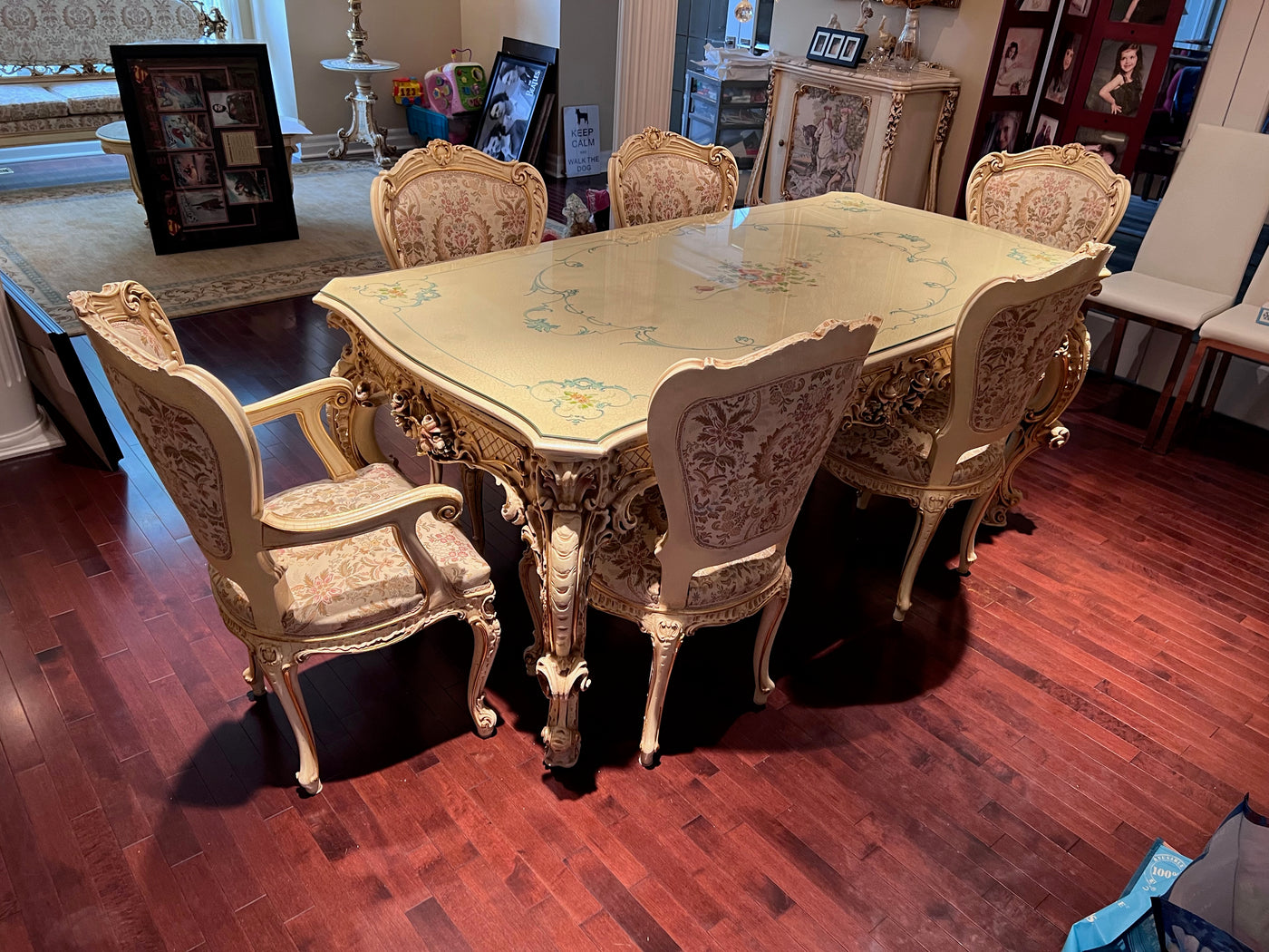 Antique French Regency White Carved Dining Table + 6 Chairs