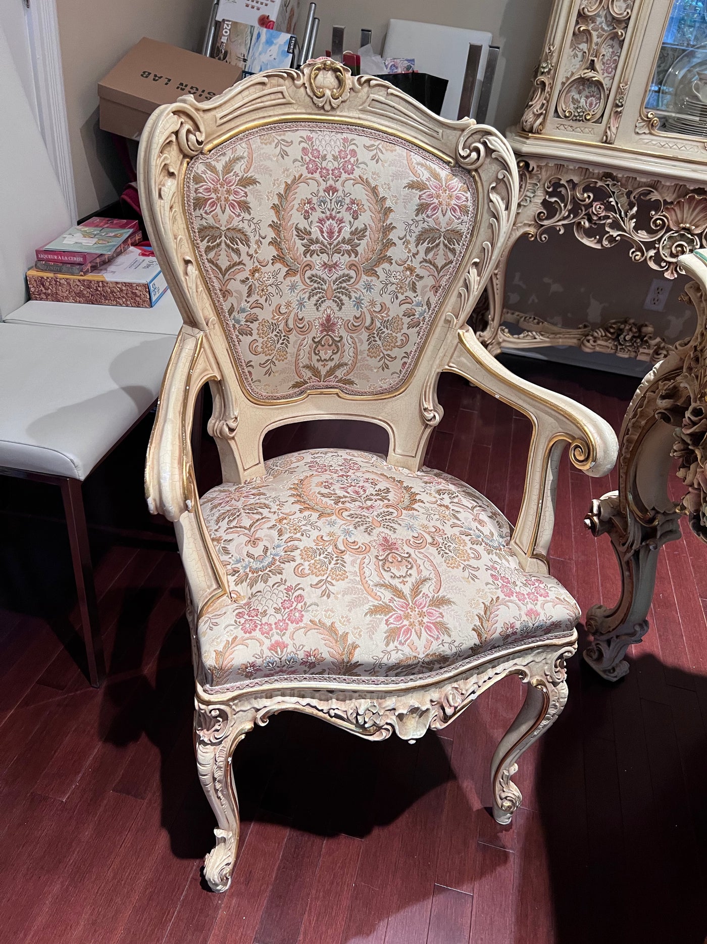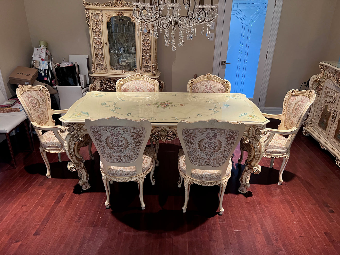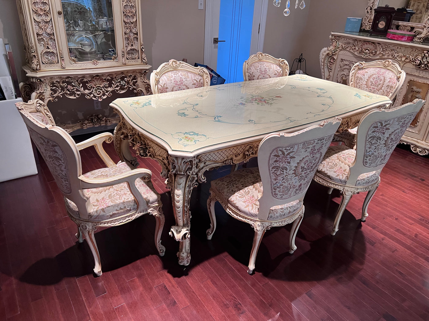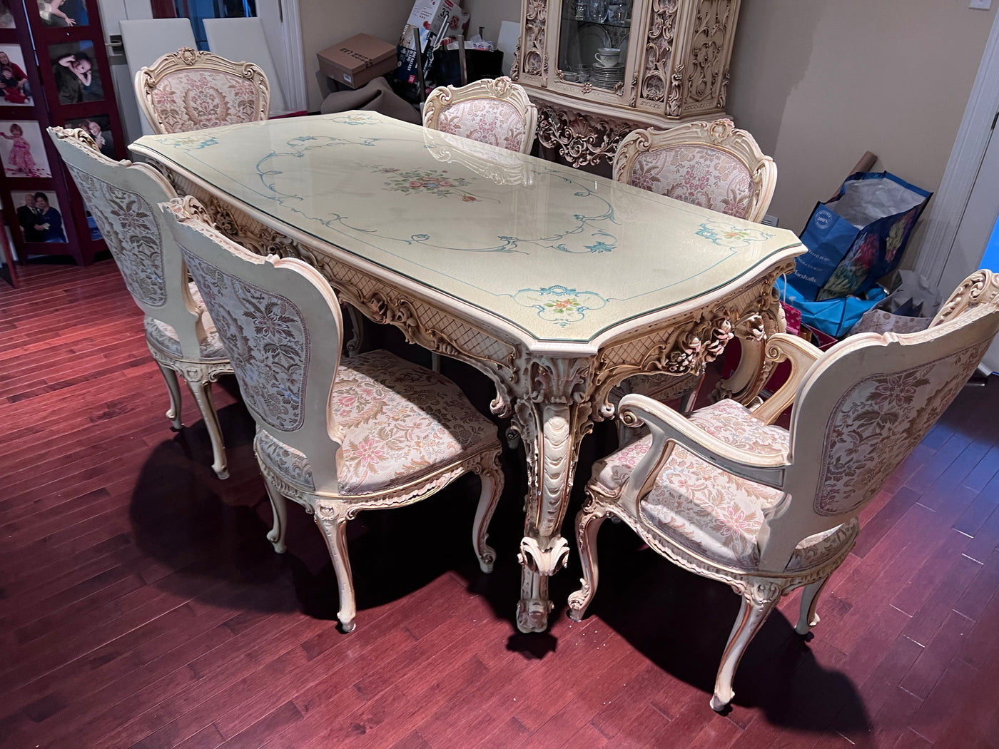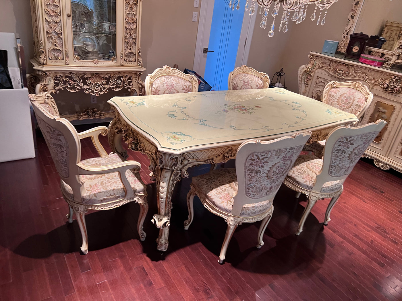 Antique French Regency White Carved Dining Table + 6 Chairs