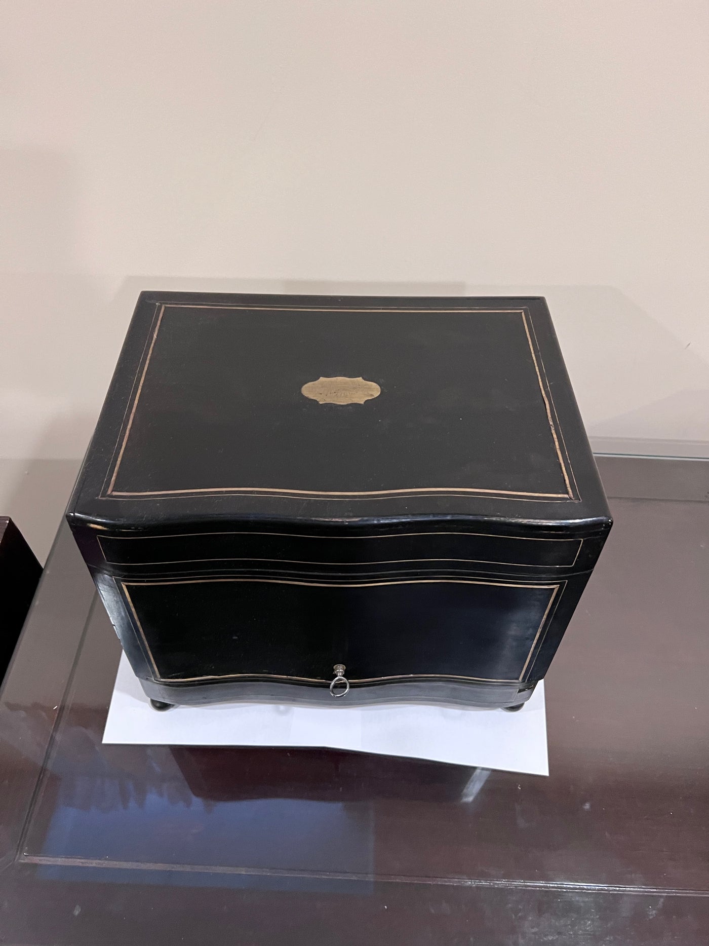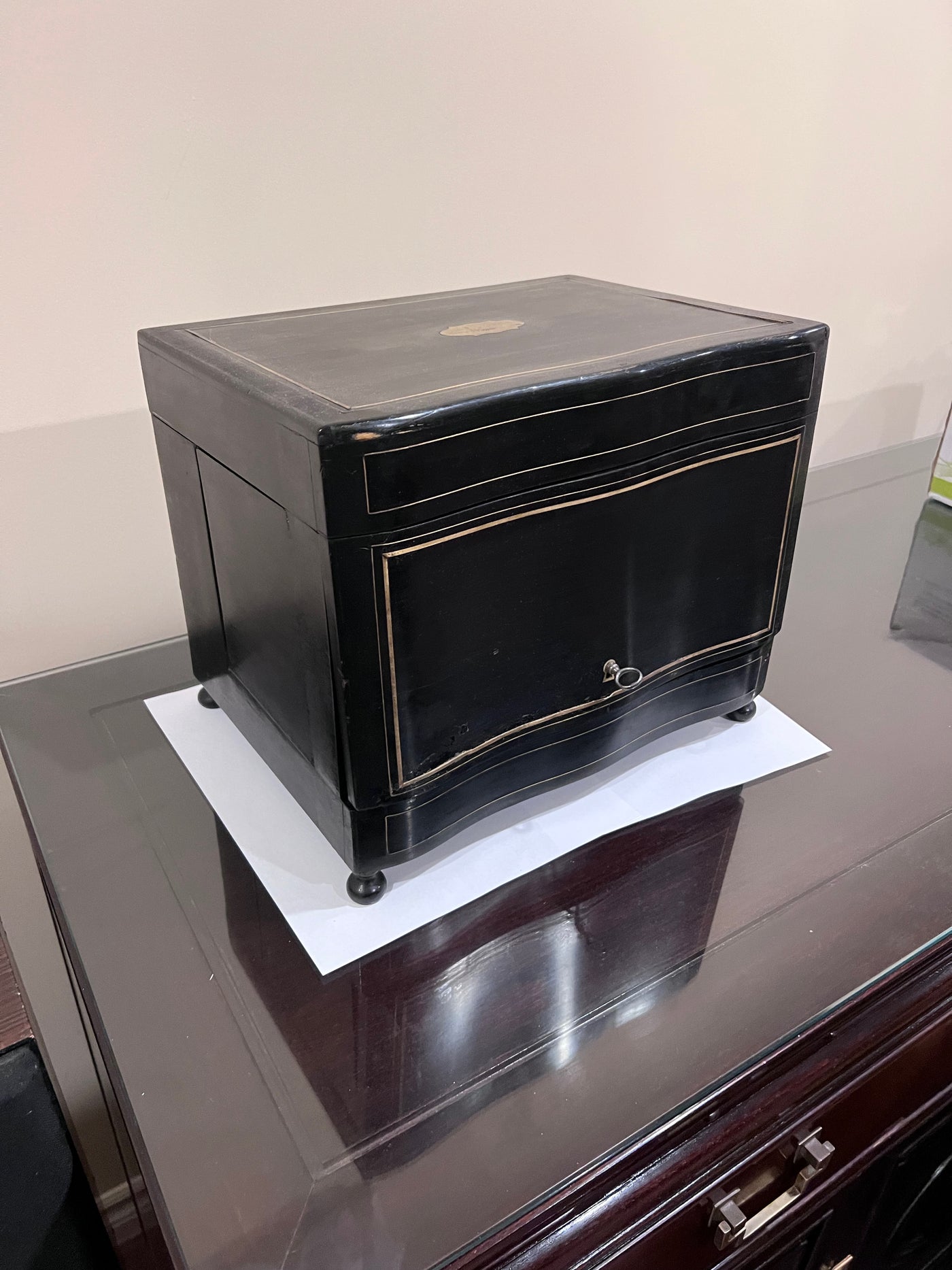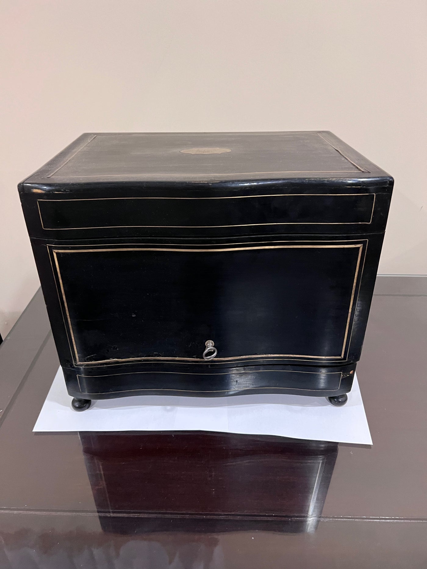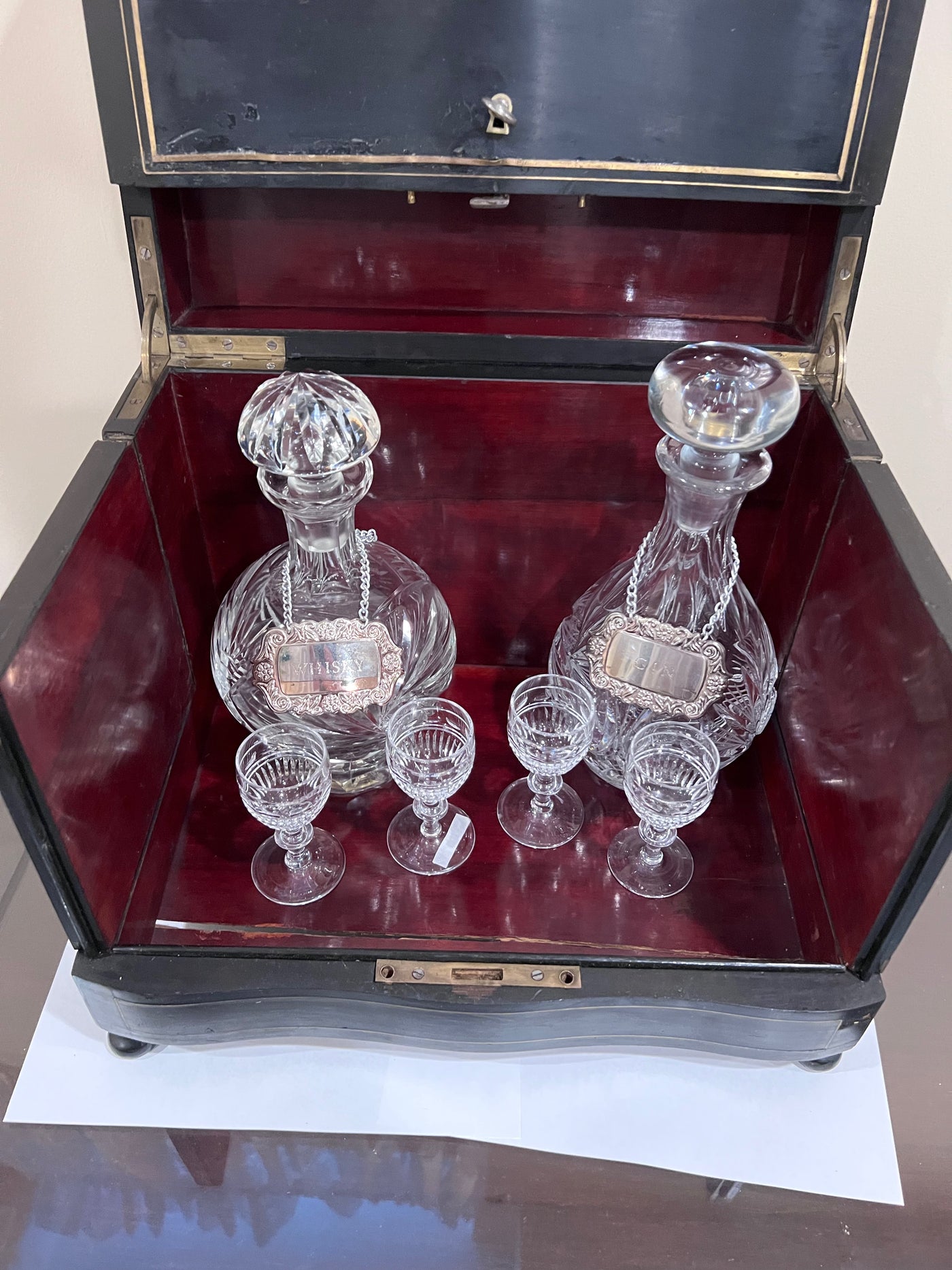 Antique Black Lacquered Table Top Bar + 2 Crystal Decanters and 4 Liqueur Glasses .