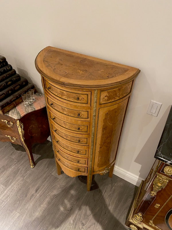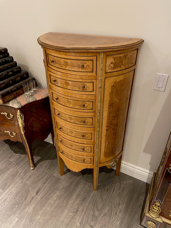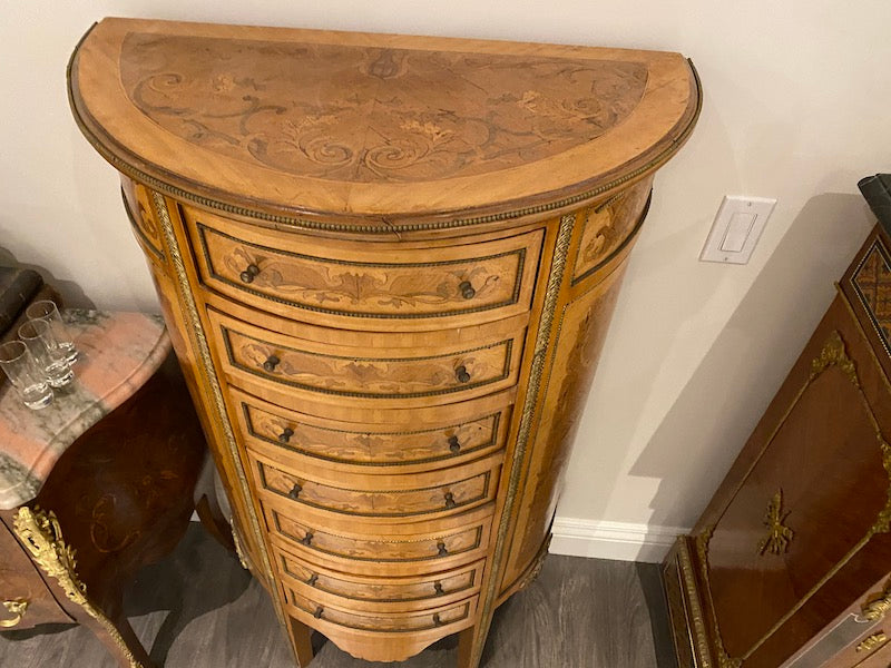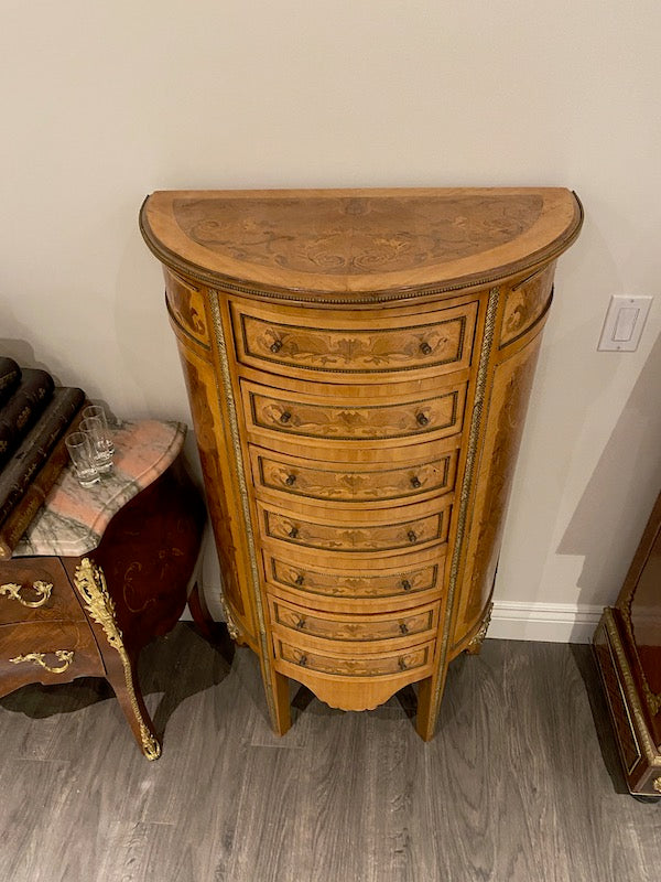 20th Century French Demilune Cabinet, 7 Drawers. Some fading on the top and the odd scratch throughout.