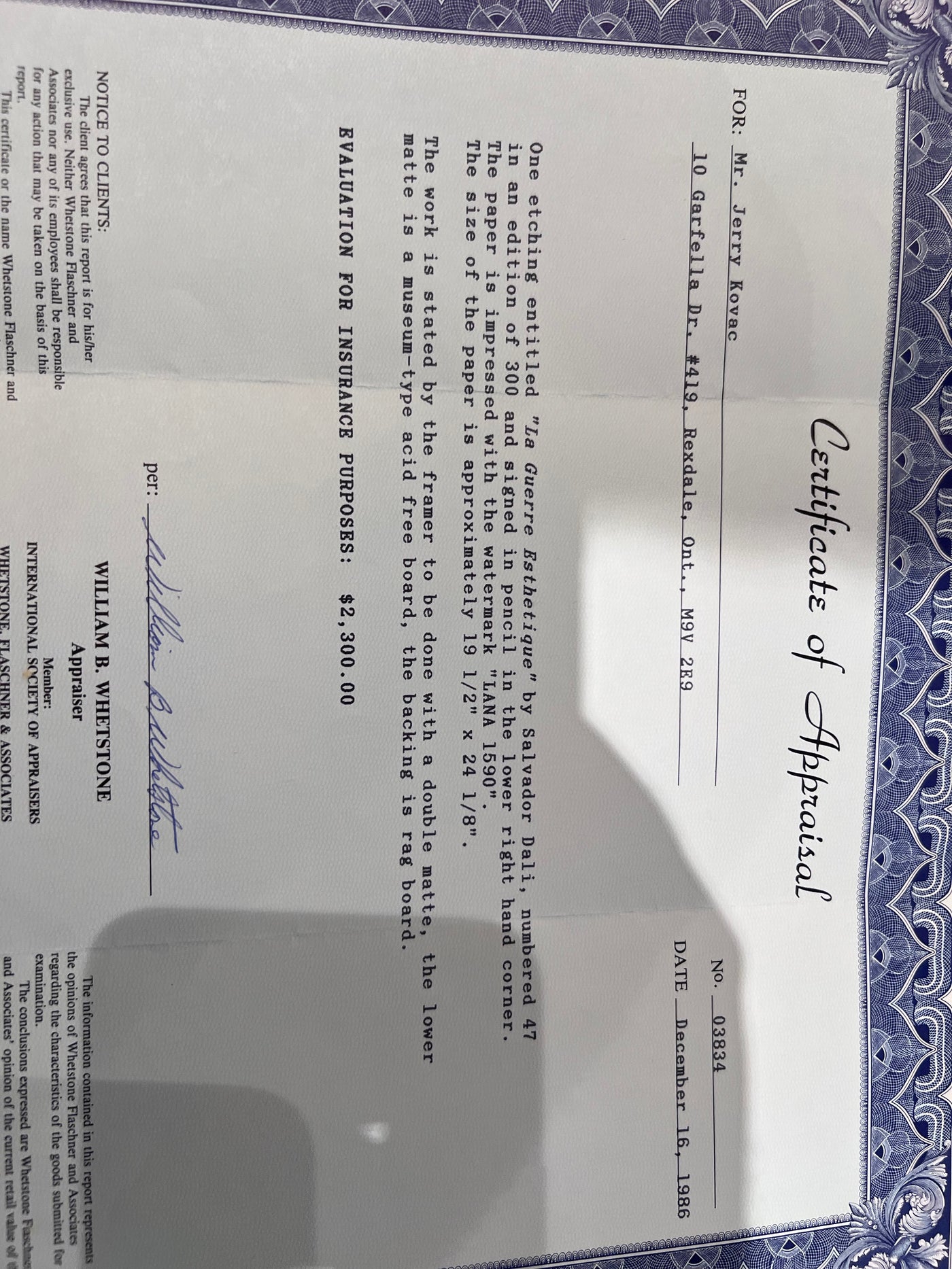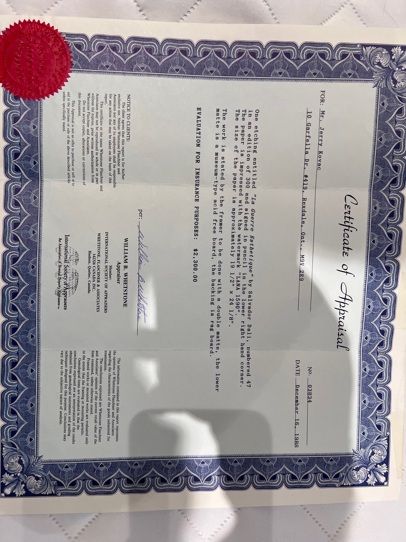 Etching entitled "La Guerre Esthetique" by Salvador Dali, numbered 47/300, Signed (Appraisal Included).