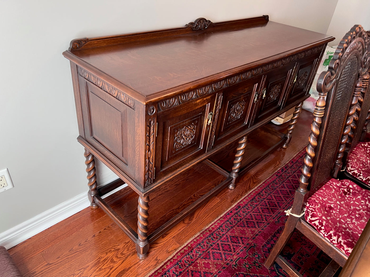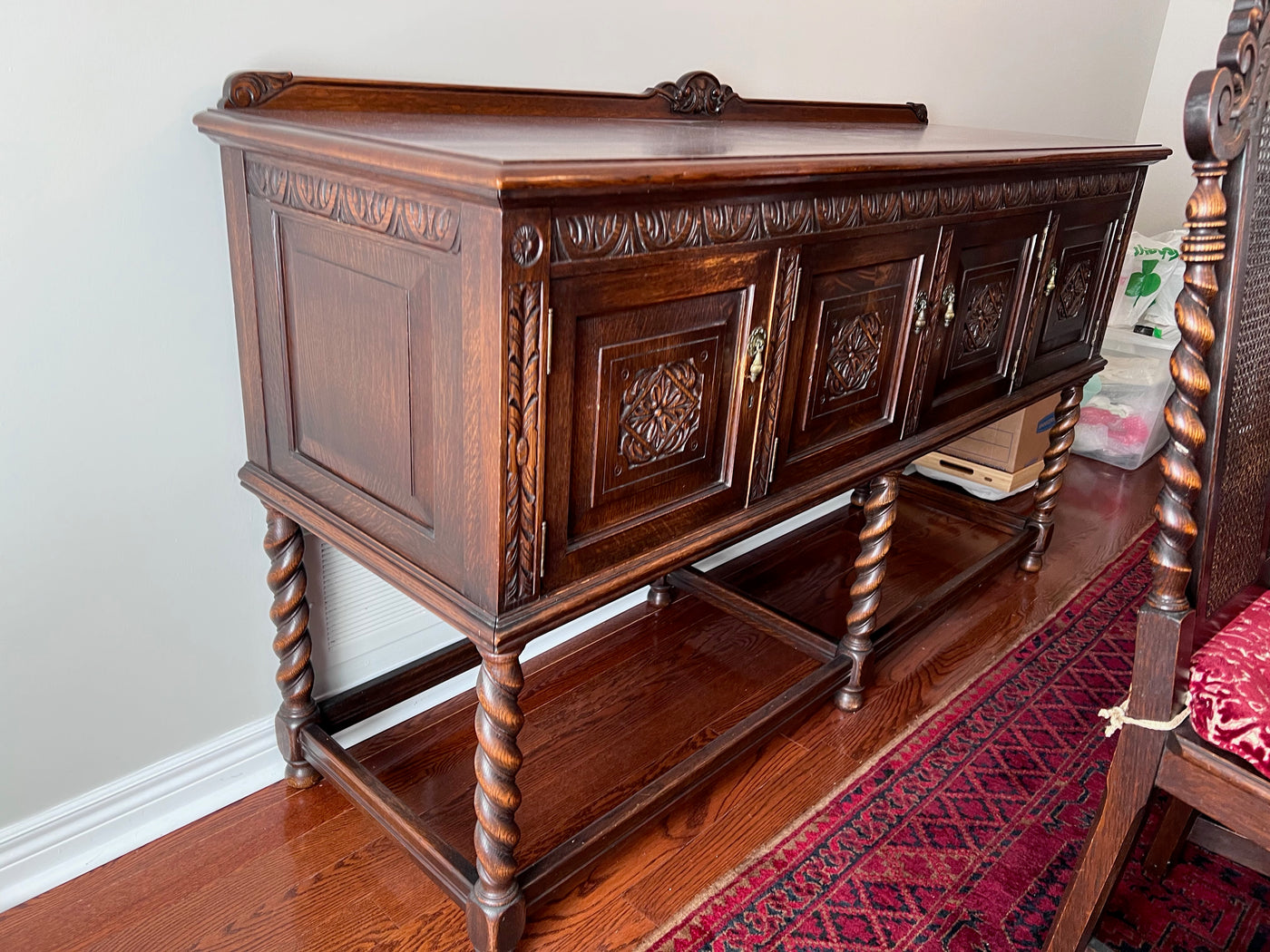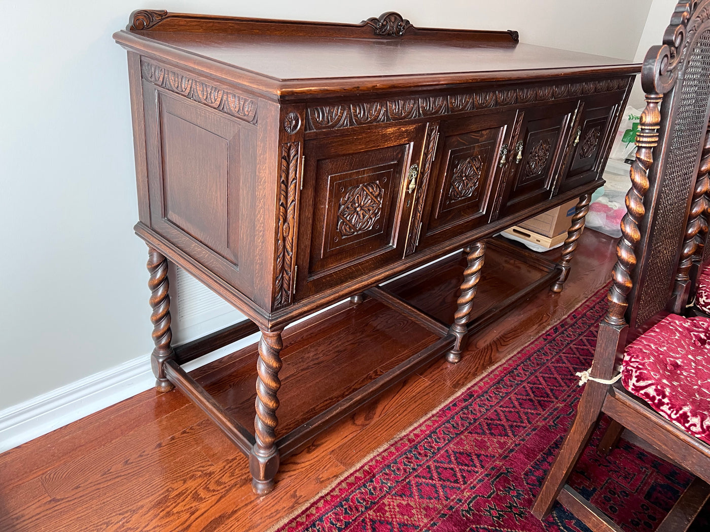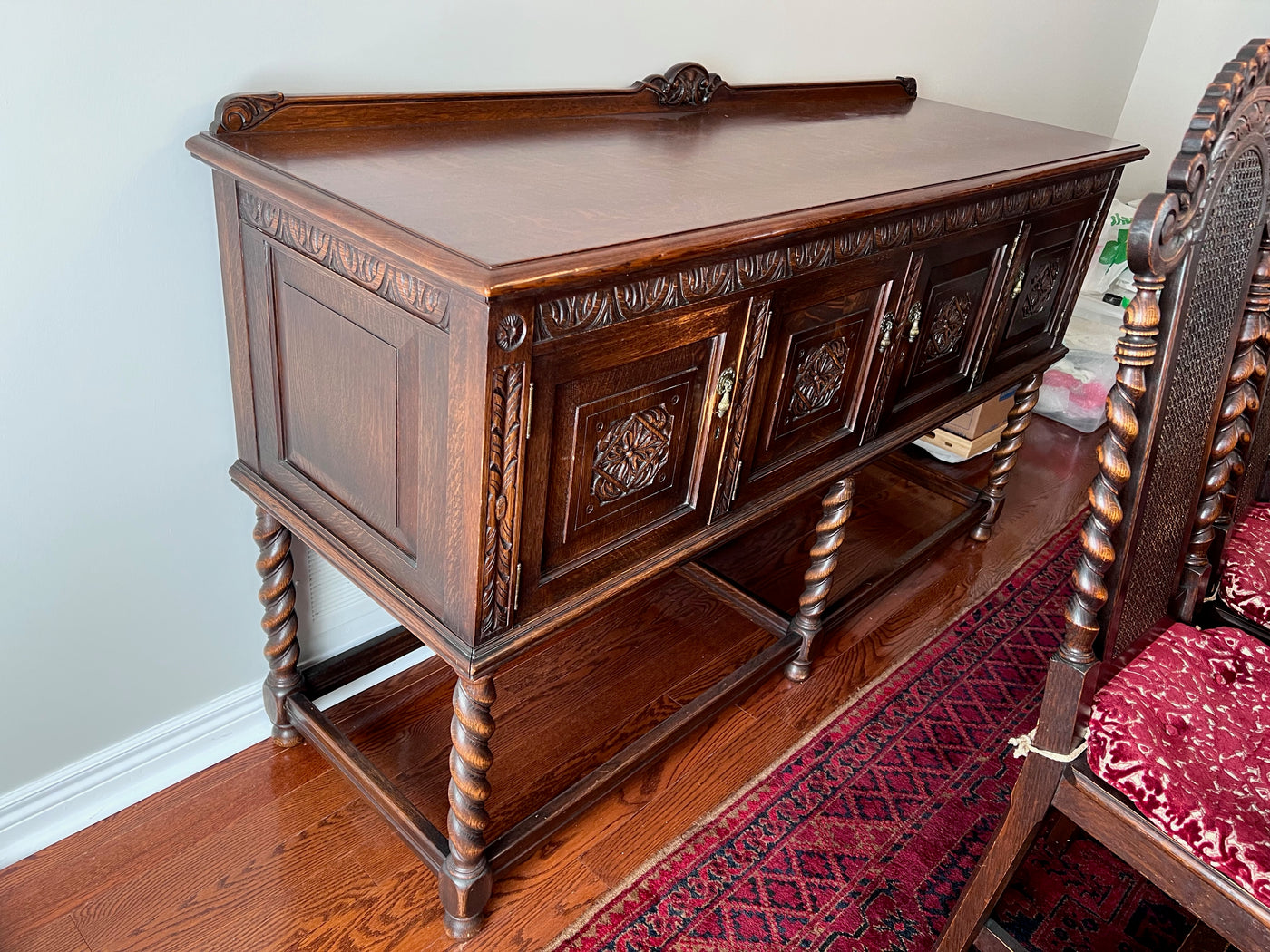 Antique Golden Oak Wood Carved, Barley Twist Sideboard.