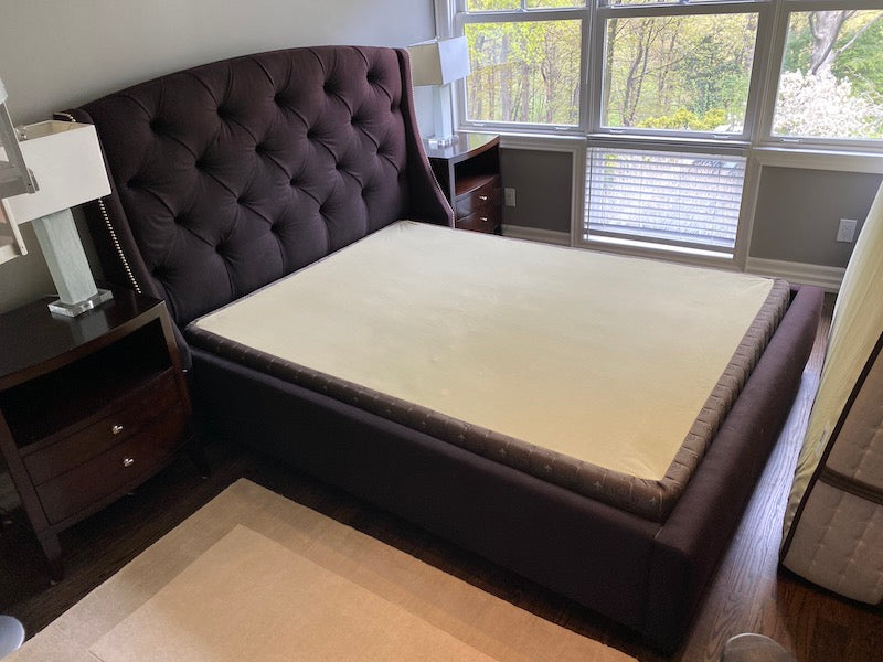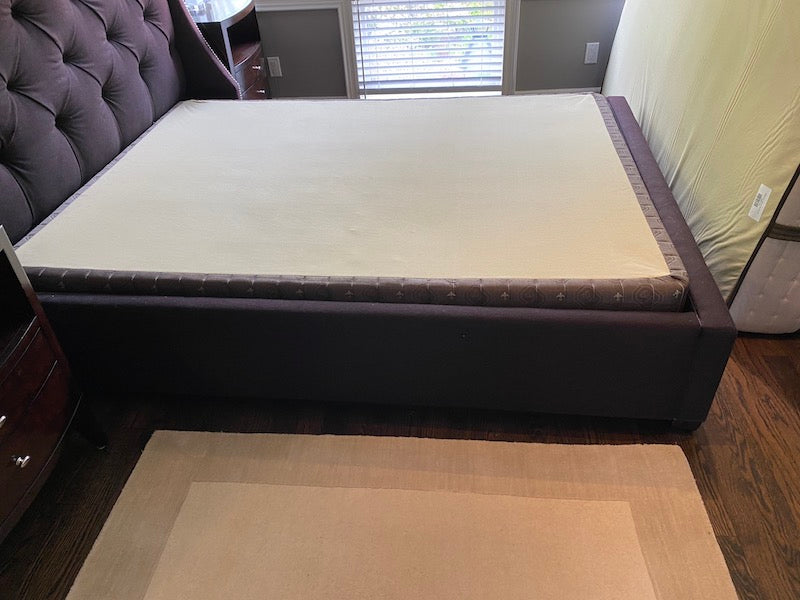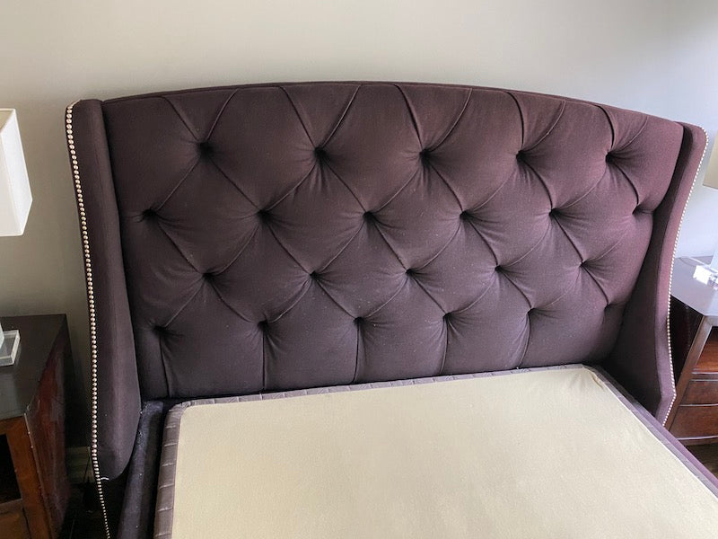 Queen Dark Brown Upholstered Bed Frame. Tufted headboard with a chrome studded trim. *box spring NOT included.