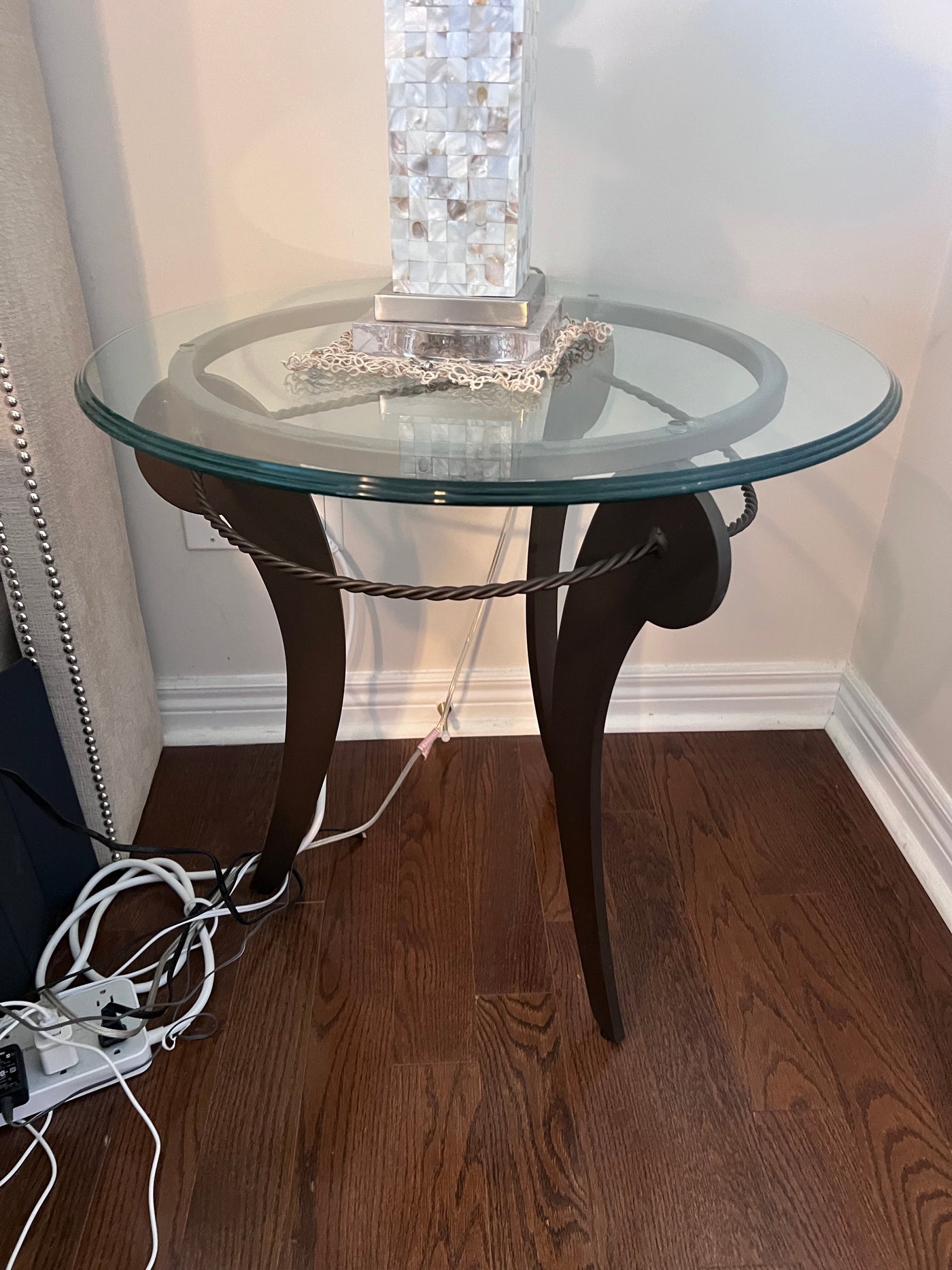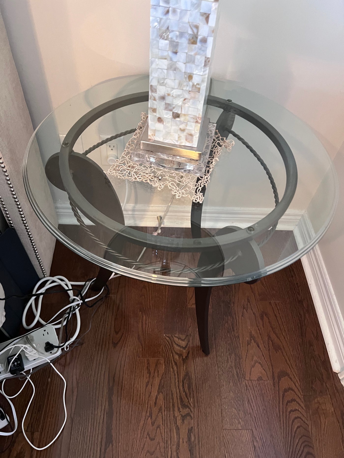 Pair of Round Glass Top, Wrought Iron Base Side Tables