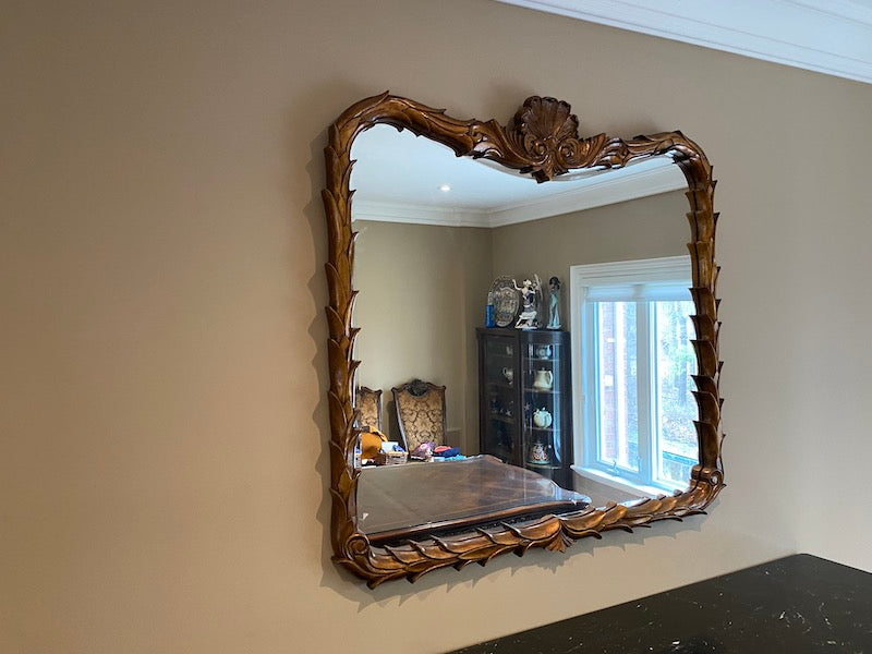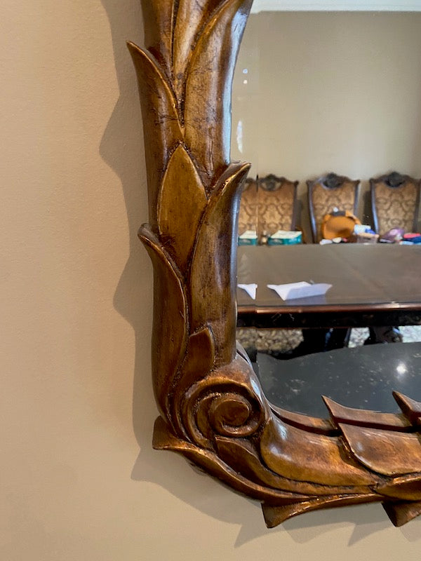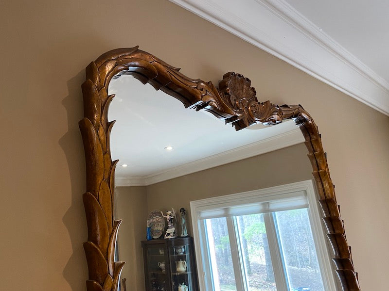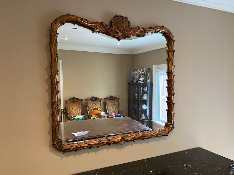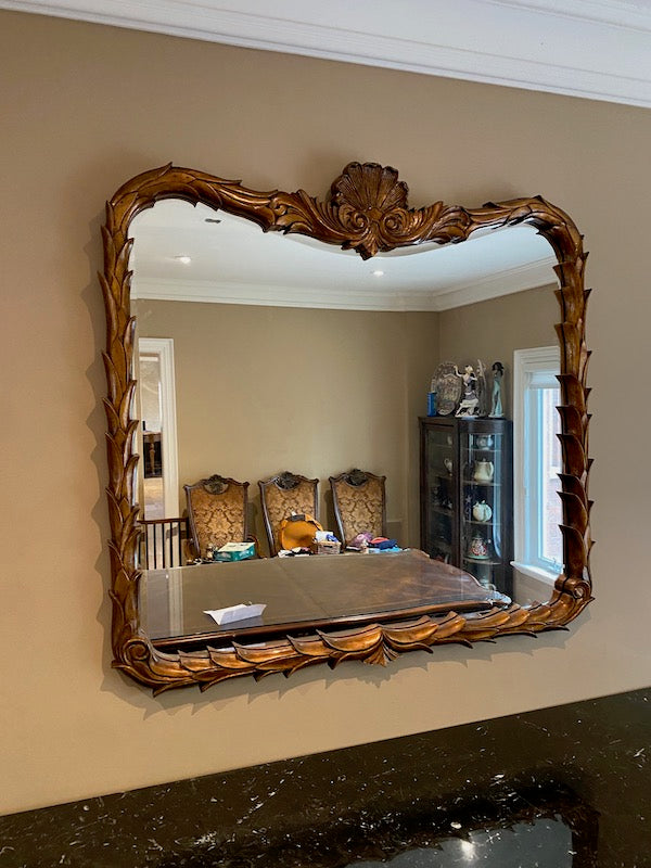 Large Ornate Wood Carved Mirror. Gold painted wood/resin frame. Heavy duty mirror!