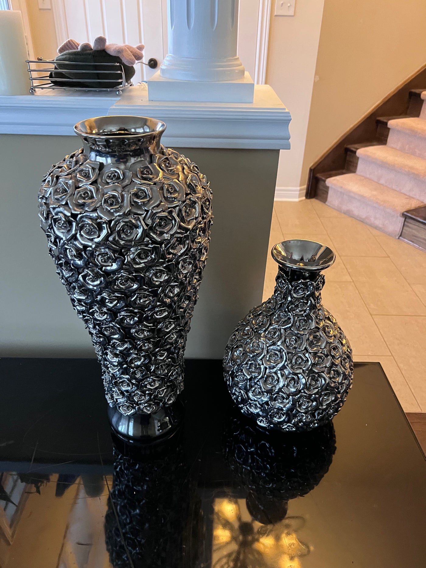 Pair of Ornate Silver 'Roses" Vases Imported from South Africa.