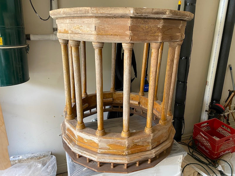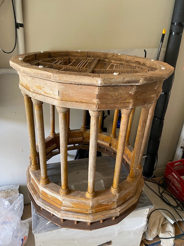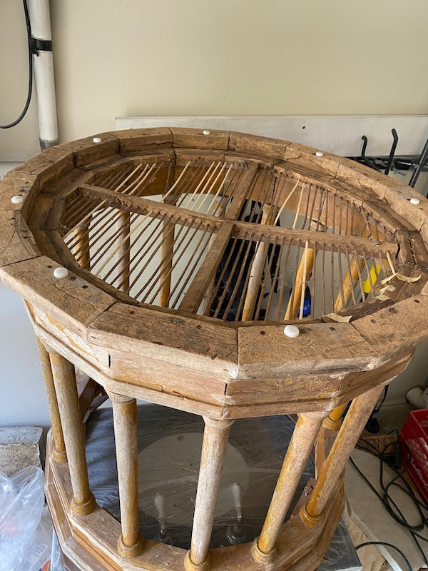 Antique Bird Cage. Some wear and marks on the wood throughout. In good condition overall relative to age.