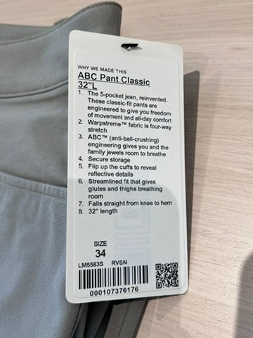 BRAND NEW Men's Lululemon Commission Pant Slim, 34" waist 32"L, Riverstone (*retail $138).