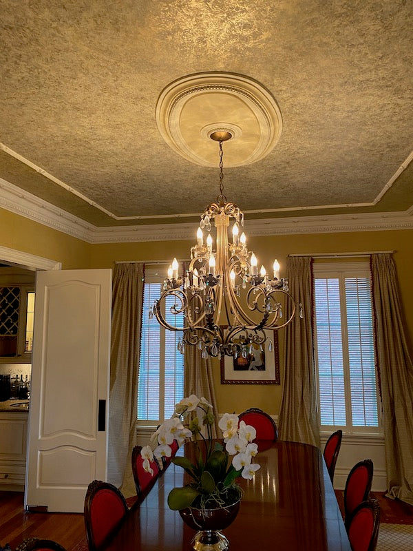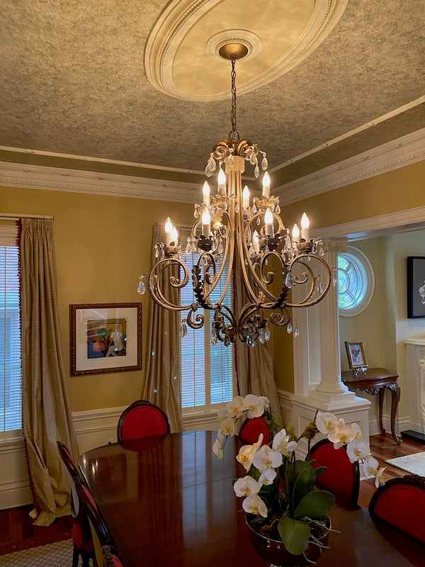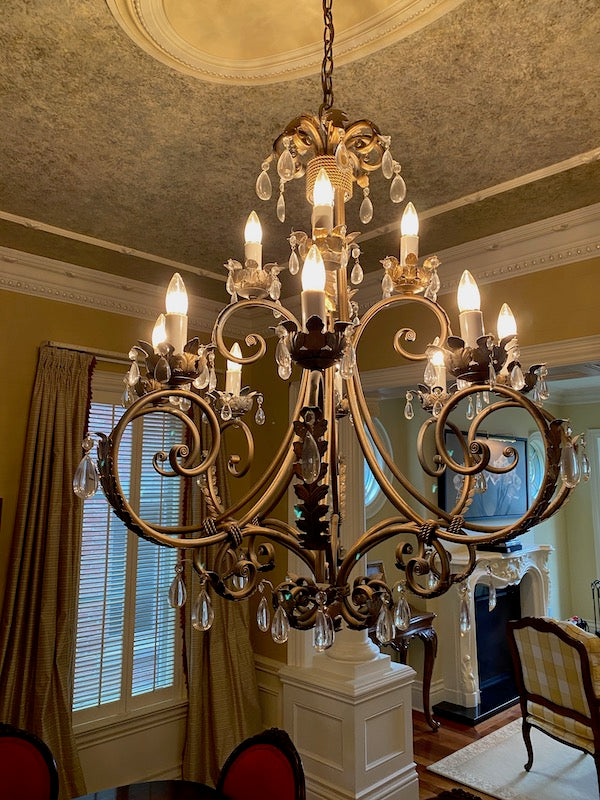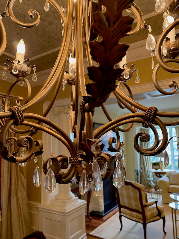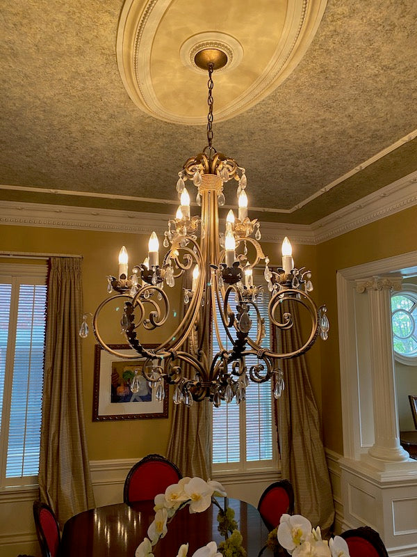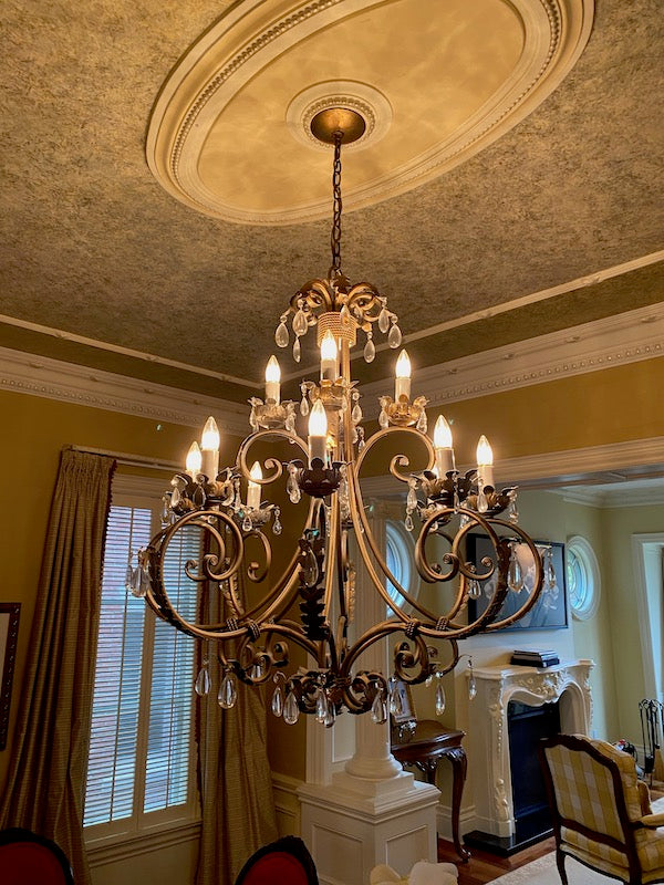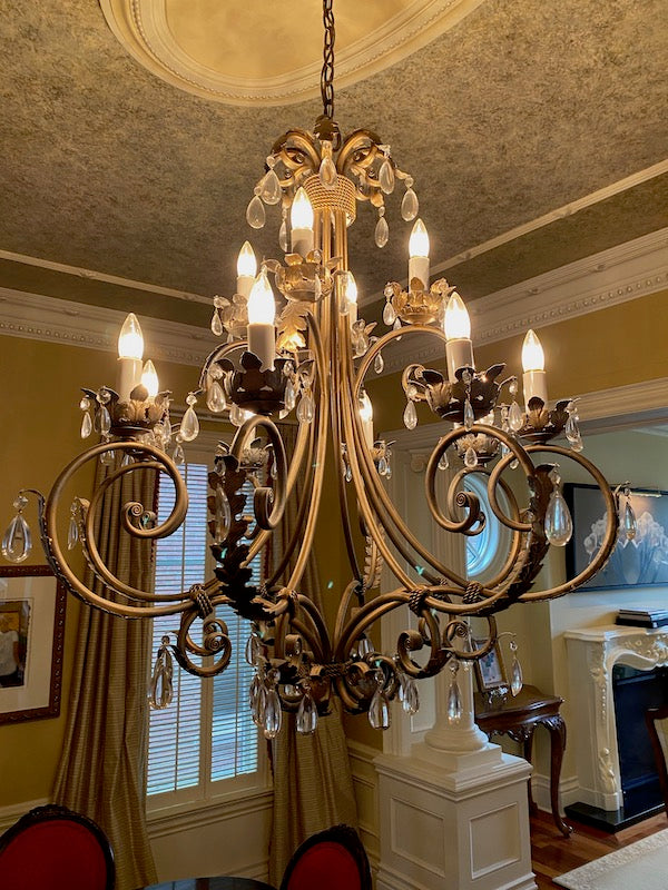 Gold Metal Chandelier with 12 Lights & Glass Pendants.