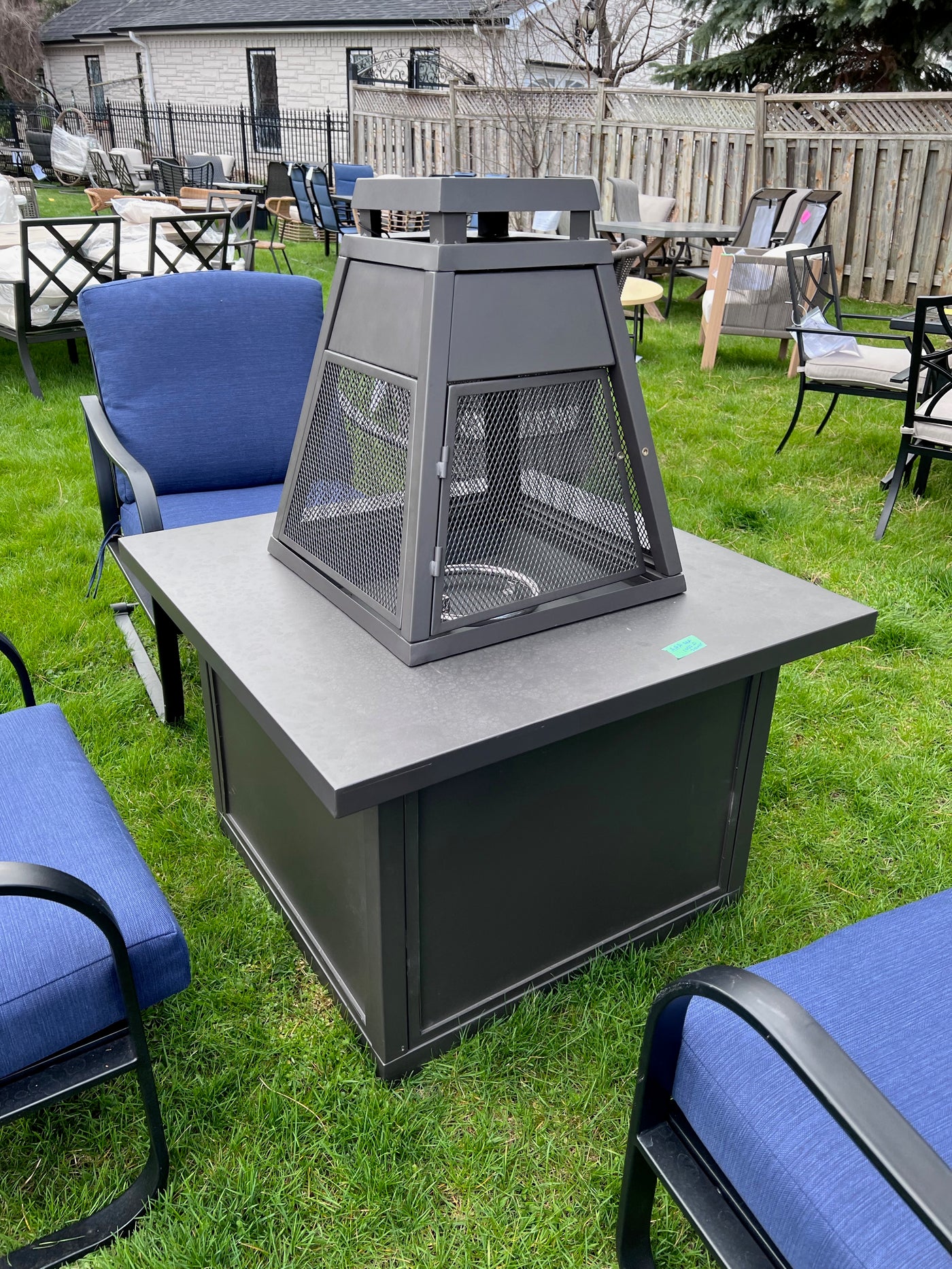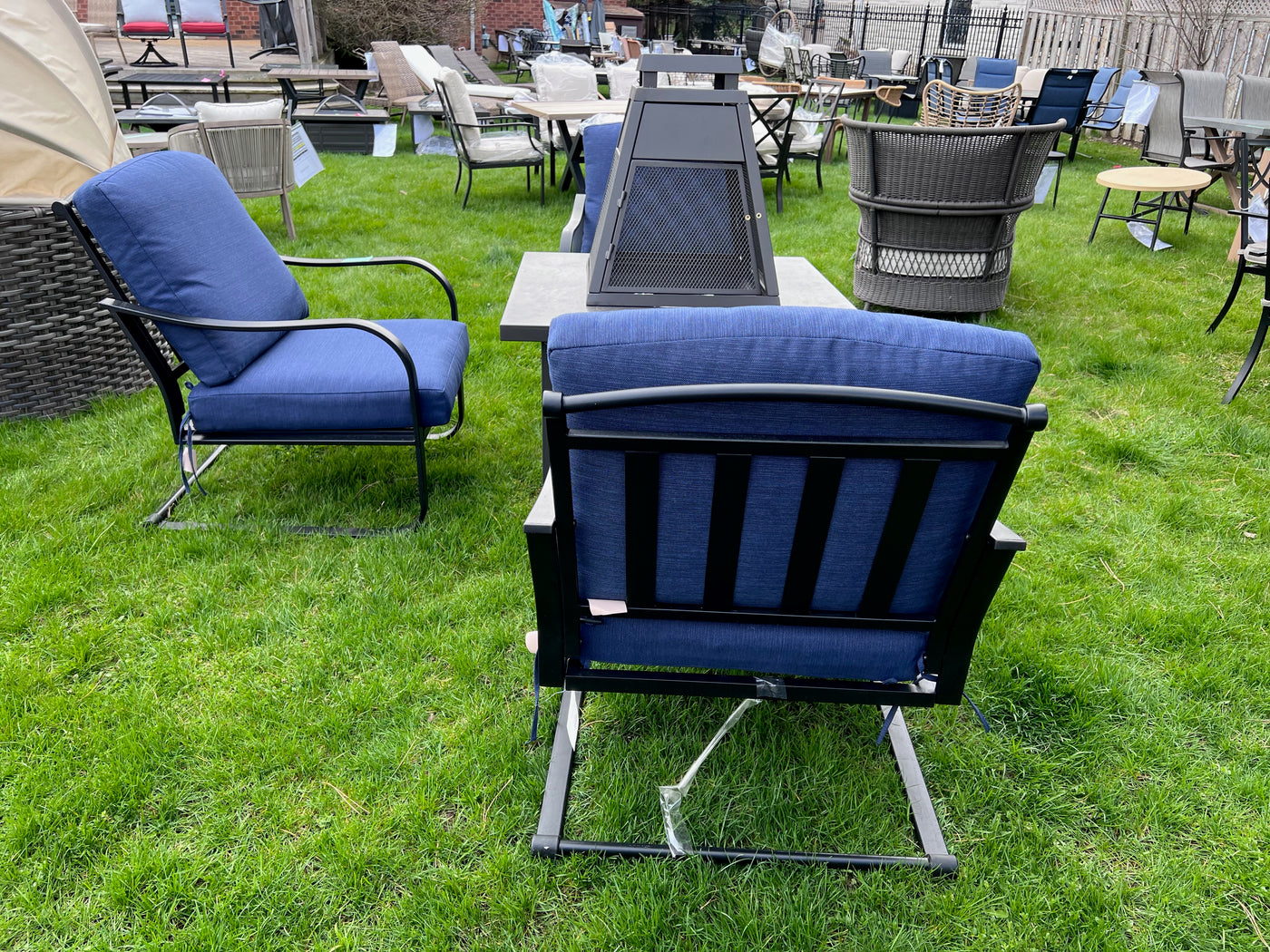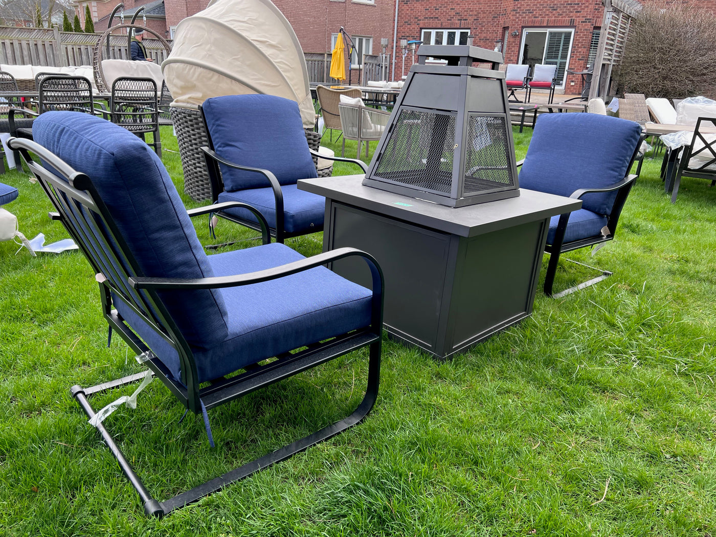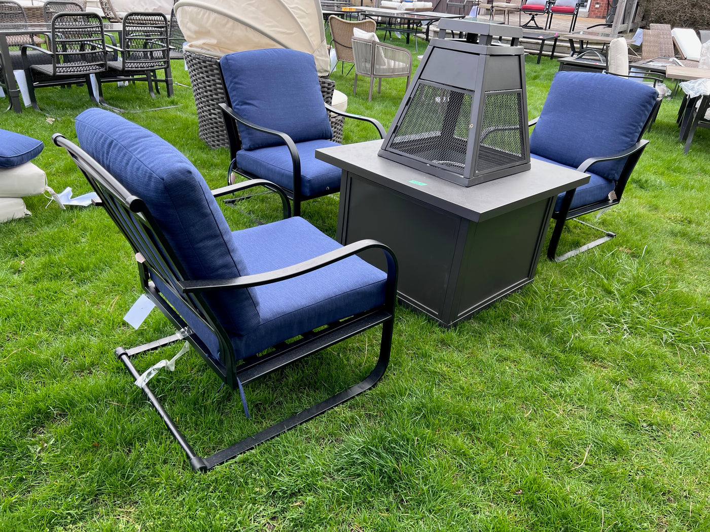 3 Chairs with Blue Cushions + Propane Fire Pit.