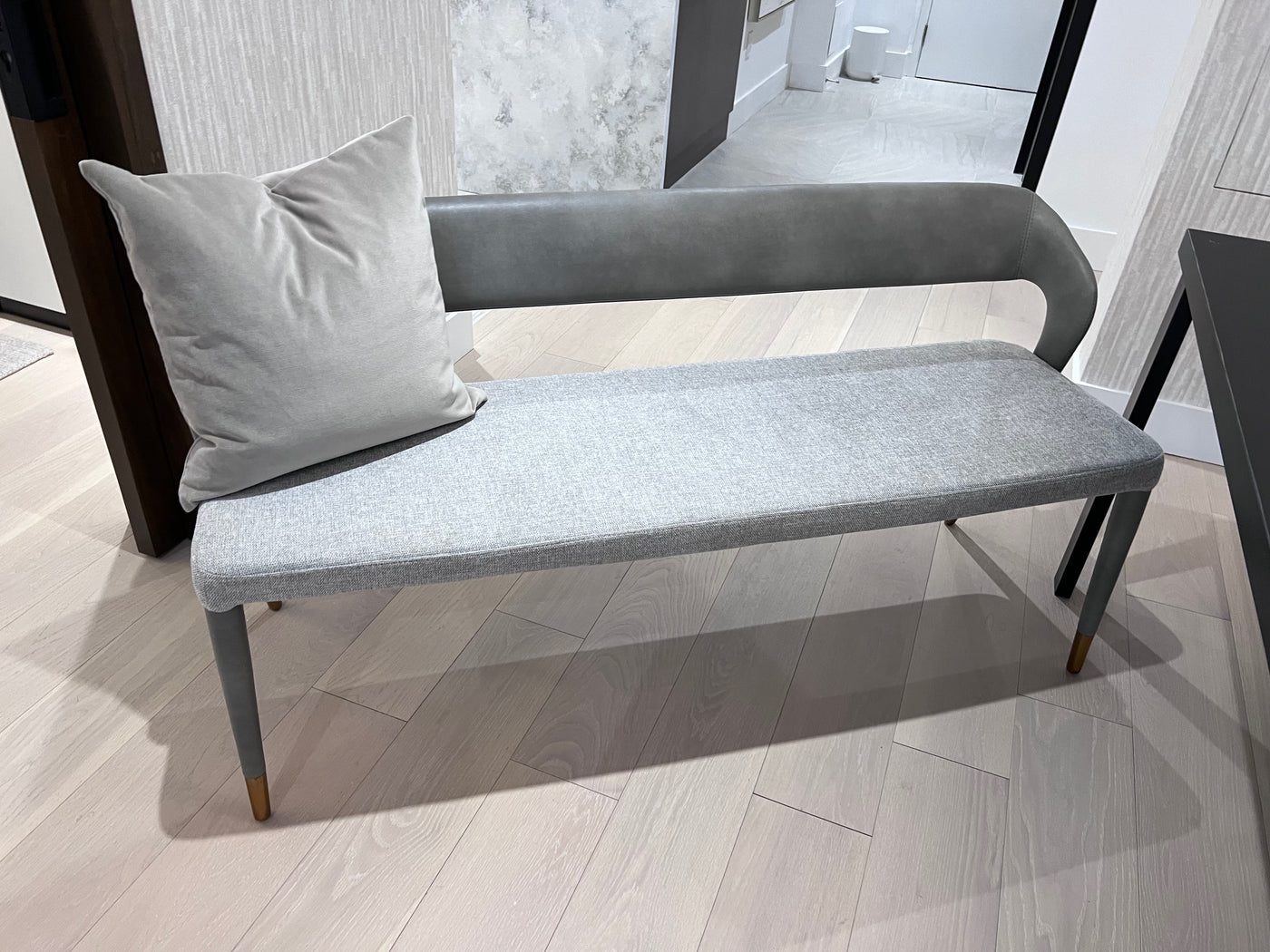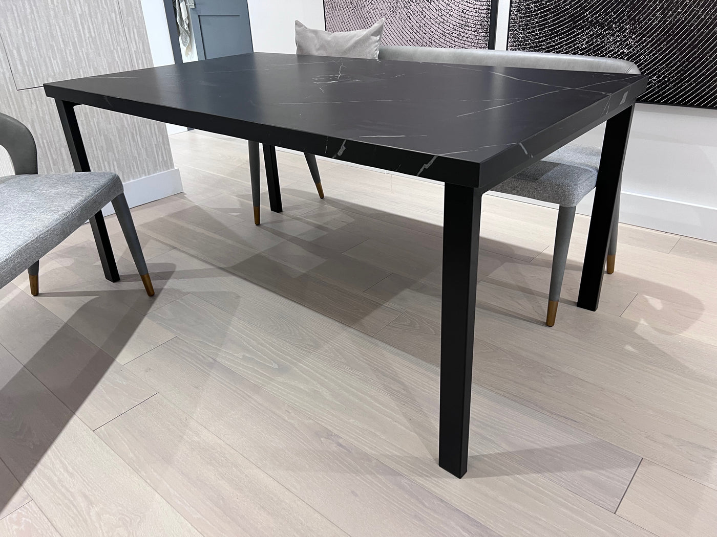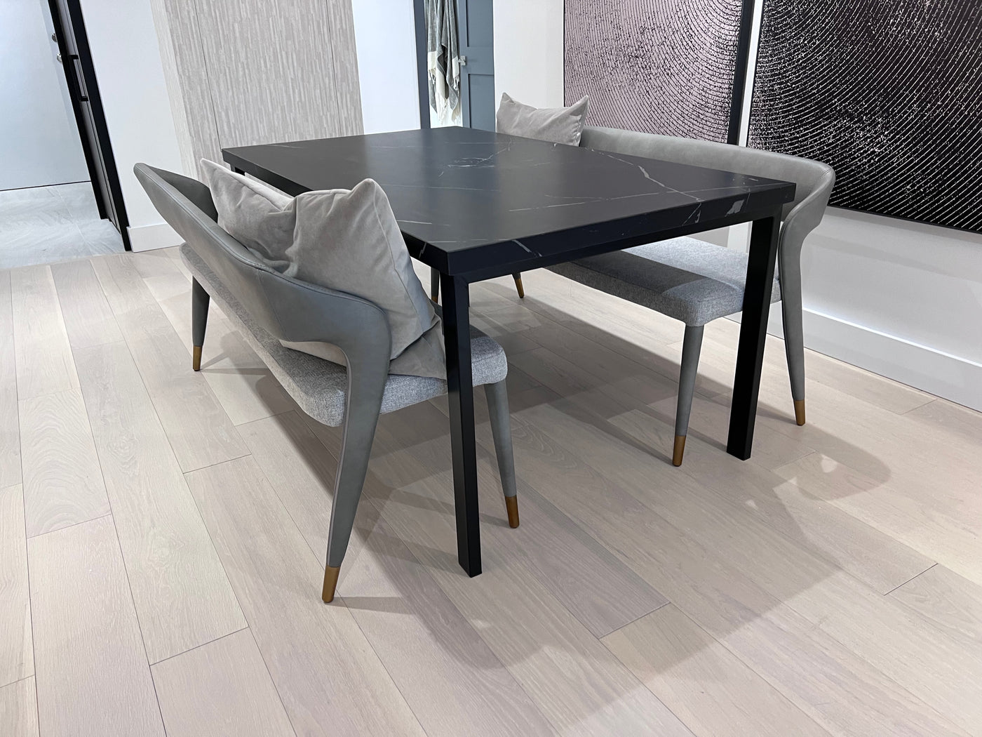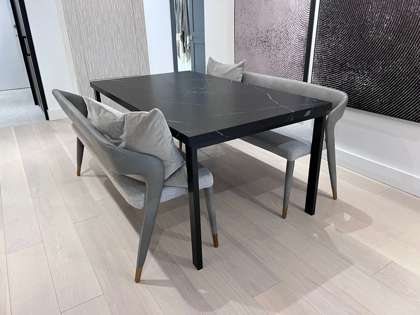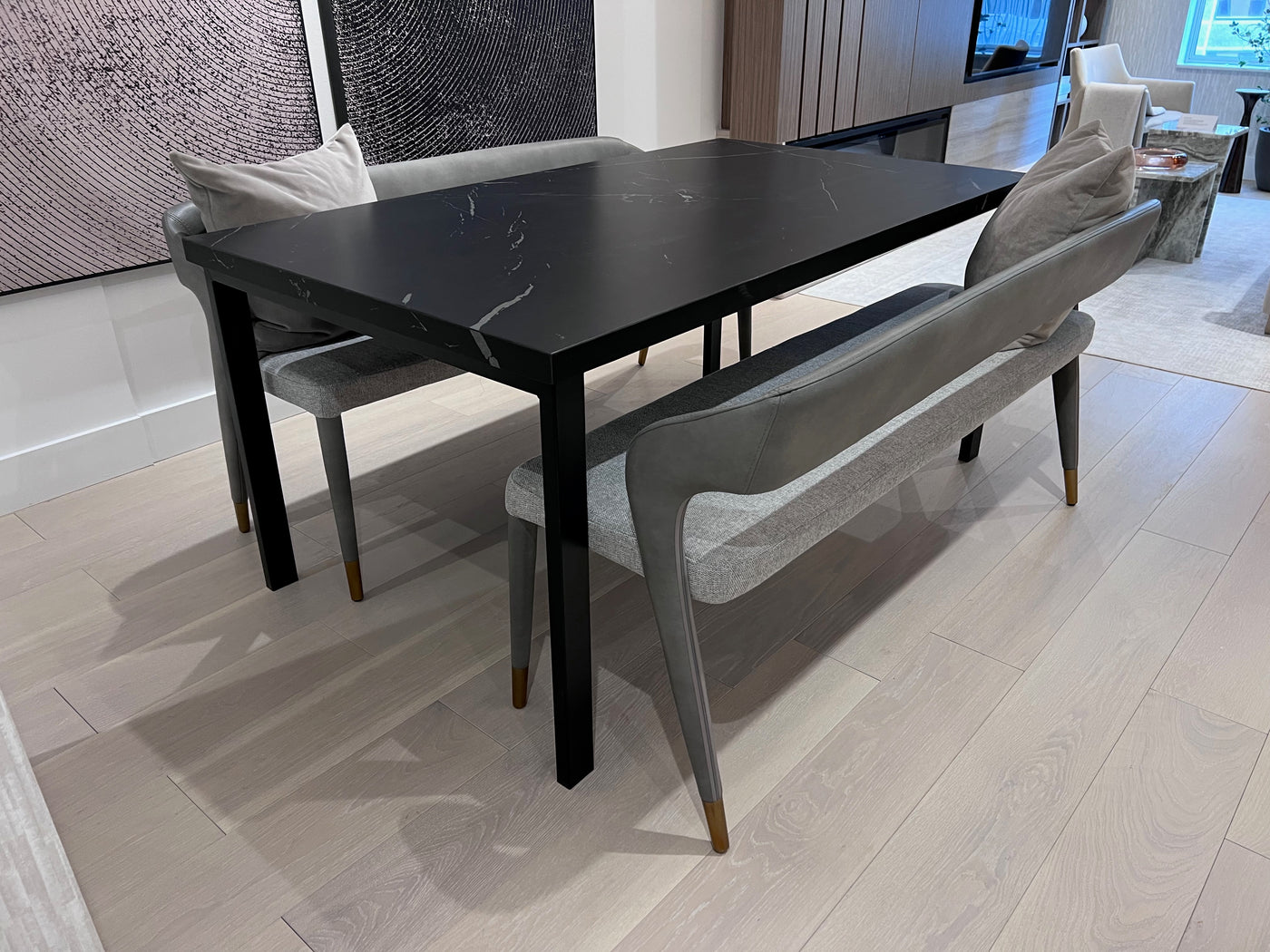 Custom Made Black Porcelain Top Dining Table, with 2 Sunpan Madura Banquettes in Belfast Heather Grey/Bravo Metal (*Retail value $6,400).