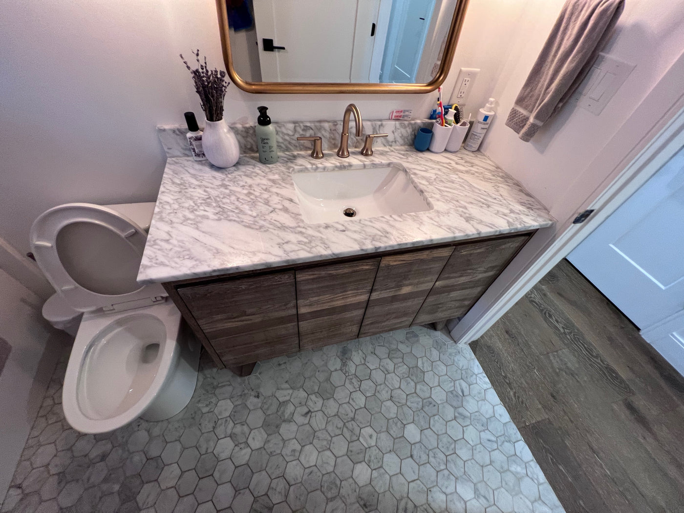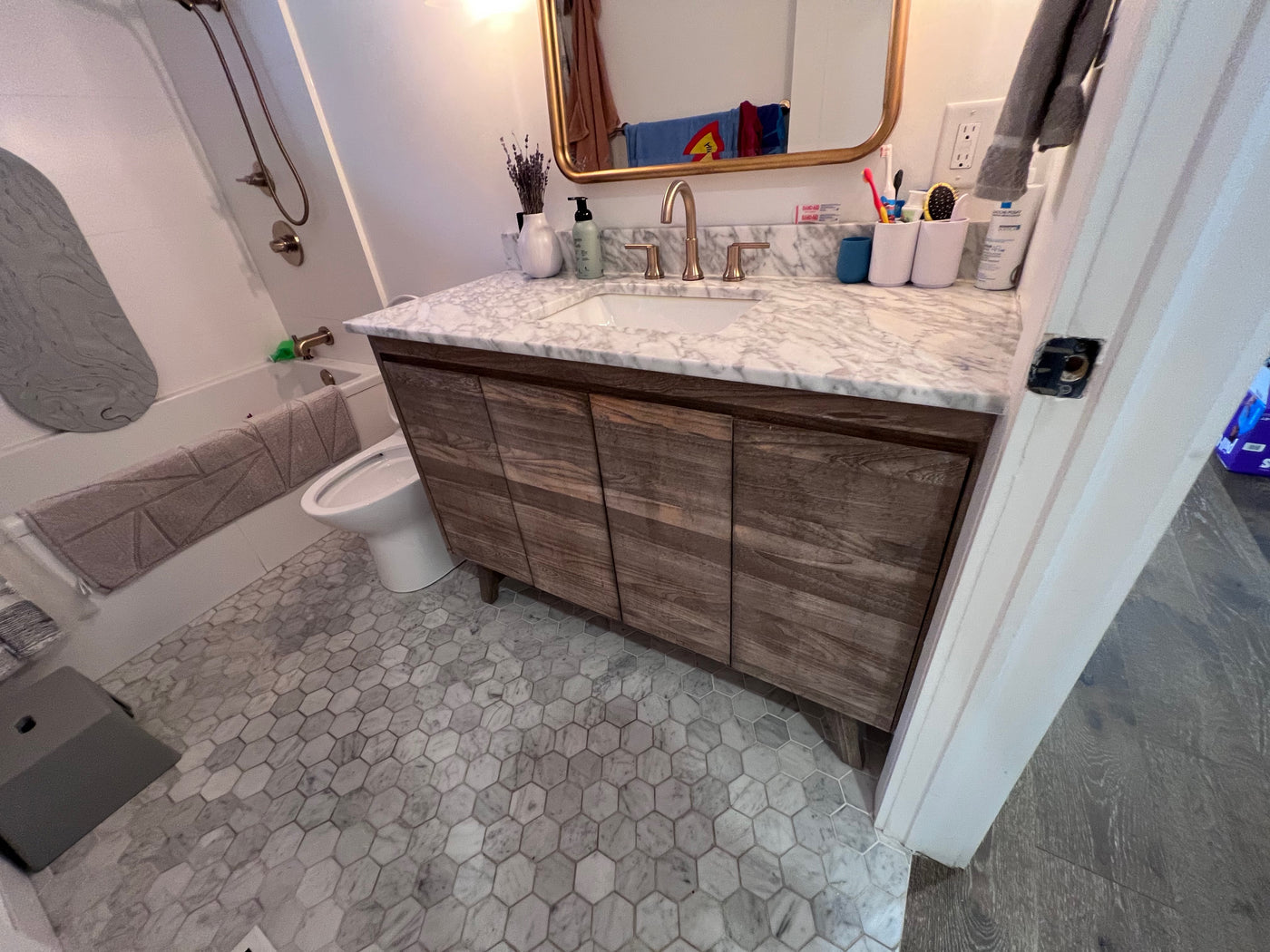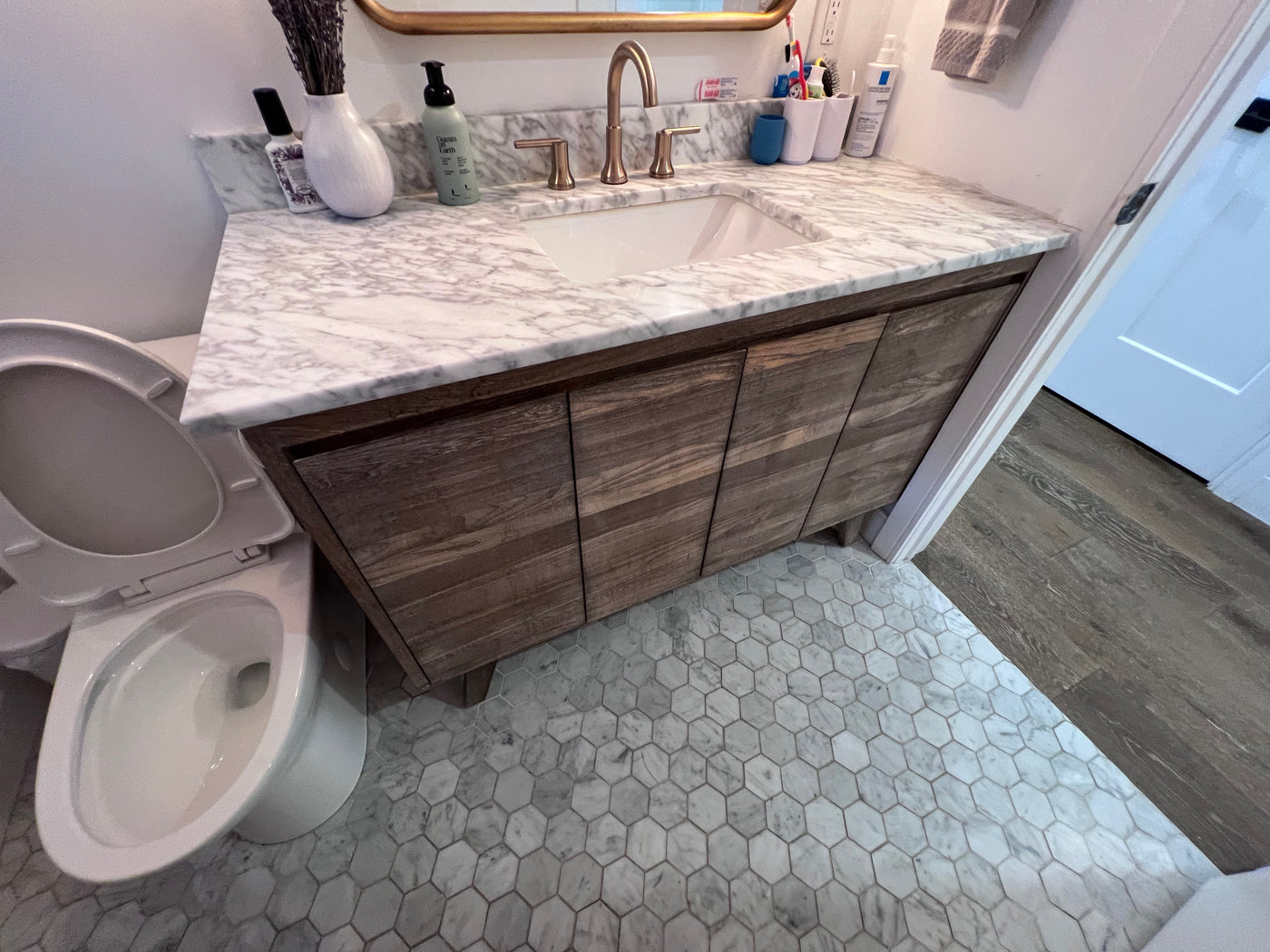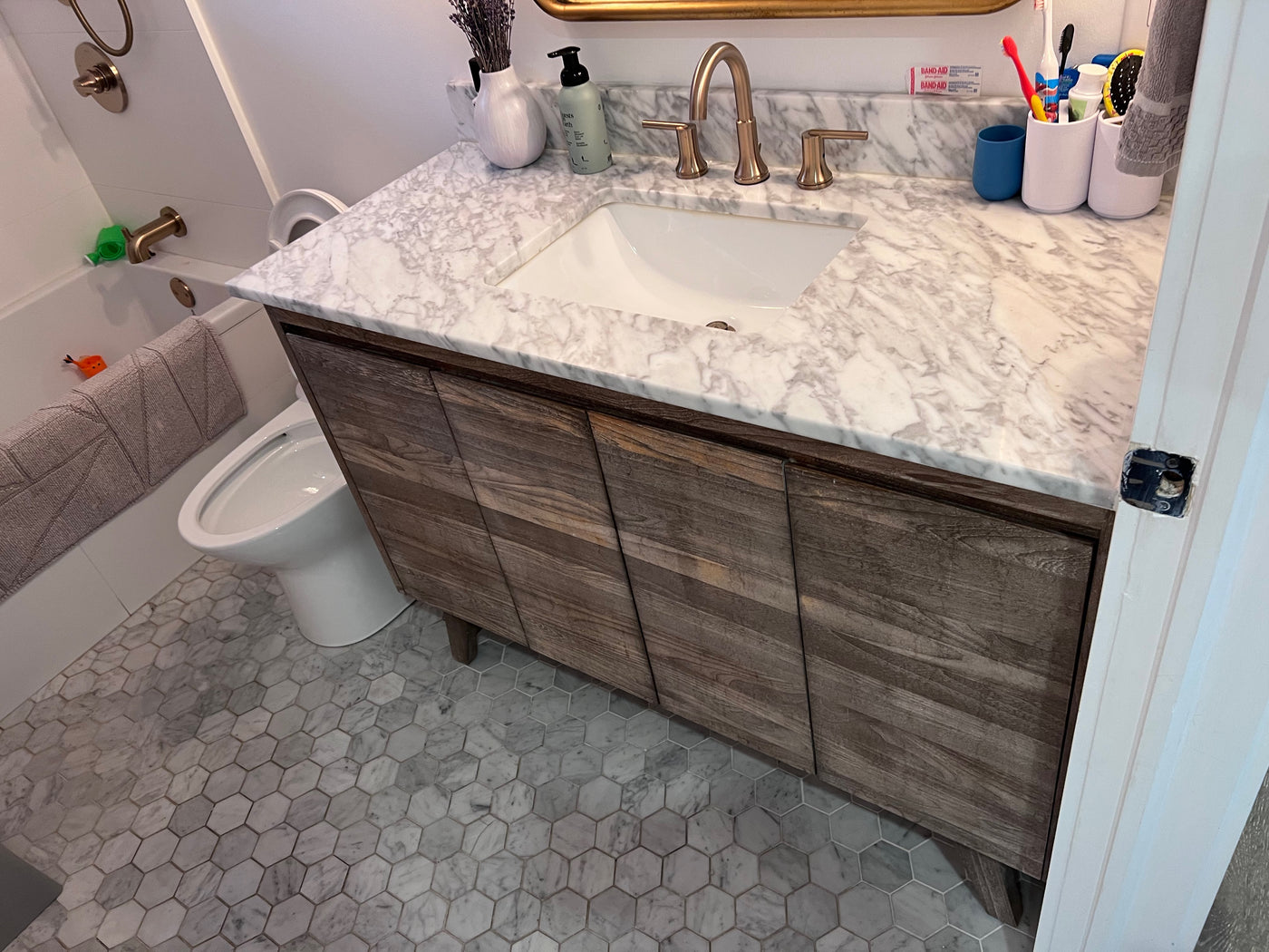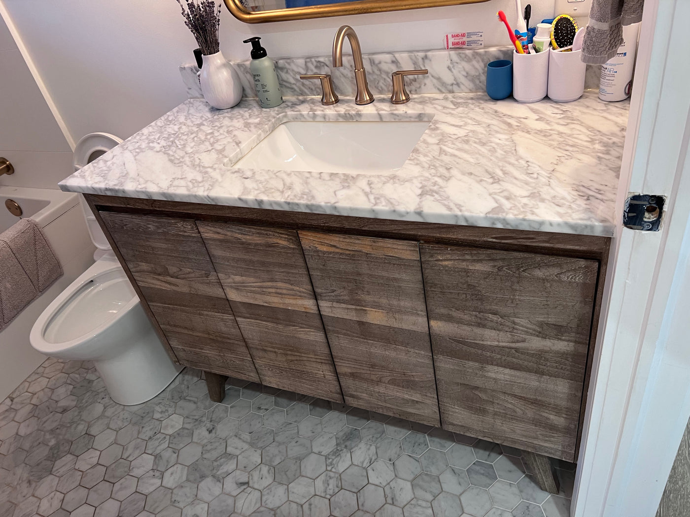 49" Vanity- Single Sink- Grey Teak, Carrara Marble (*Retail $2995).