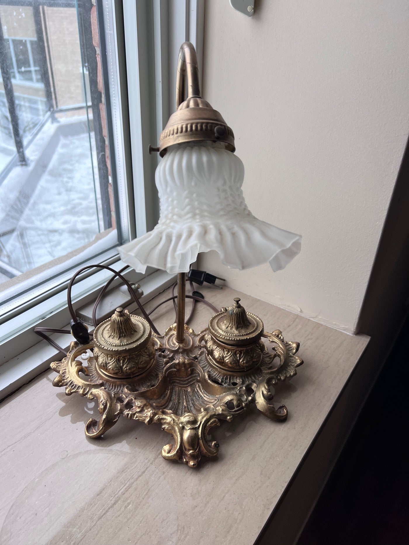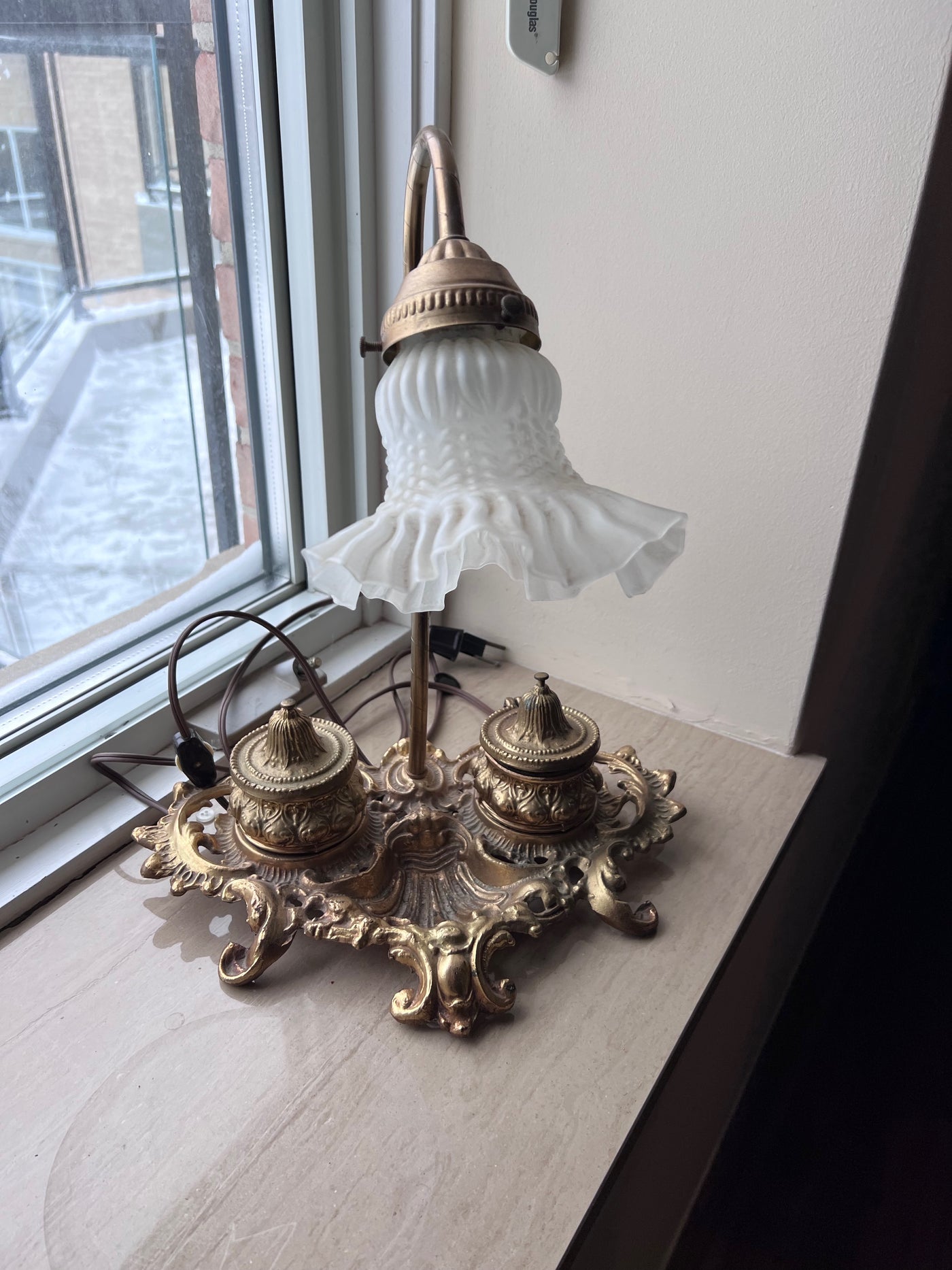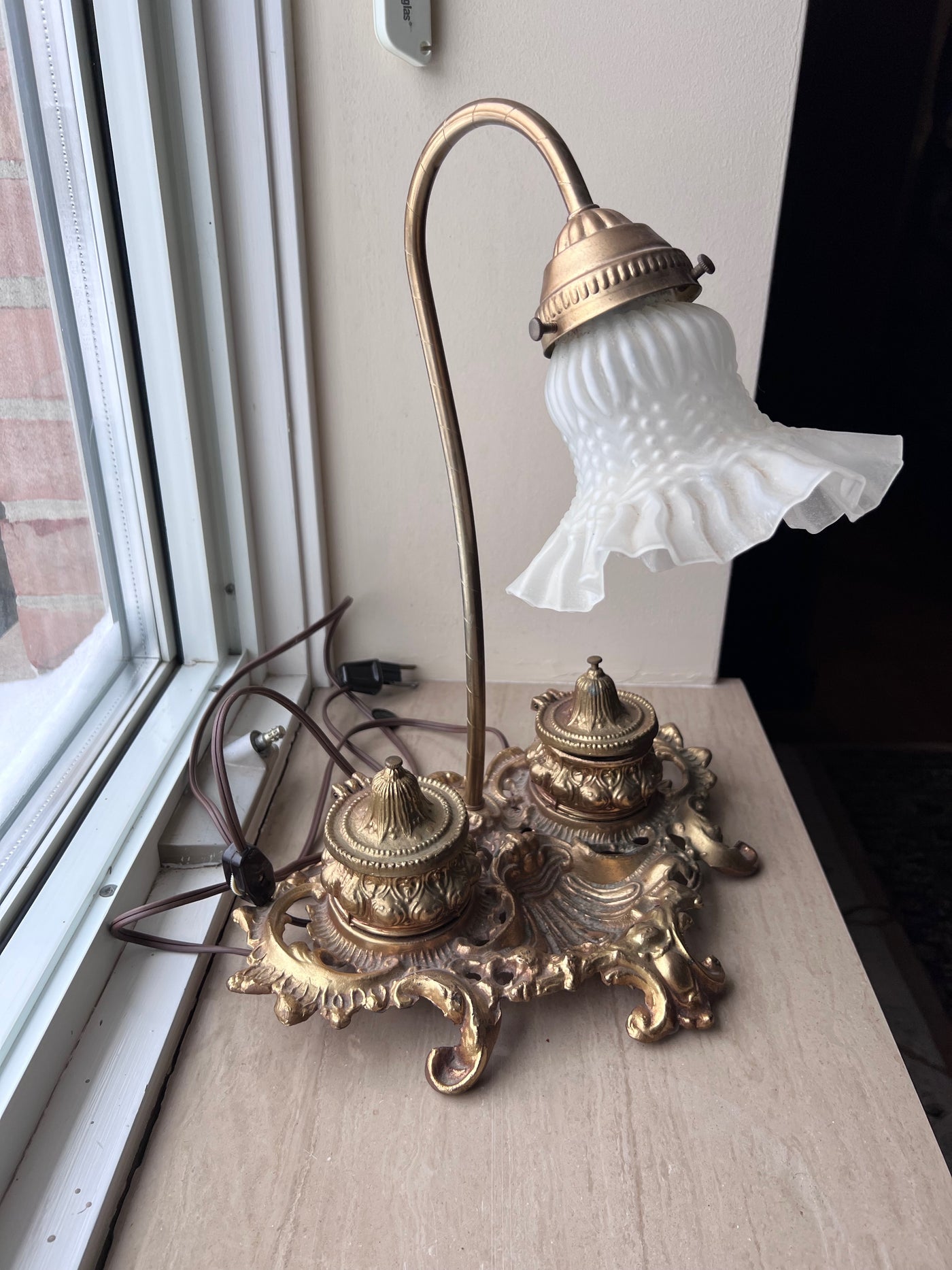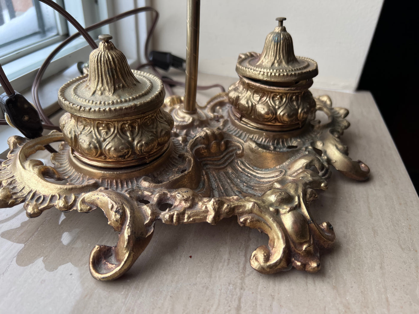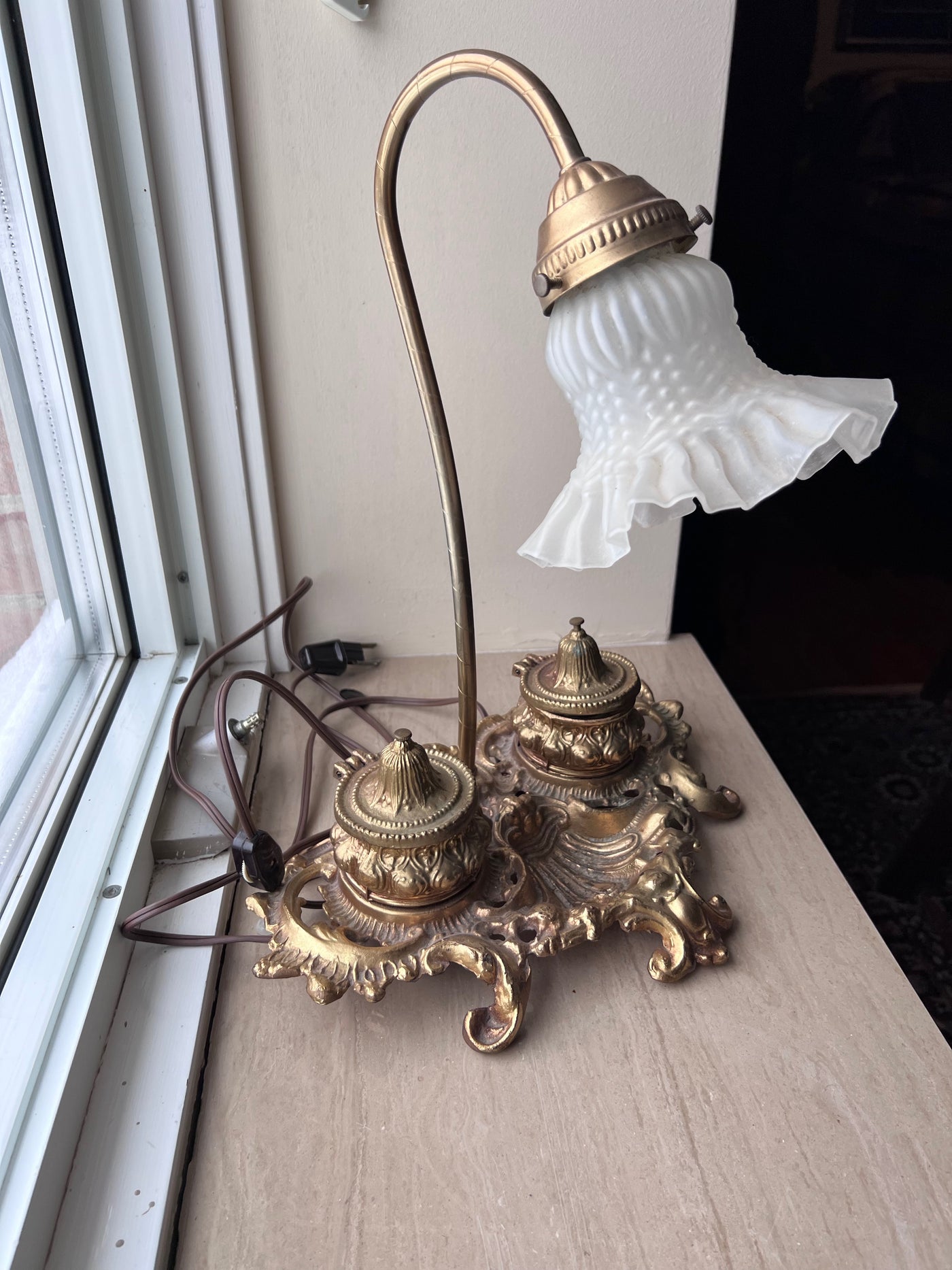 Antique Victorian Gooseneck Desk Lamp with Brass Ink Wells