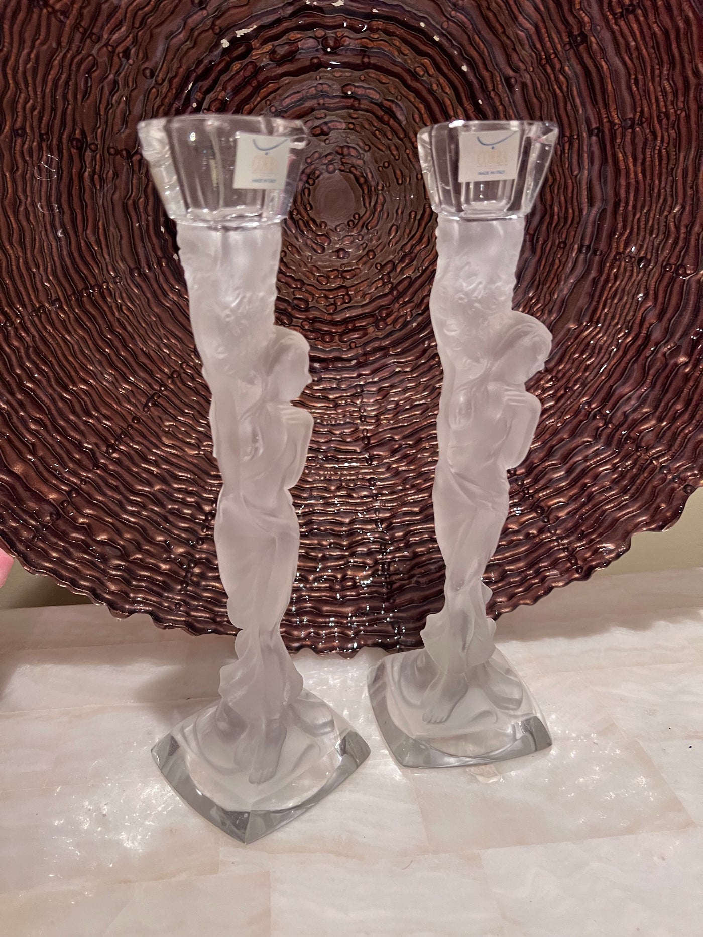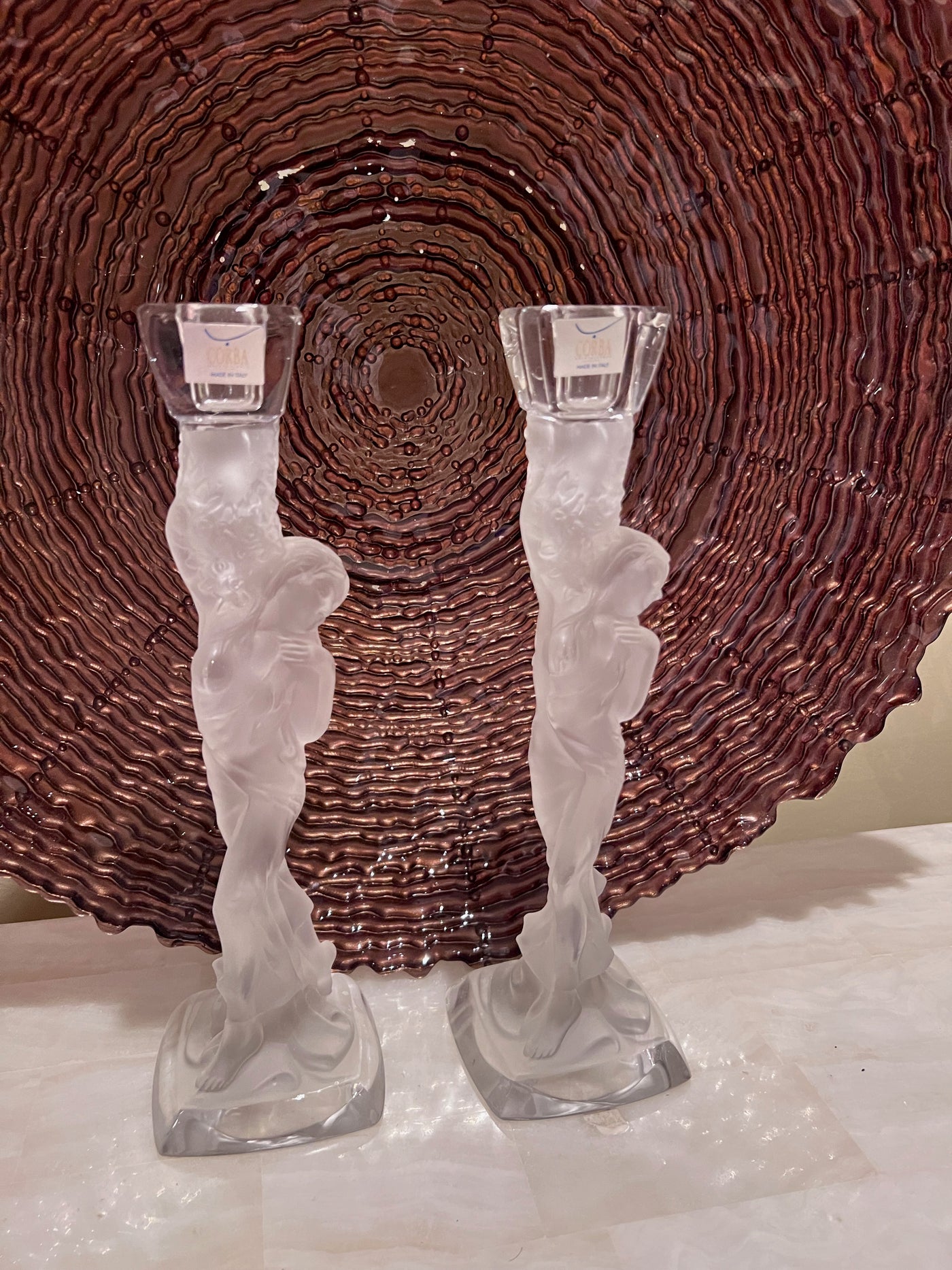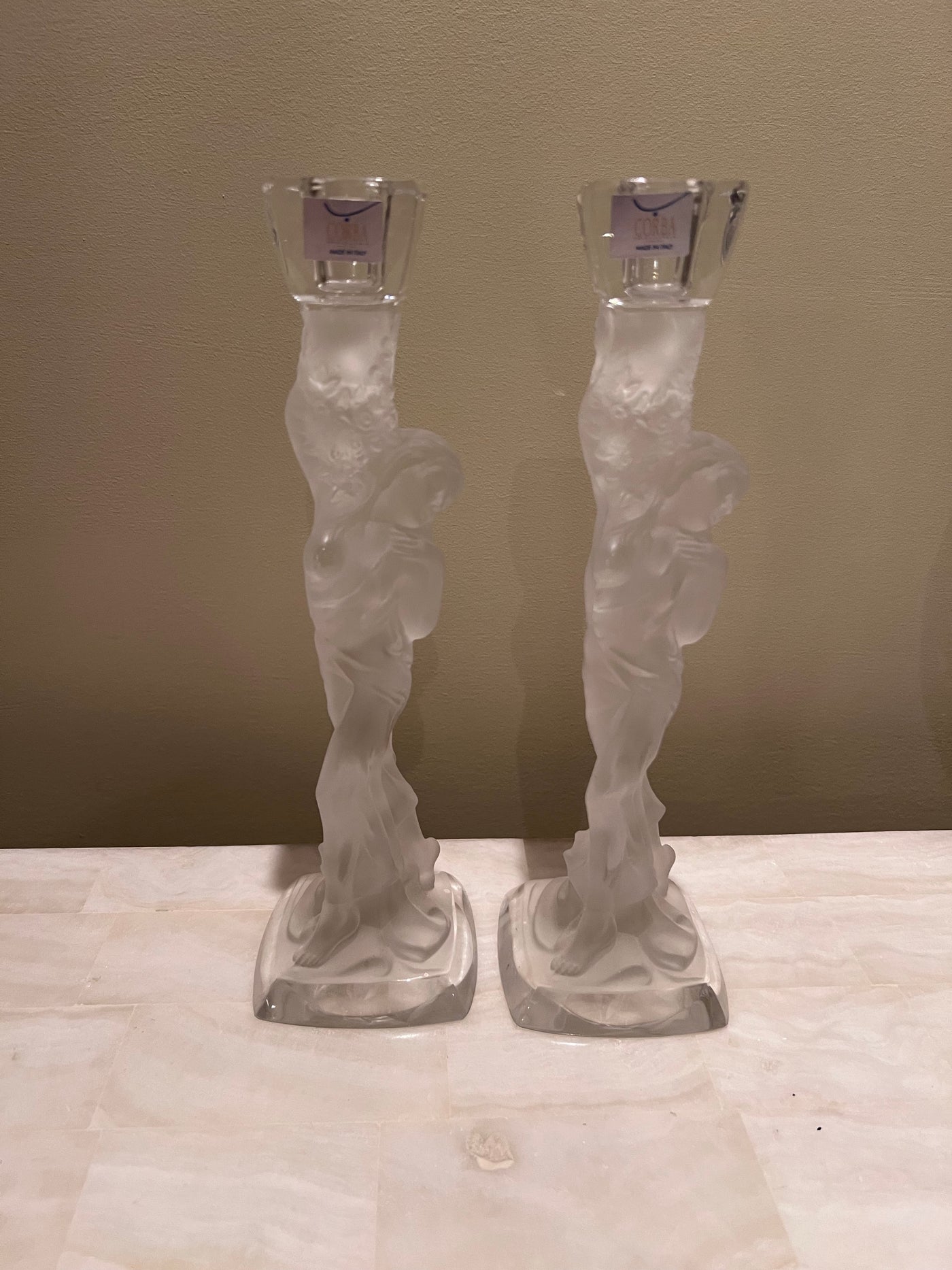 Pair of Corba Italy Frosted Glass Candlesticks.