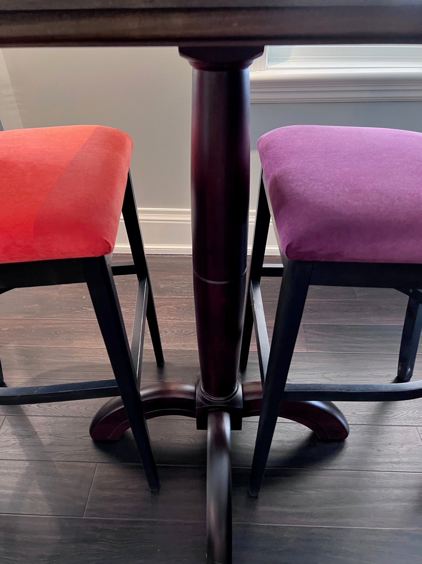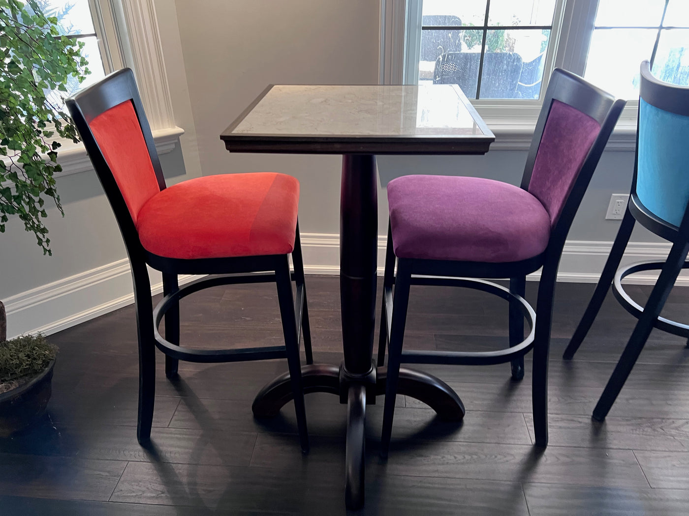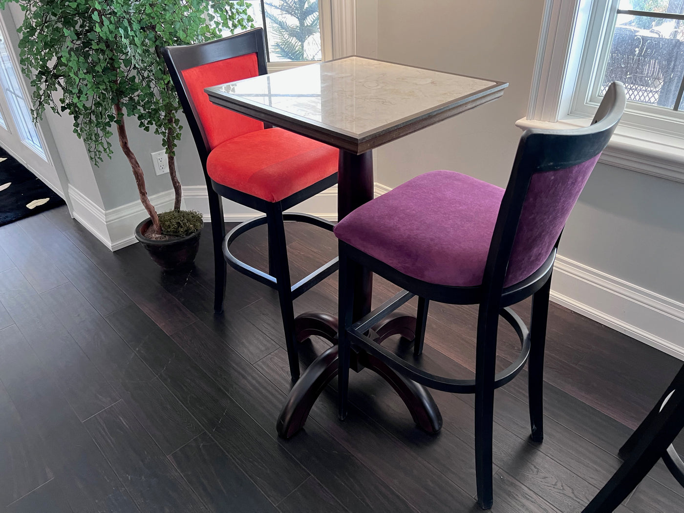 Cruiser Bar Table + Purple & Red Bar Stools.