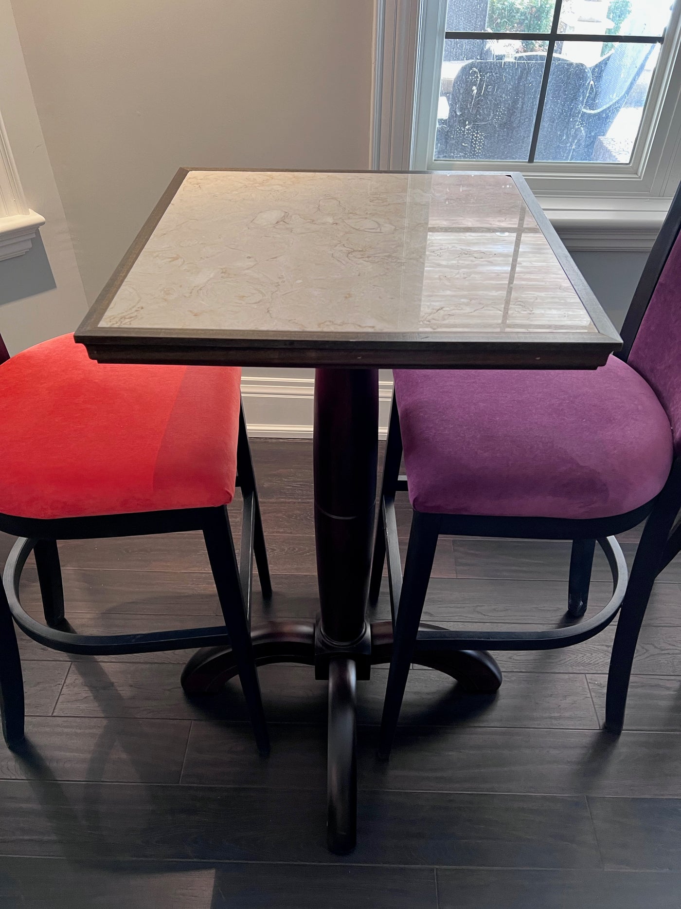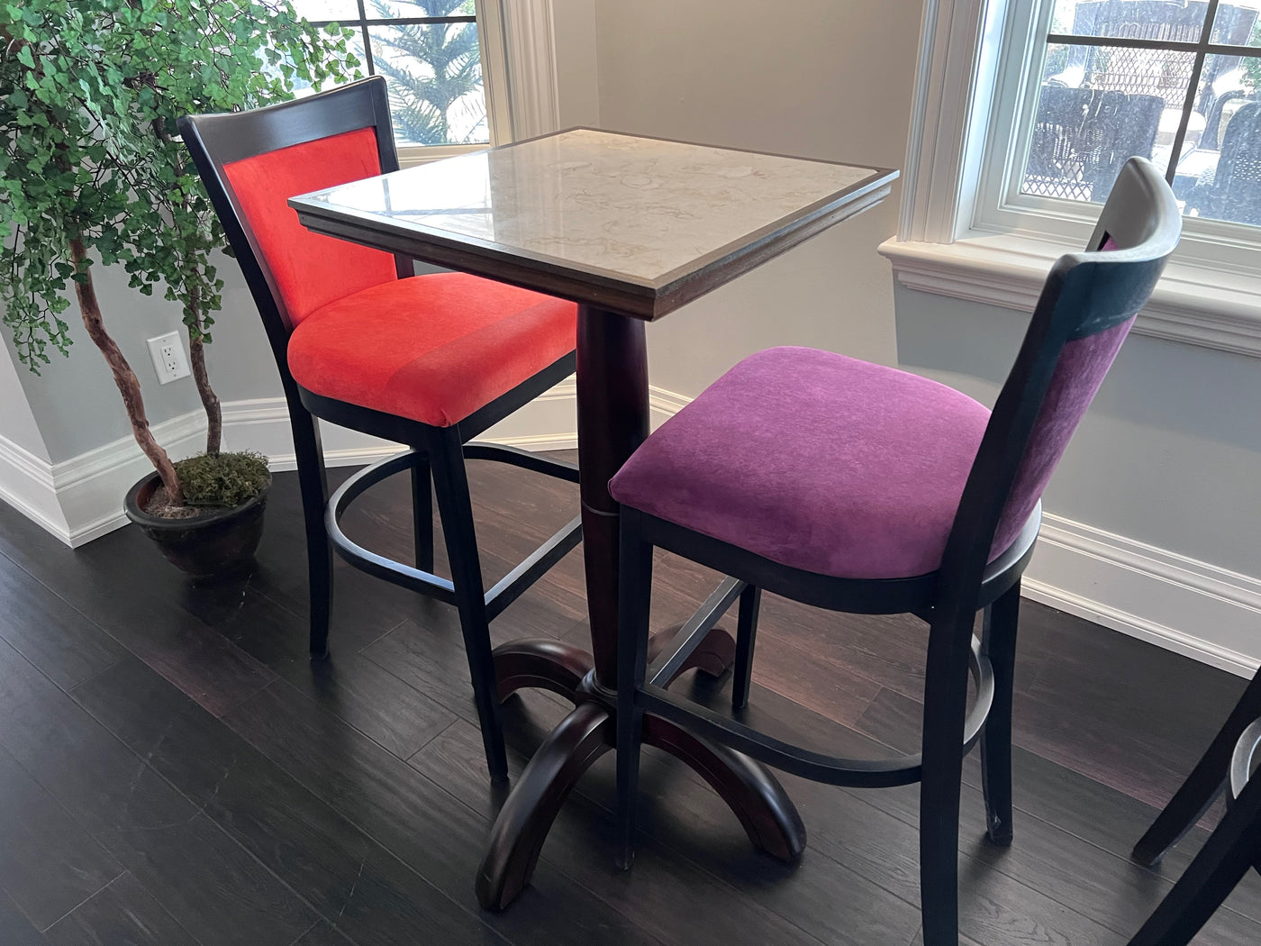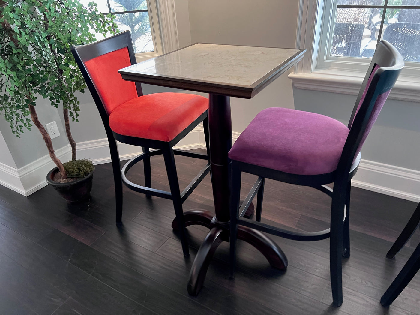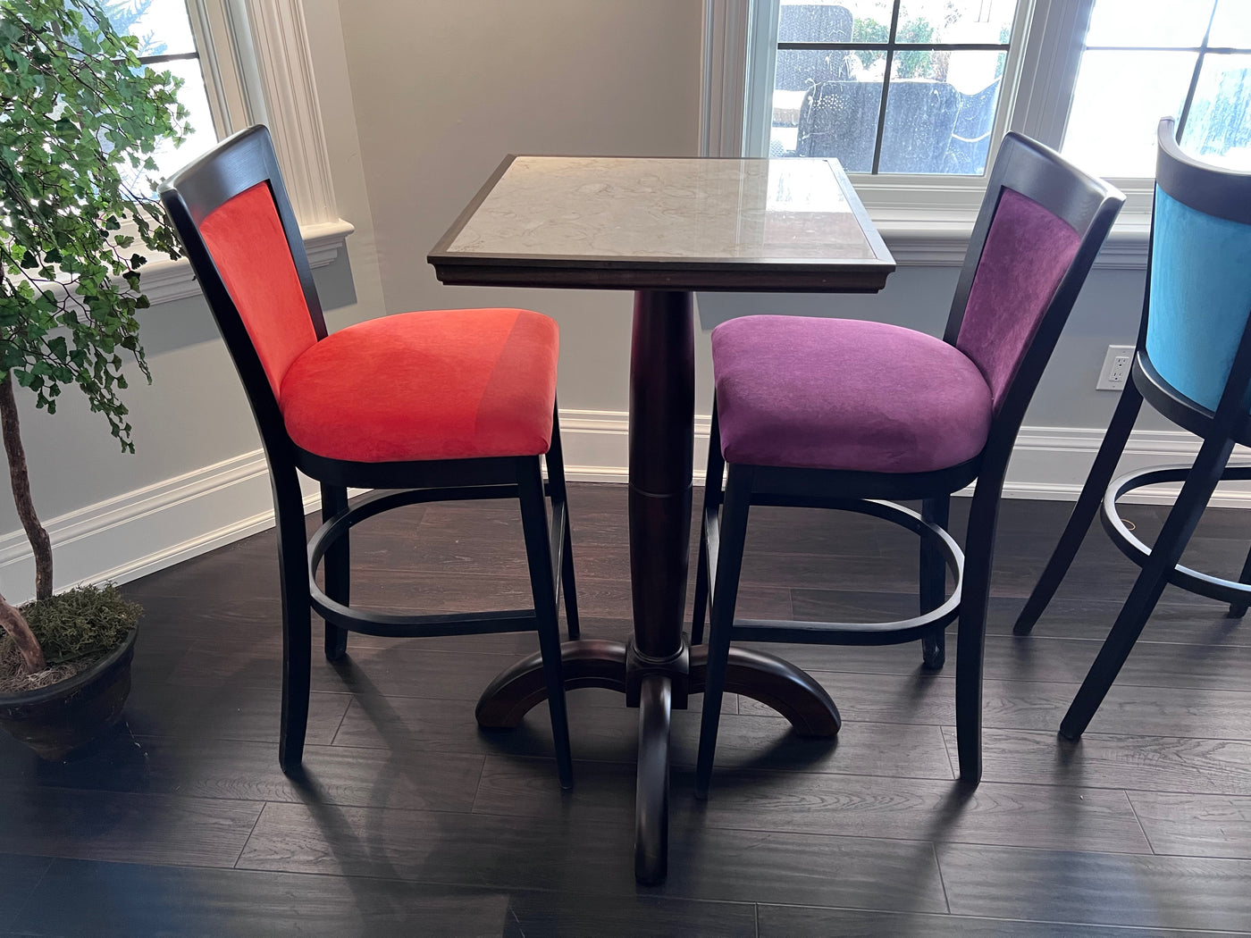 Cruiser Bar Table + Purple & Red Bar Stools.