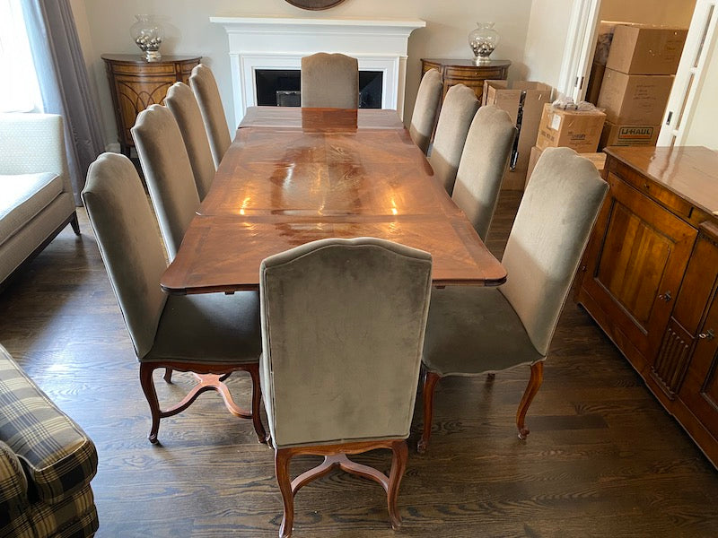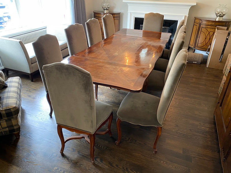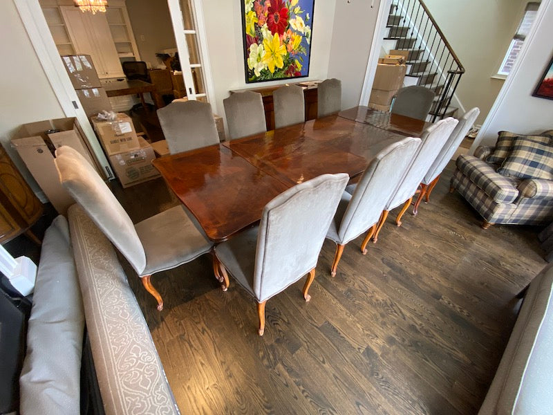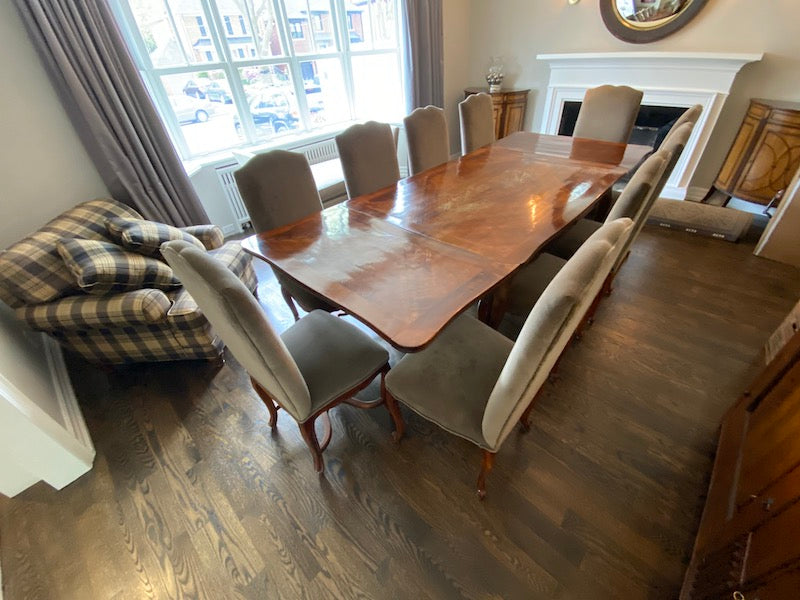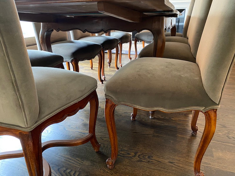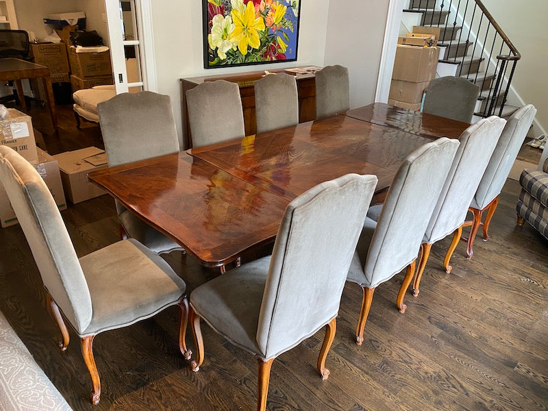 Mahogany Dining Table + 10 "Silva" Grey Dining Chairs.