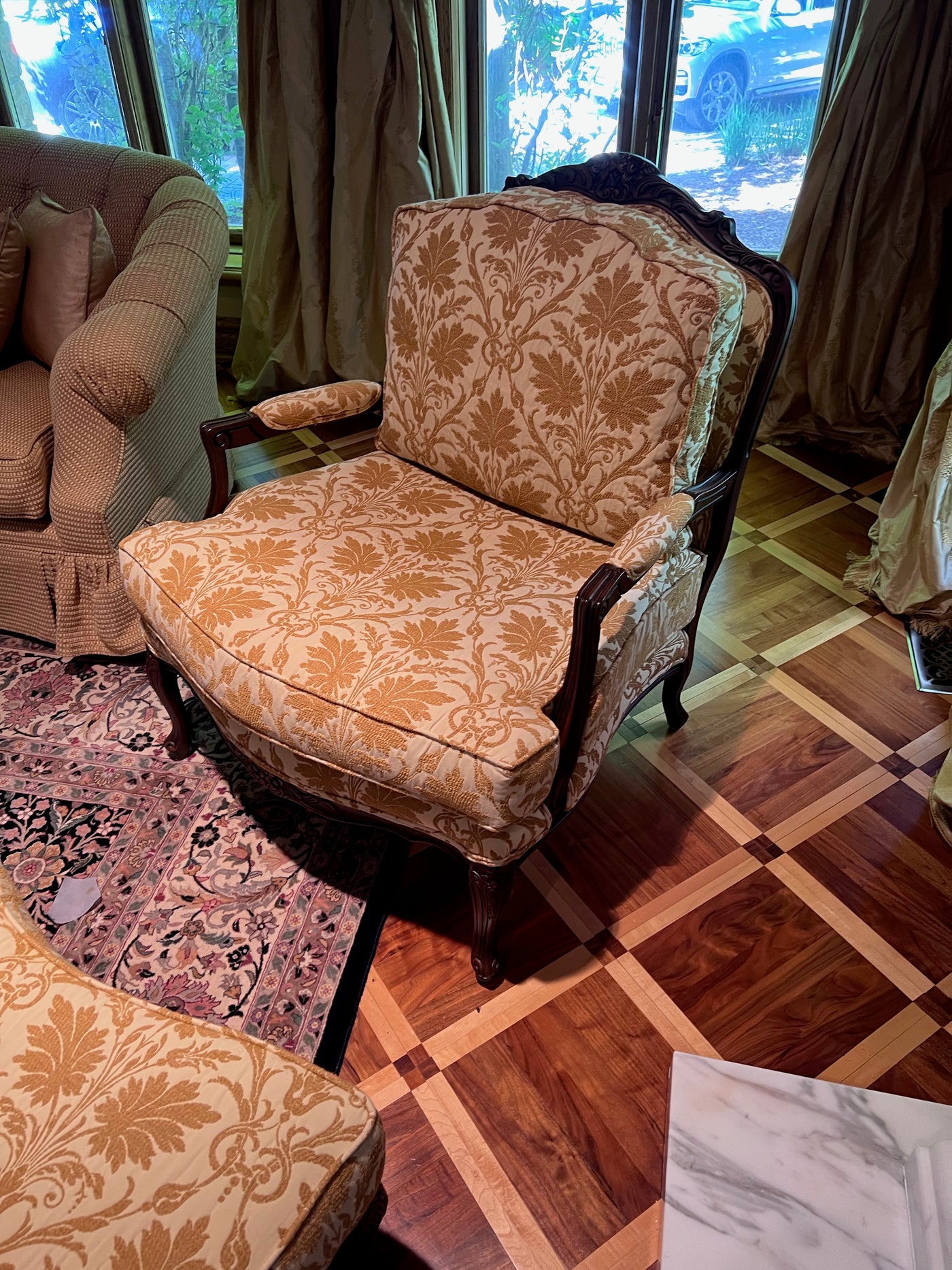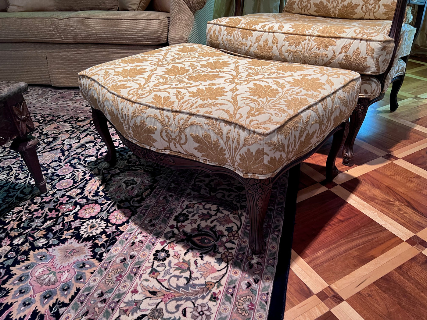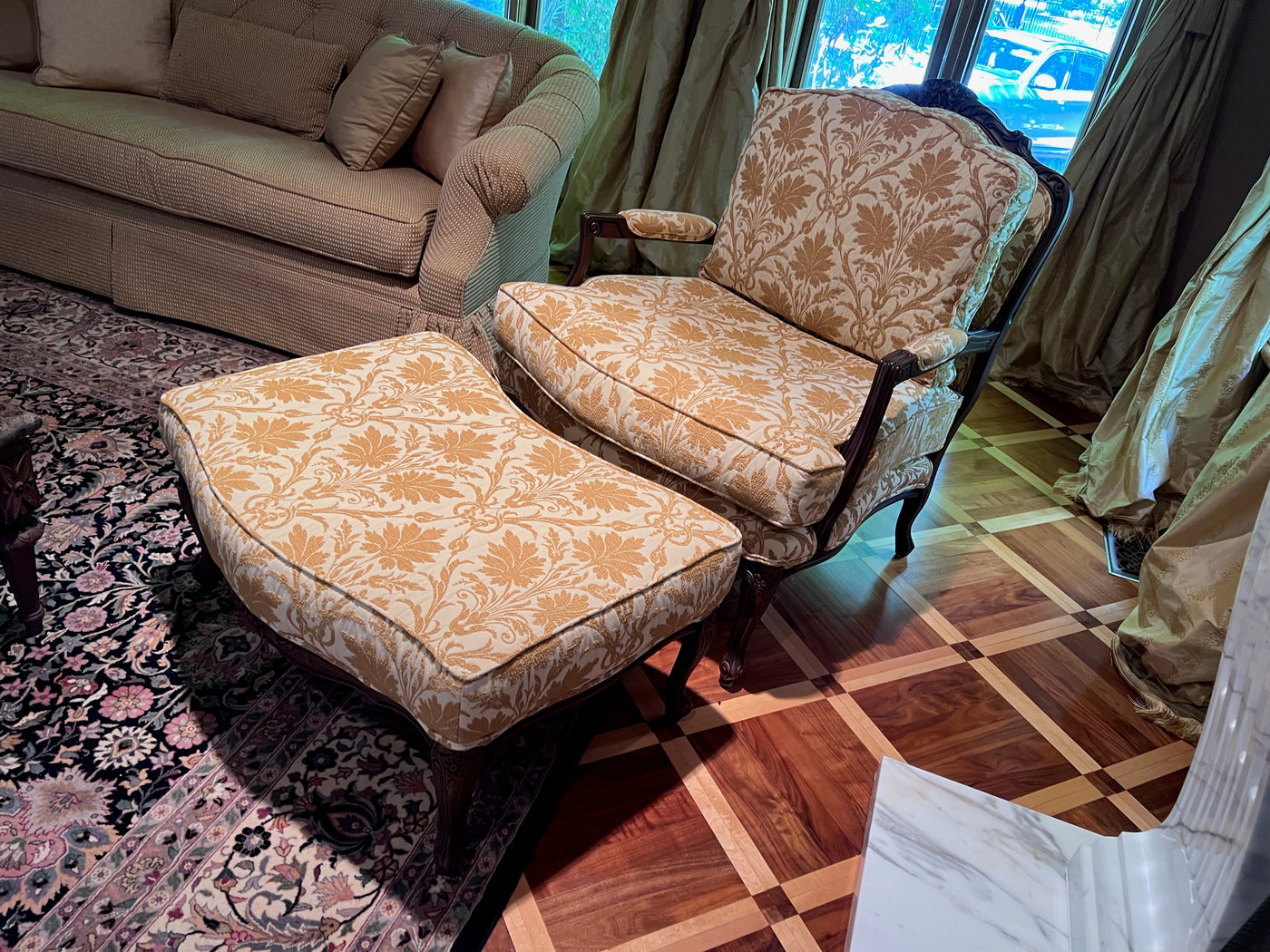 Large Berge Chair + Ottoman, Gold Design w/Wood Carved Frame.