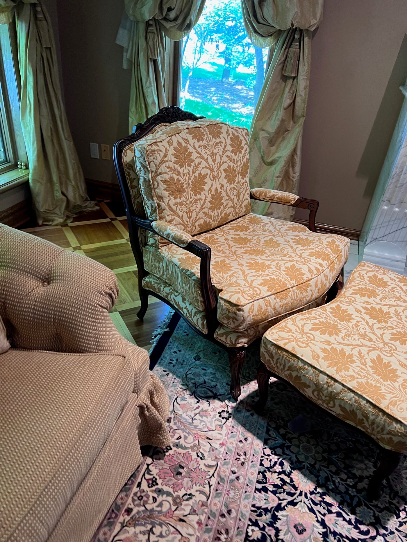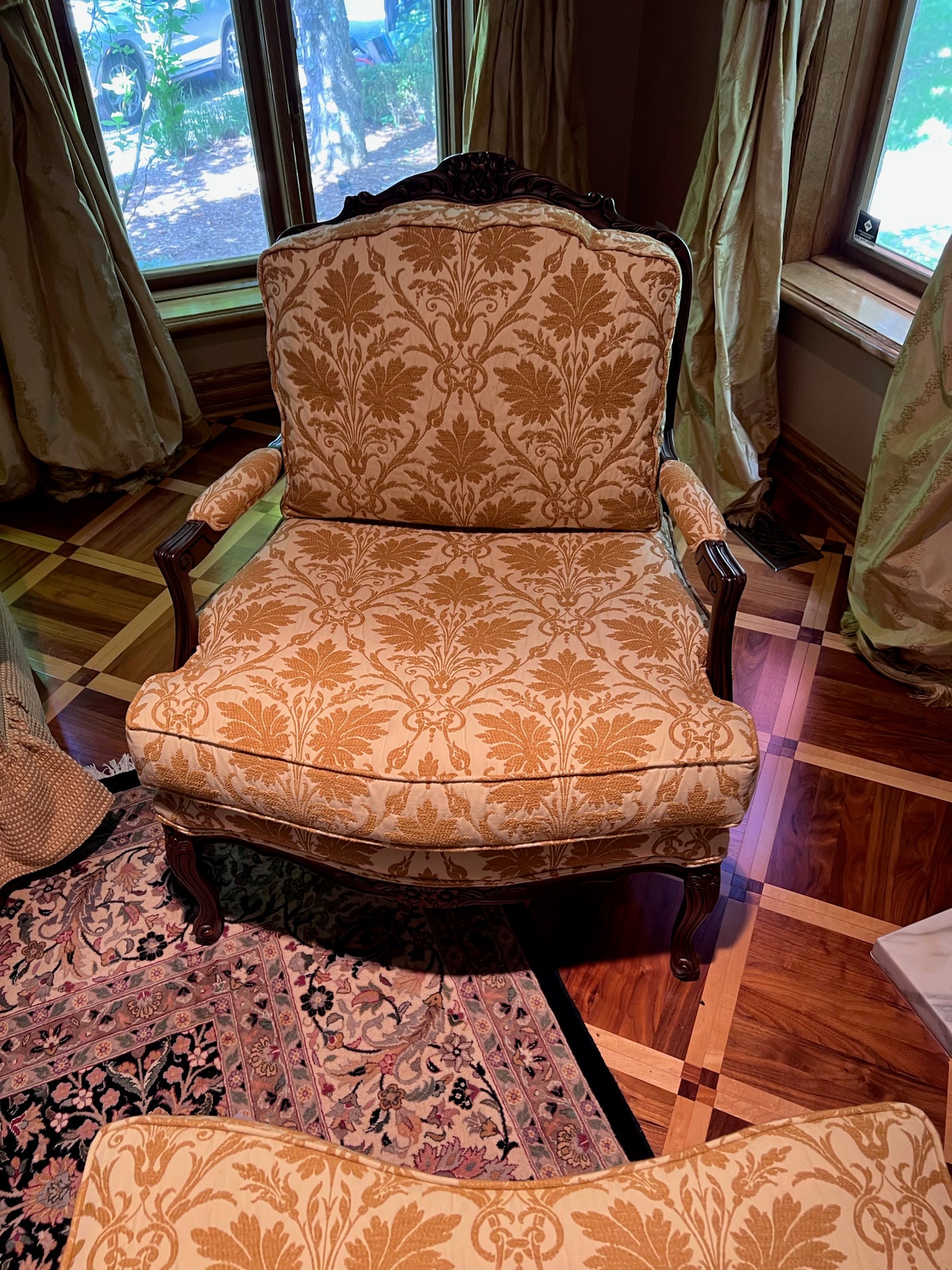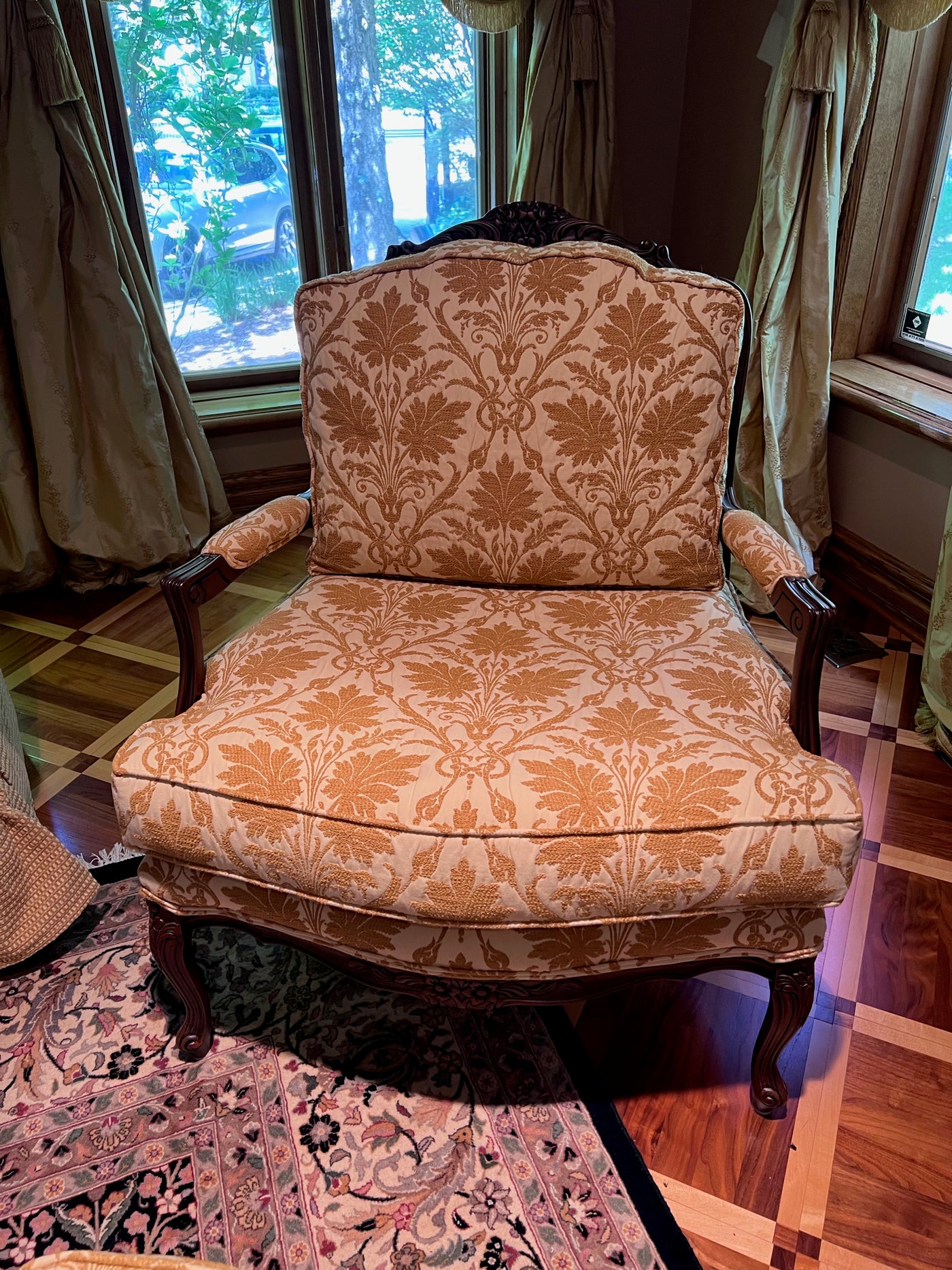 Large Berge Chair + Ottoman, Gold Design w/Wood Carved Frame.