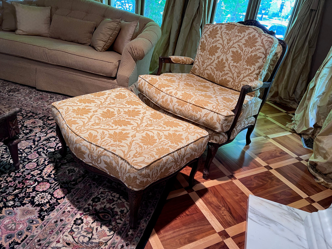 Large Berge Chair + Ottoman, Gold Design w/Wood Carved Frame
