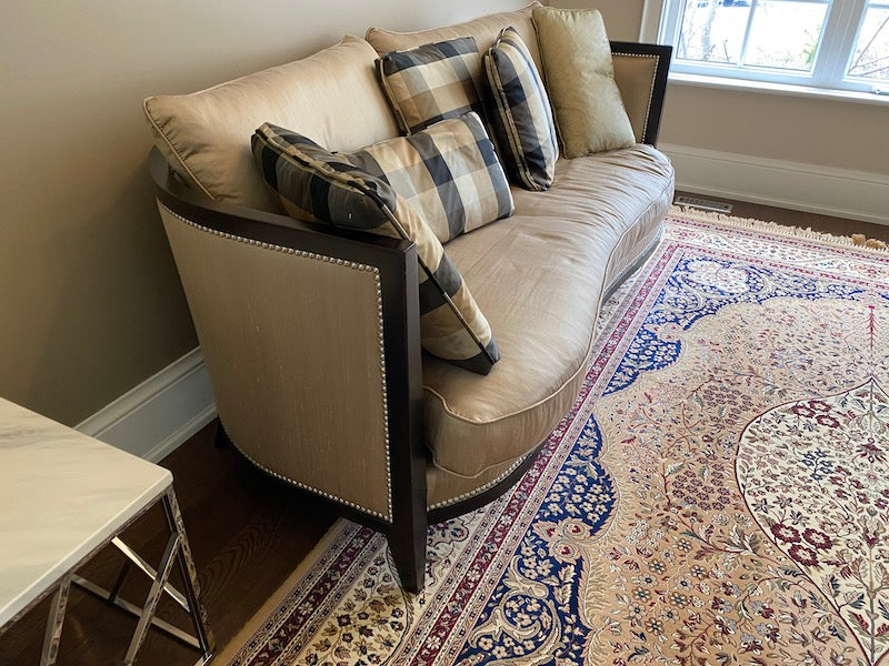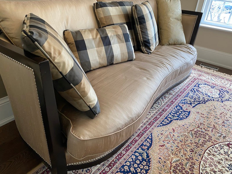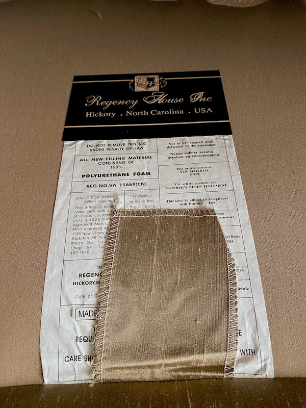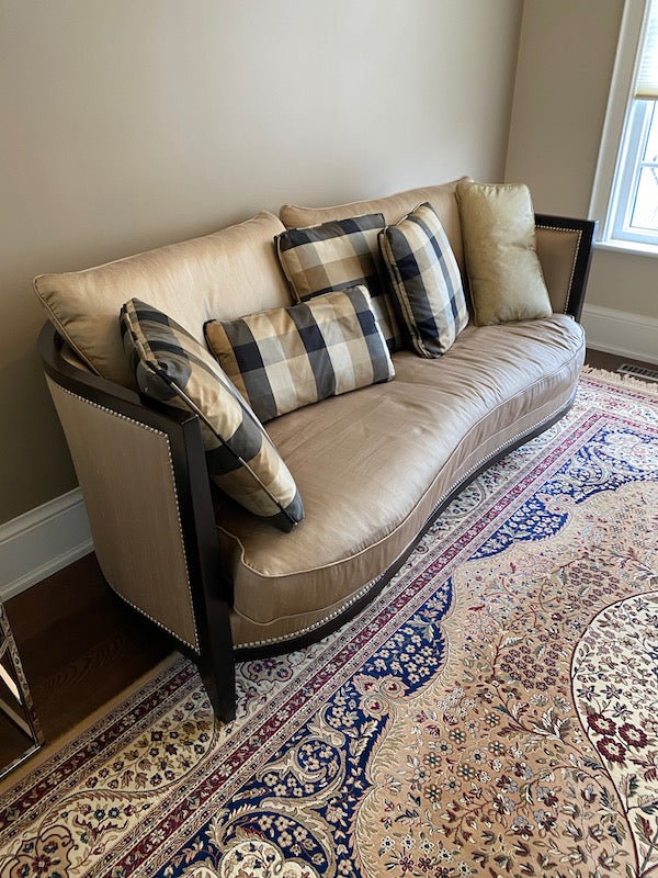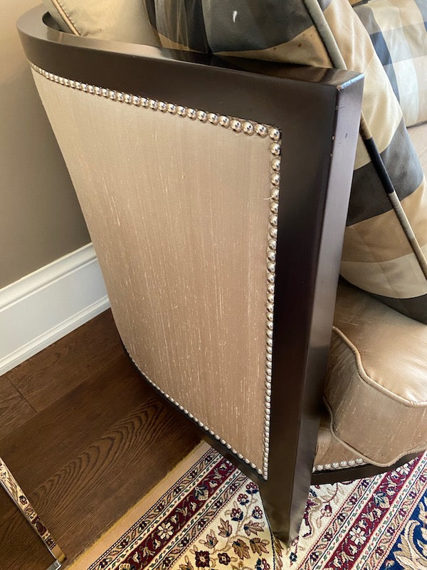 "Regency House Inc" Beige Silk Sofa, Black Wood Frame, Silver Studded Trim.