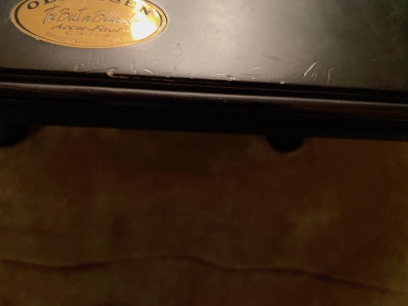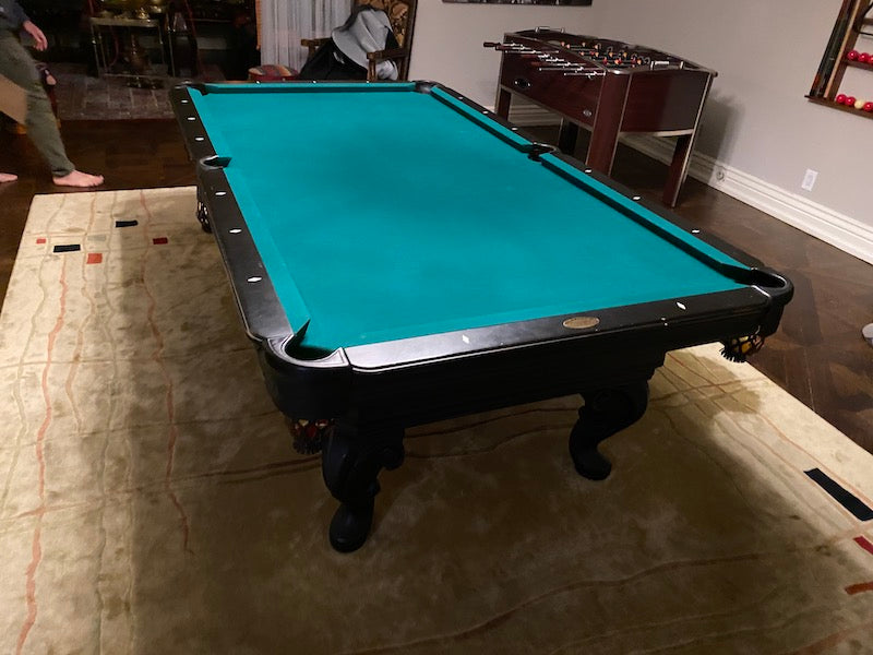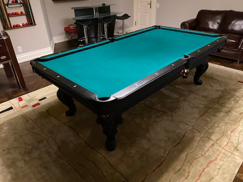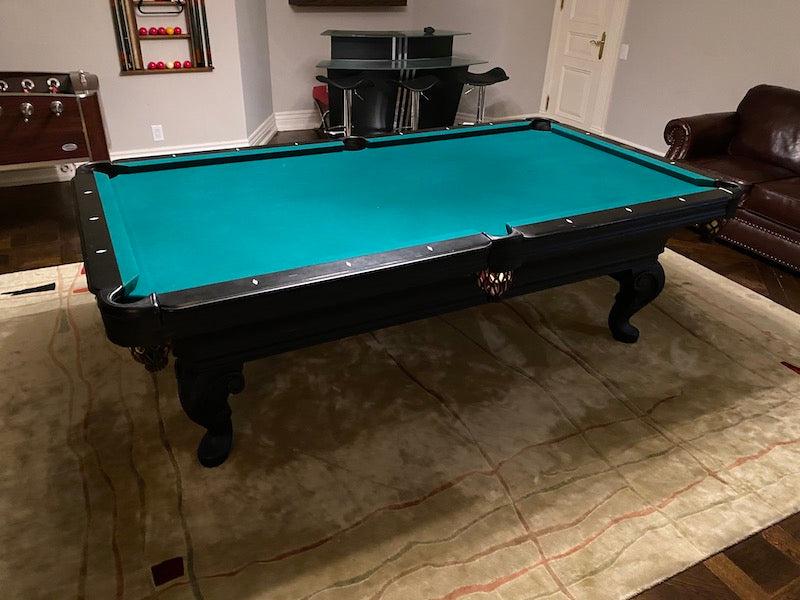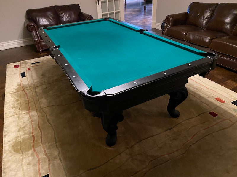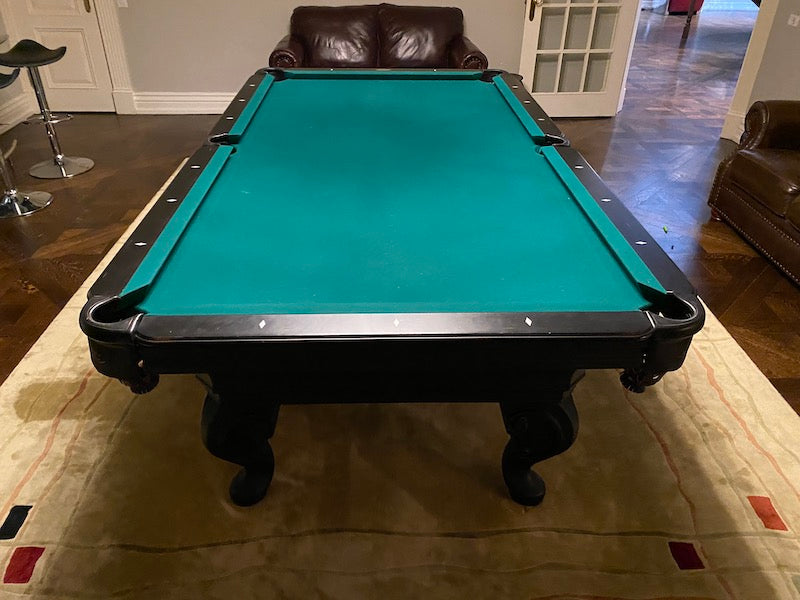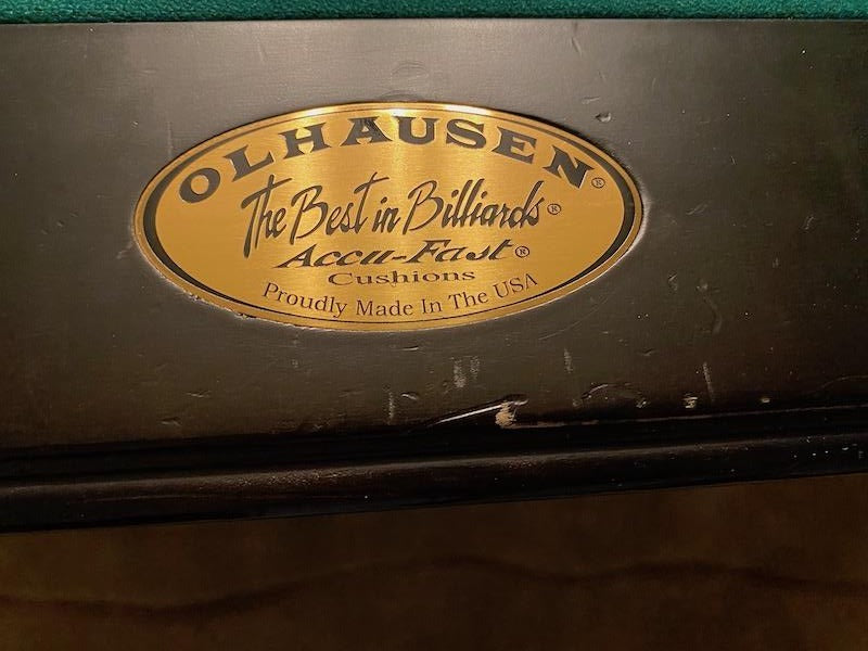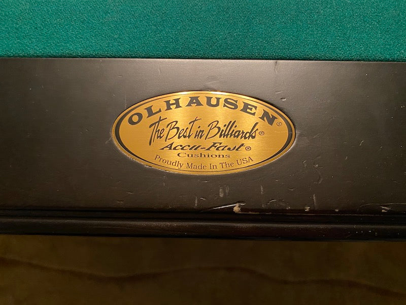 Olhausen Accu-Fast Cushions Pool Table + Accessories. Black frame with green felt.