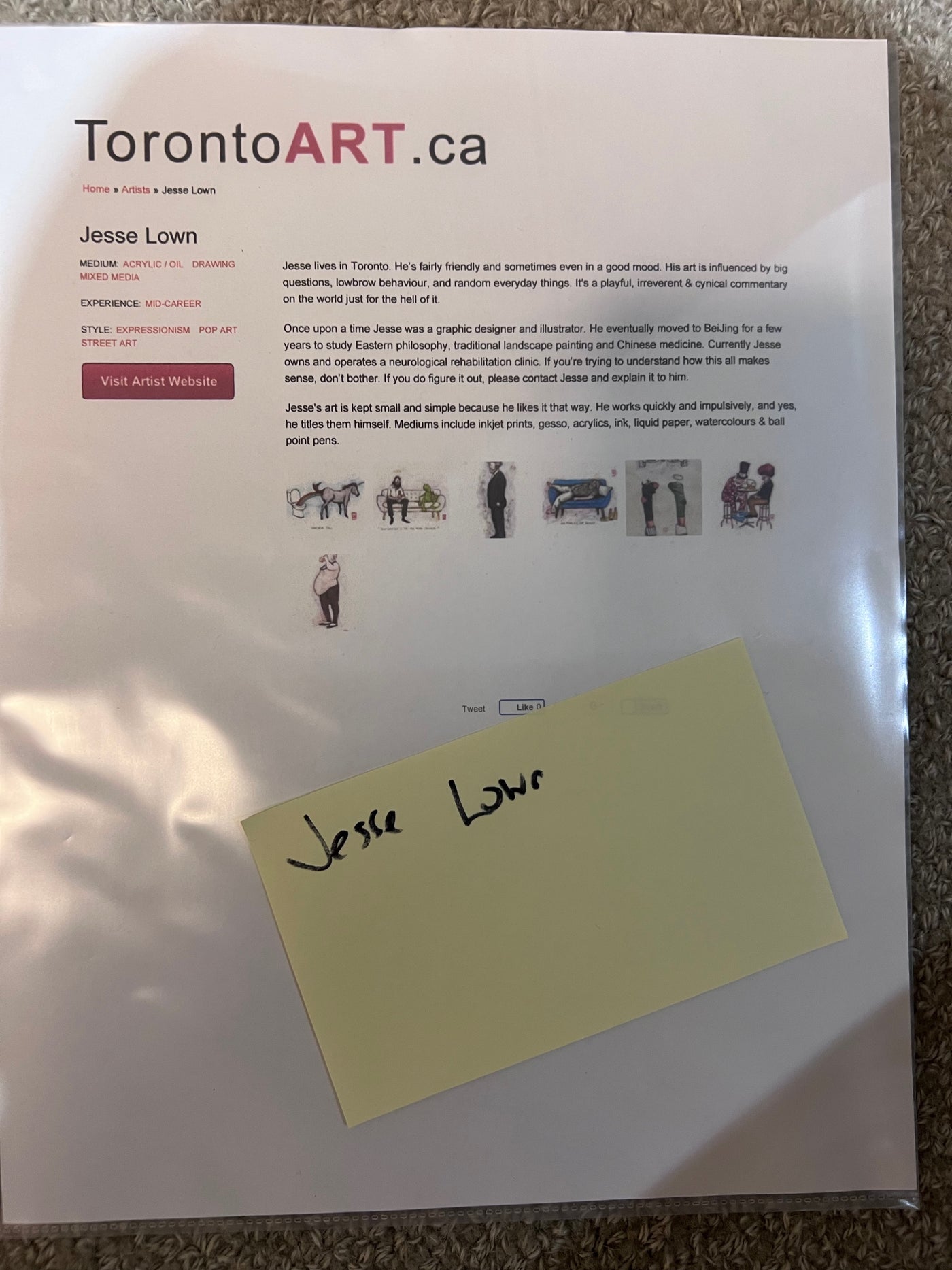 Jesse lives in Toronto. He’s fairly friendly and sometimes even in a good mood. His art is influenced by big questions, lowbrow behaviour, and random everyday activity. It's a playfully cynical commentary on the world for no reason other than the fun of it. Once upon a time Jesse was a graphic designer and illustrator. He eventually moved to BeiJing for a few years to study Eastern philosophy, traditional landscape painting and Chinese medicine. Currently Jesse owns and operates a neurological rehabilitation clinic. If you’re trying to understand how this all makes sense, don’t bother. If you do figure it out, please contact Jesse and explain it to him. Jesse's art is kept small and simple because he likes it that way. He works quickly and impulsively, and yes, he titles them himself. Mediums include inkjet prints, gesso, acrylics, ink, liquid paper, watercolours & ball point pens