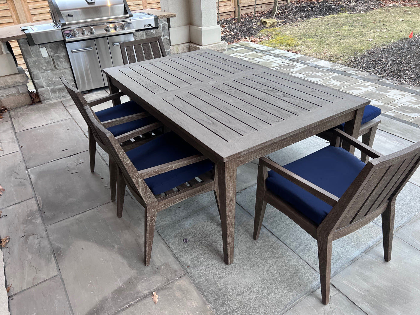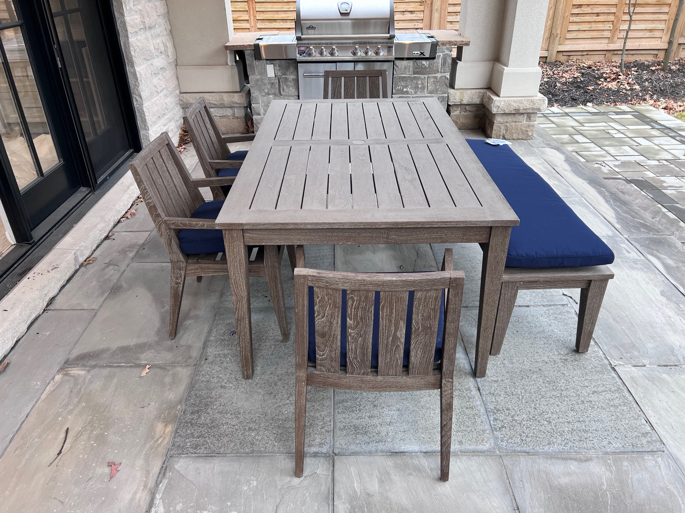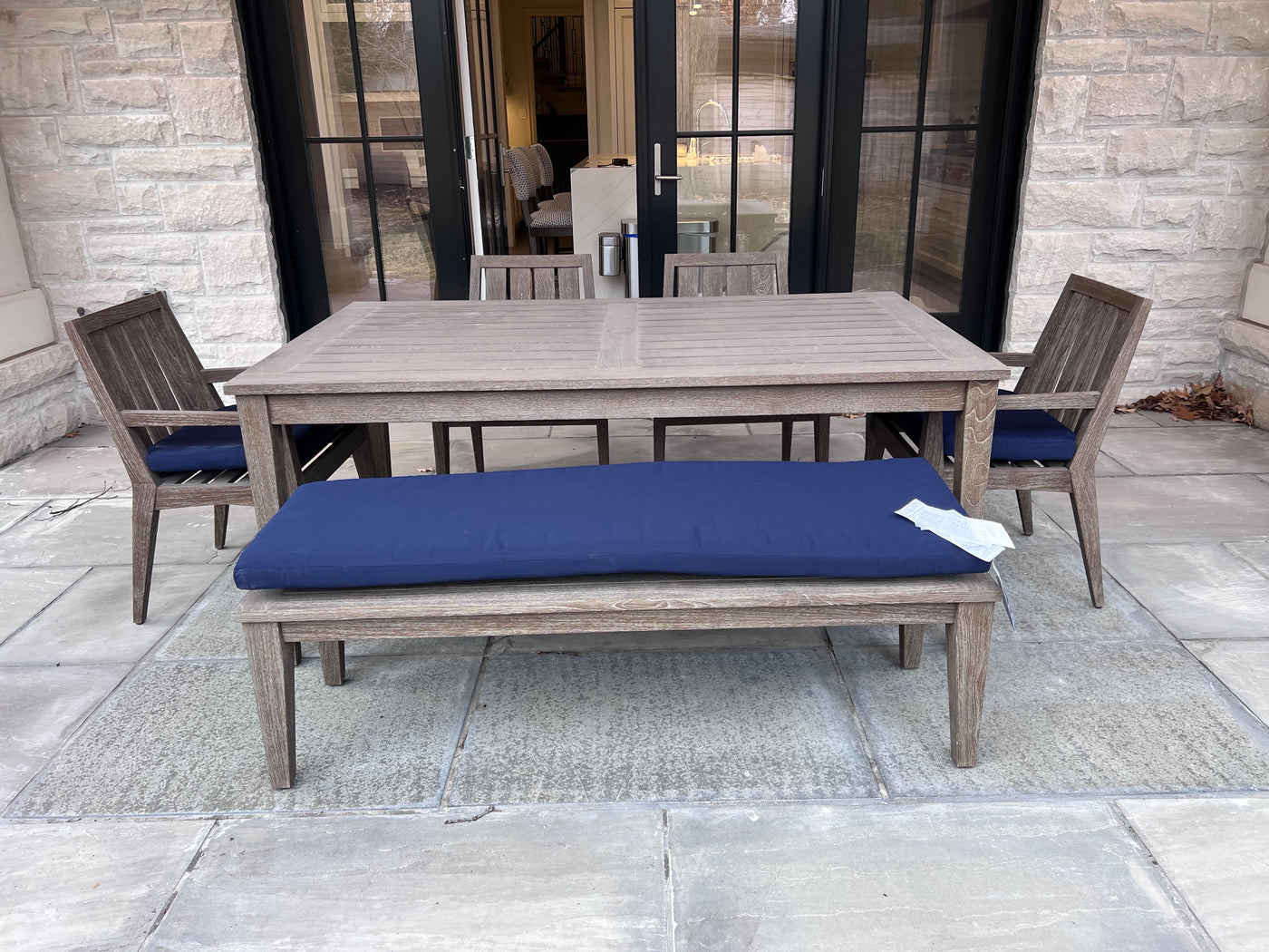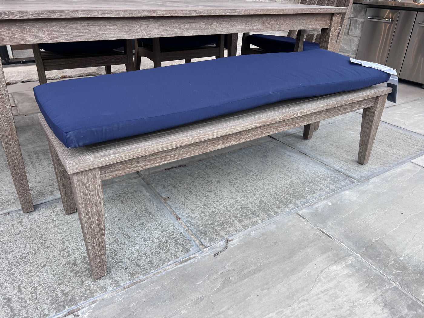 Ethan Allen Bridgewater Cove Teak Dining Table + Dining Bench + 4 Dining Armchairs with Custom Navy Cushions (*retail $11,041)