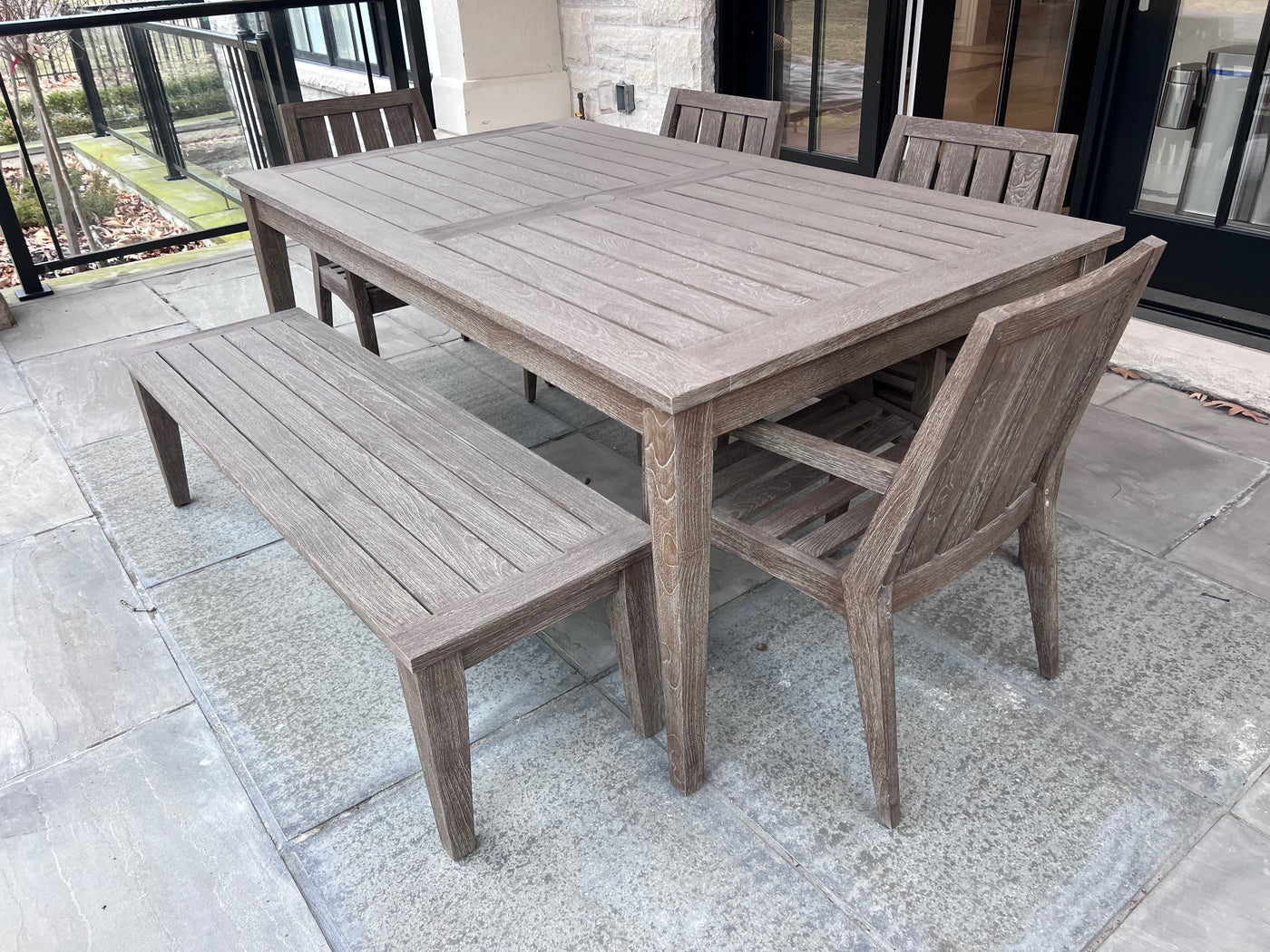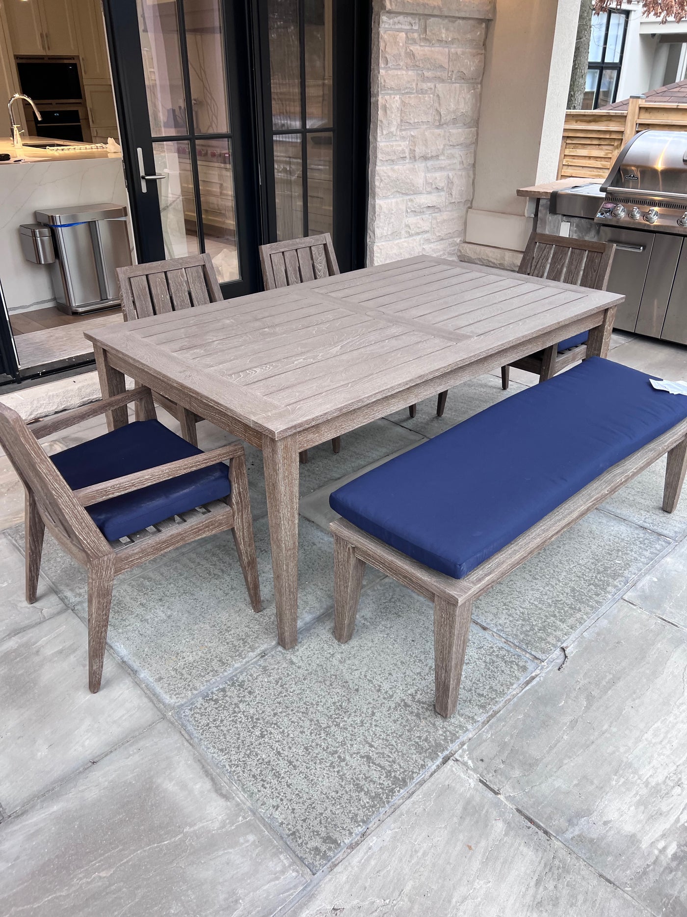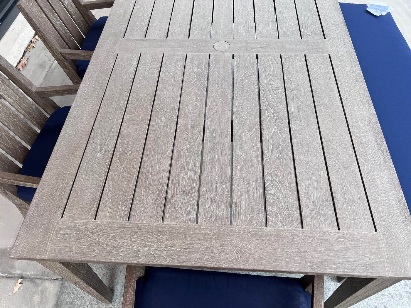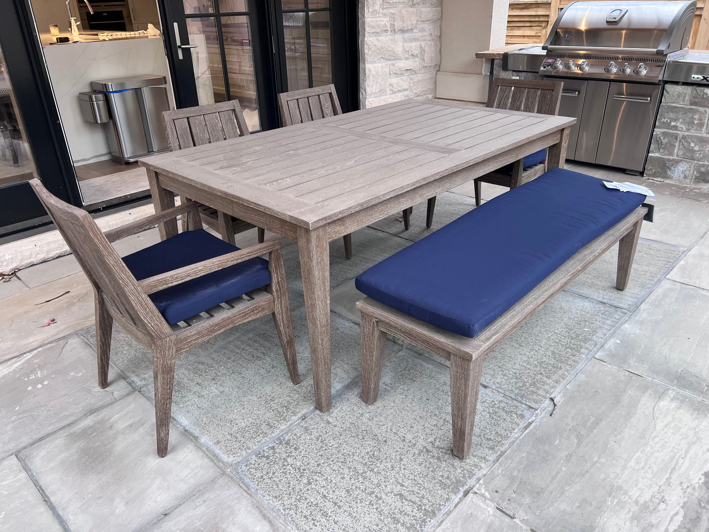 Ethan Allen Bridgewater Cove Teak Dining Table + Dining Bench + 4 Dining Armchairs with Custom Navy Cushions (*retail $11,041)