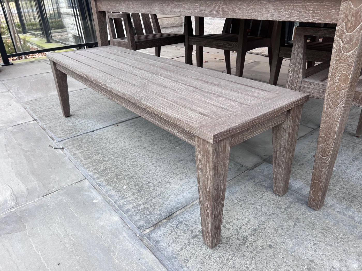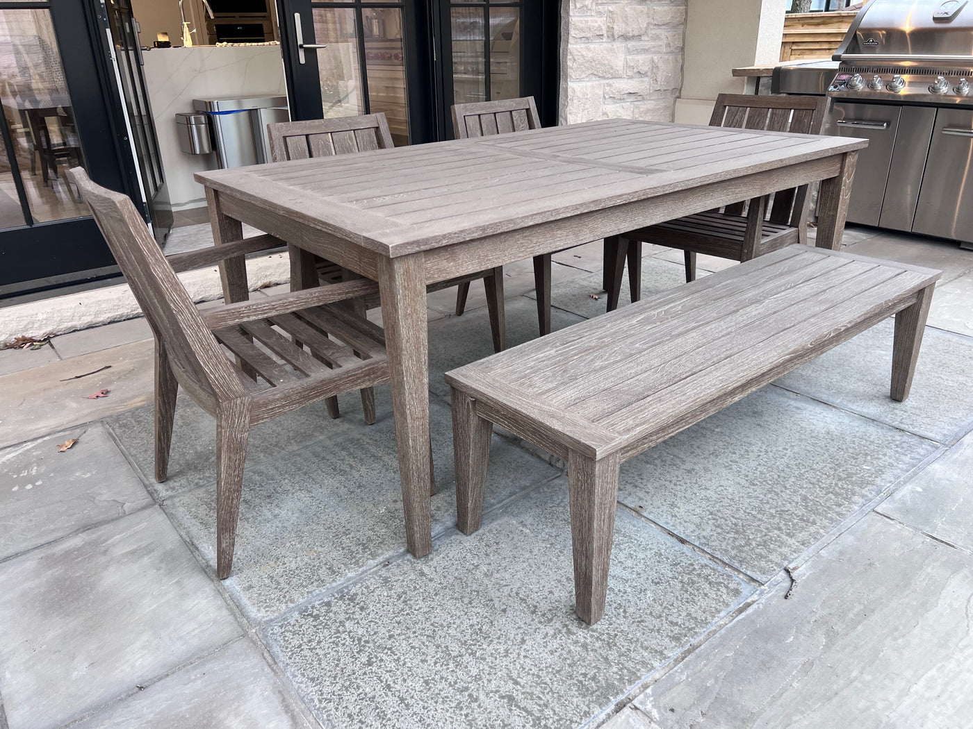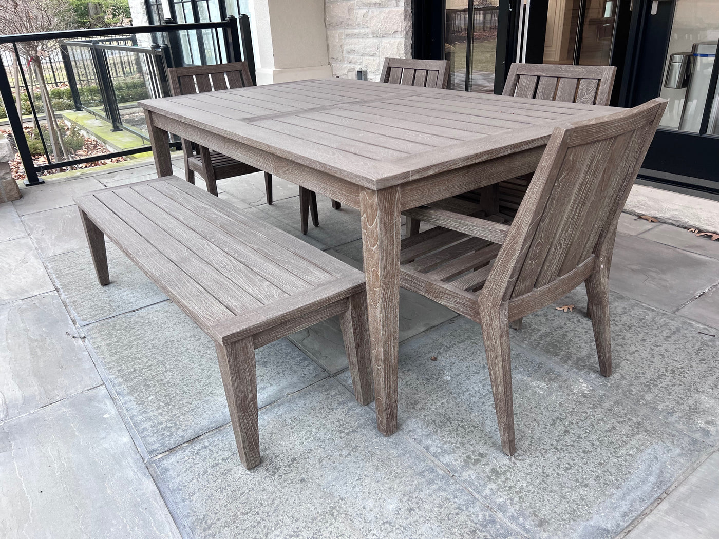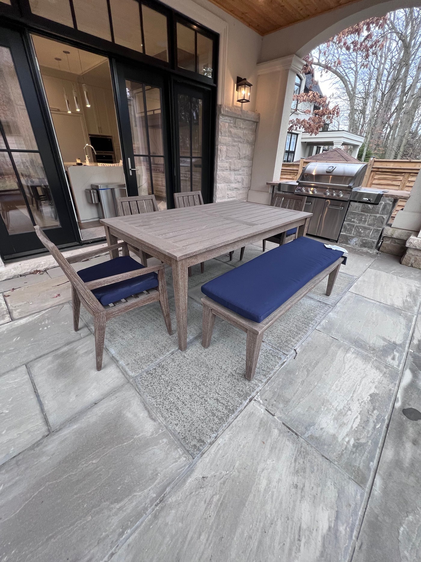 Ethan Allen Bridgewater Cove Teak Dining Table + Dining Bench + 4 Dining Armchairs with Custom Navy Cushions (*retail $11,041)