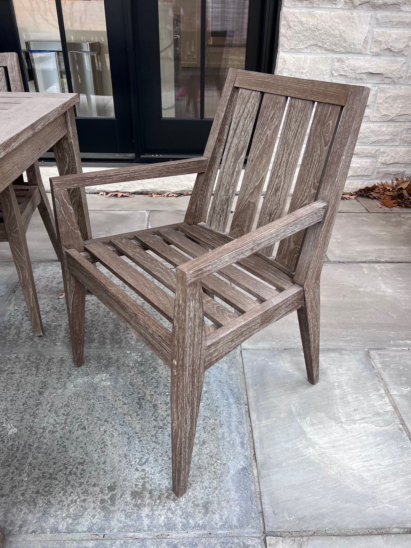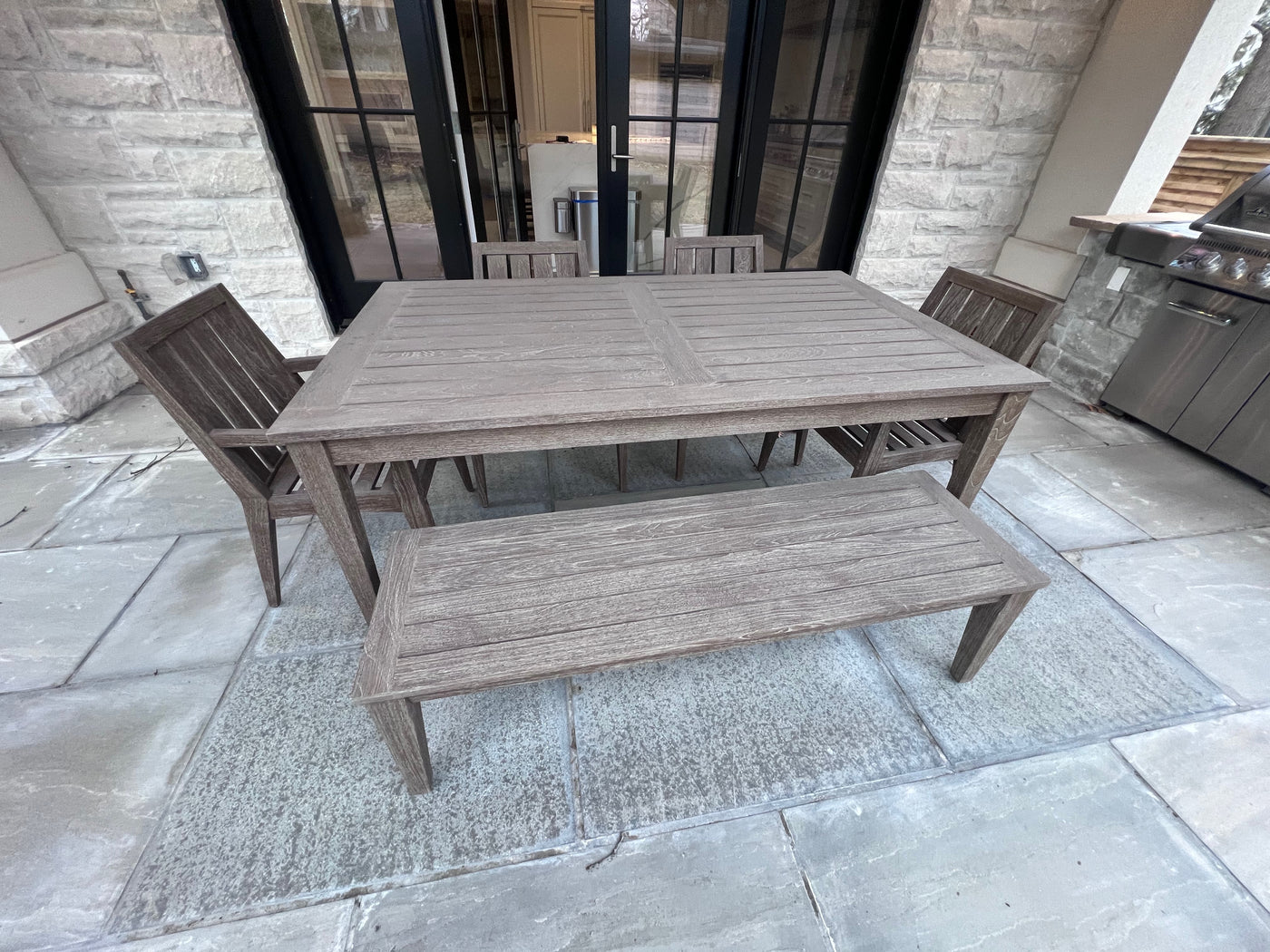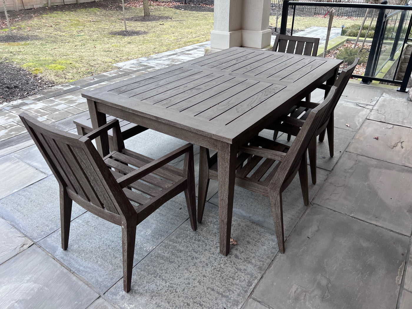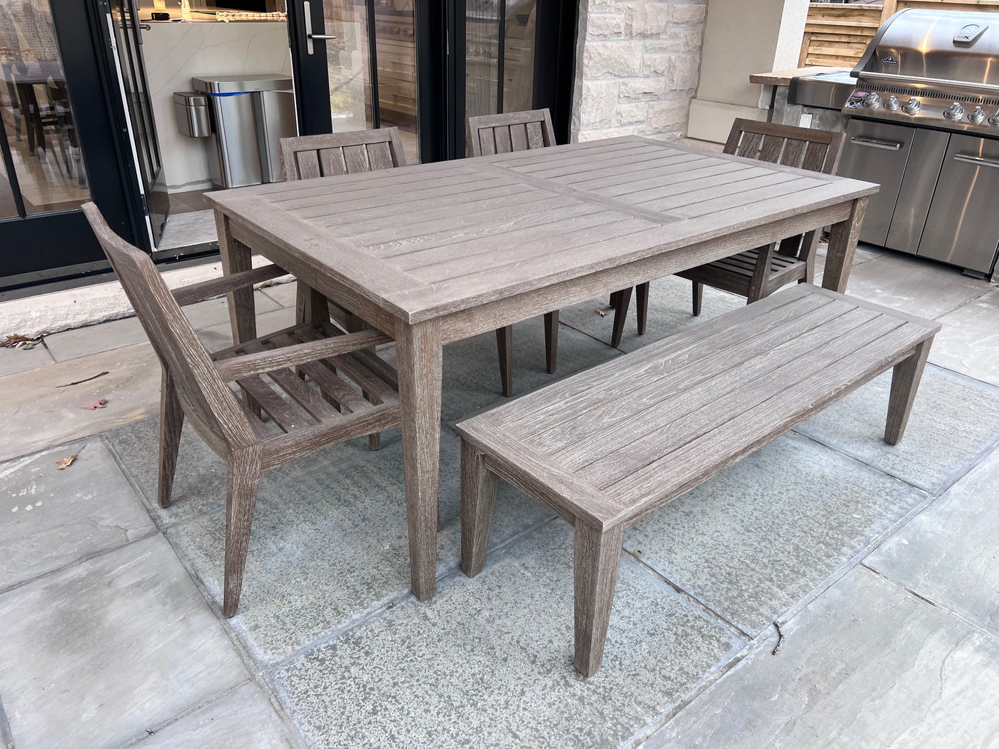 Ethan Allen Bridgewater Cove Teak Dining Table + Dining Bench + 4 Dining Armchairs with Custom Navy Cushions (*retail $11,041)