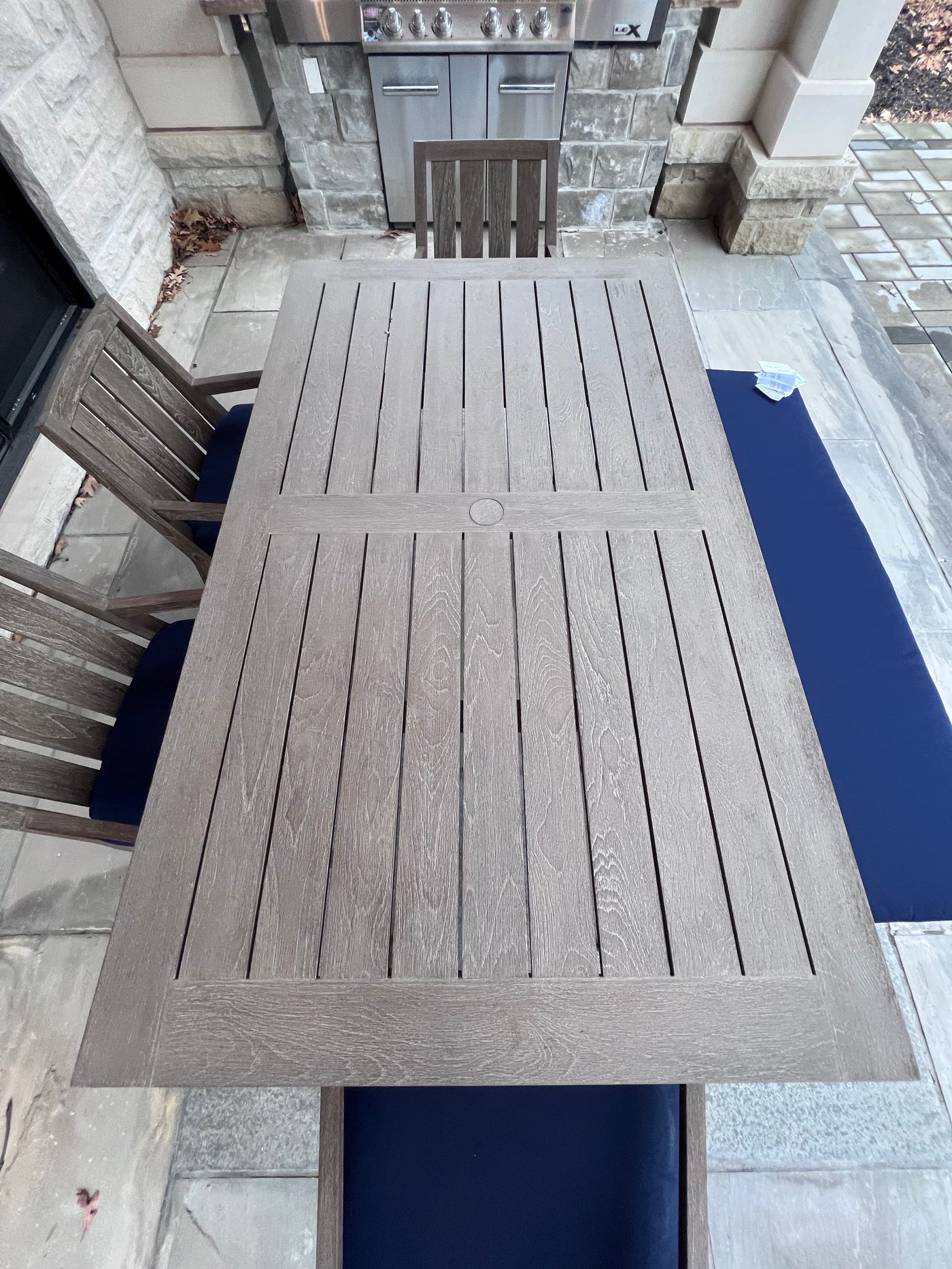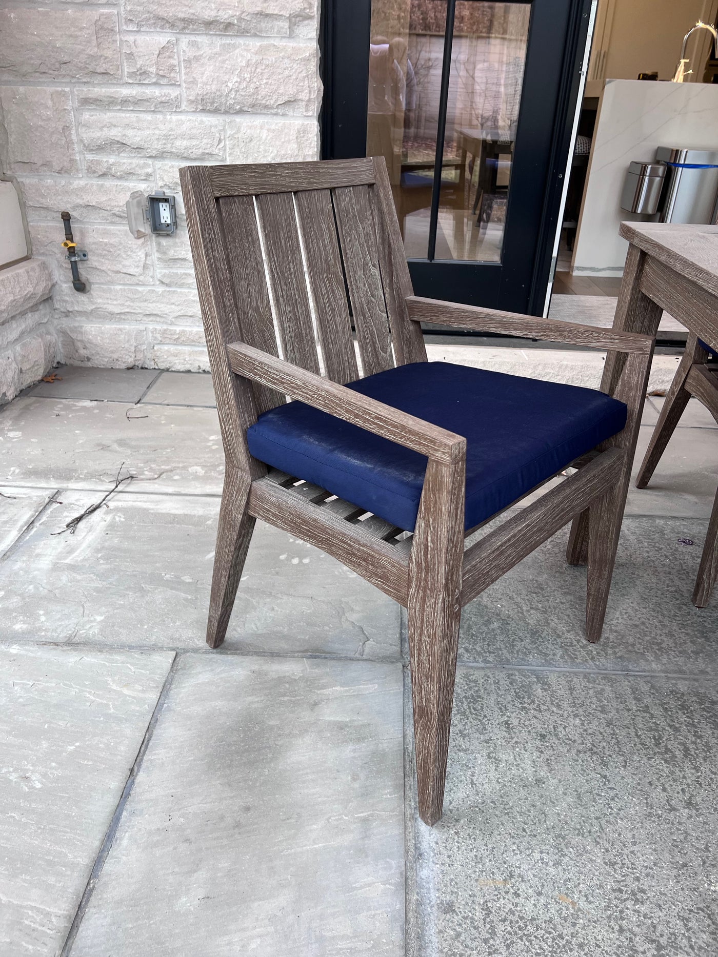 Ethan Allen Bridgewater Cove Teak Dining Table + Dining Bench + 4 Dining Armchairs with Custom Navy Cushions (*retail $11,041).