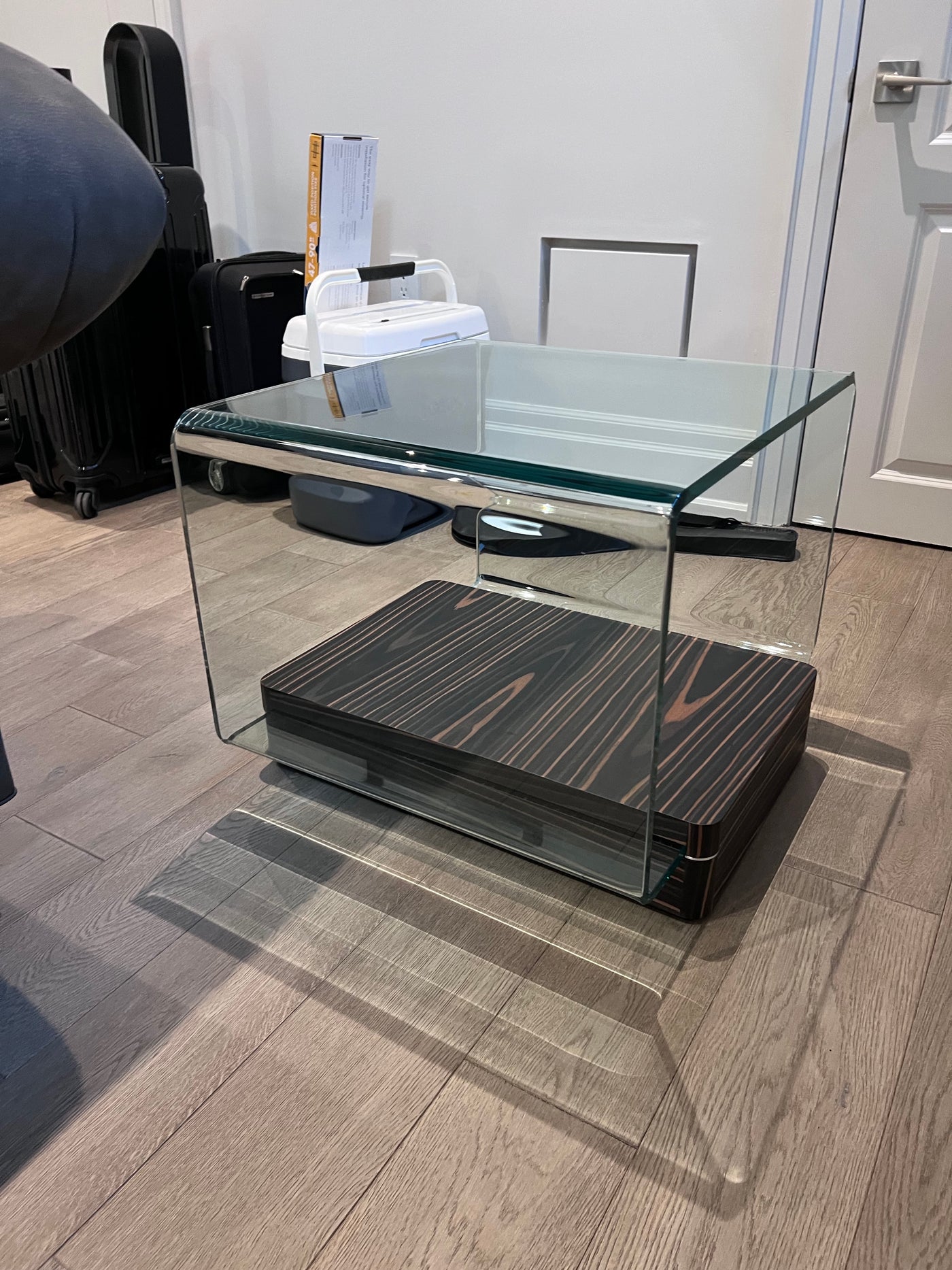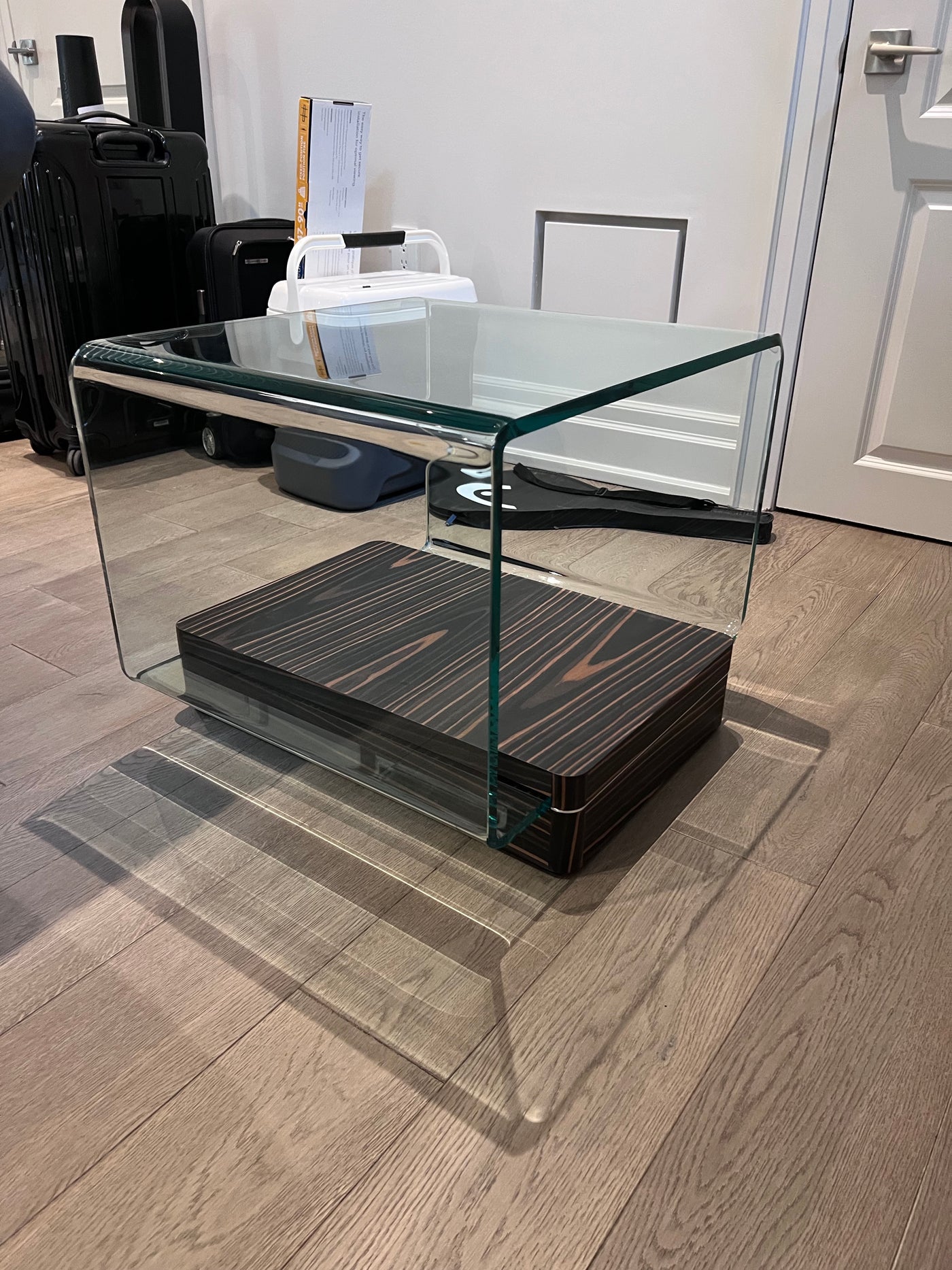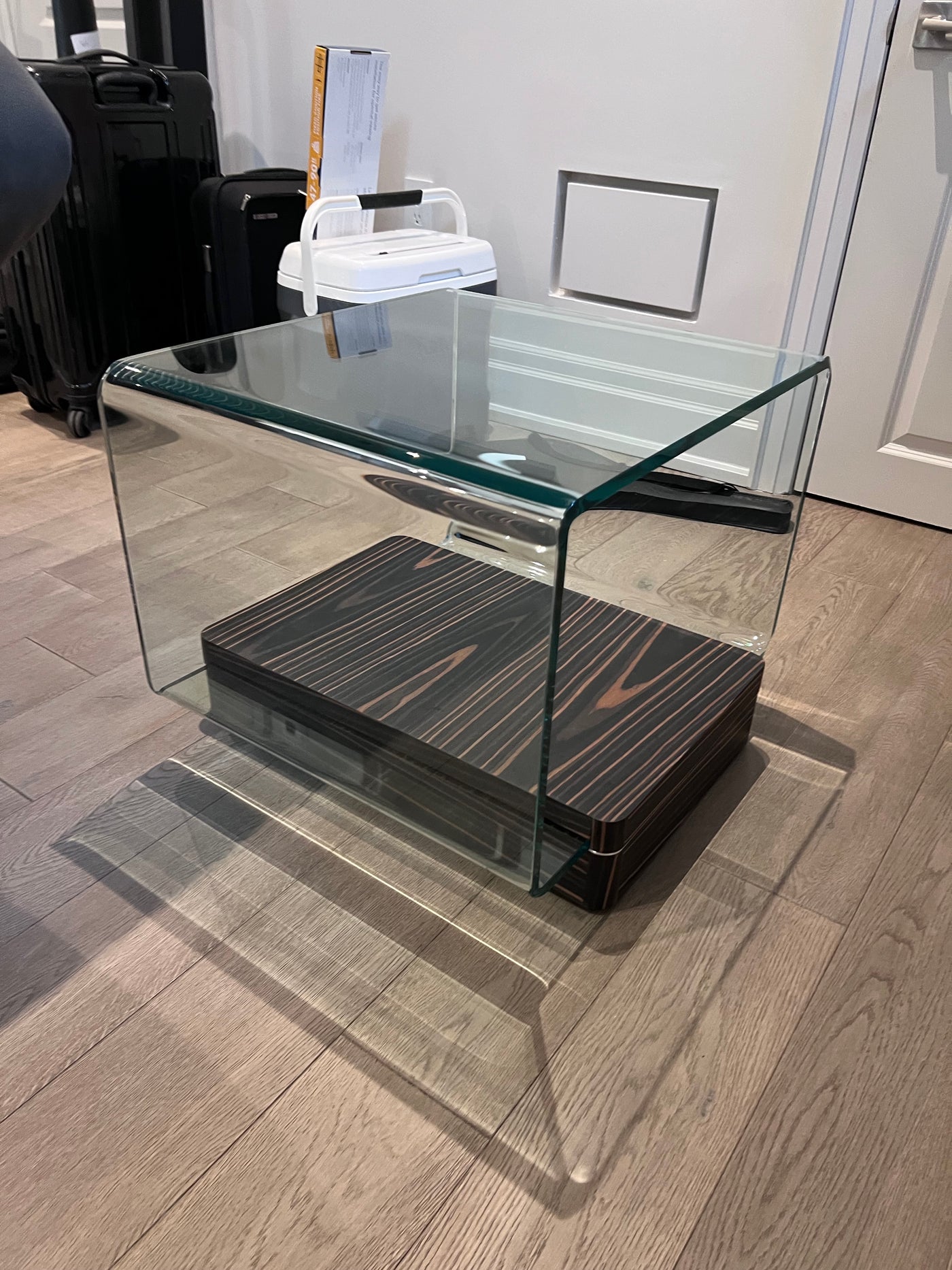 Simple and elegant the Lepage End Table is perfect for any living room. Square in shape this end table can be used with sofas or sectionals. The thick tempered glass top provides a unique design element with its rounded sides. Complimented by a wood base.