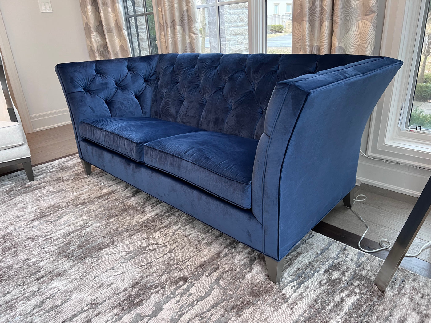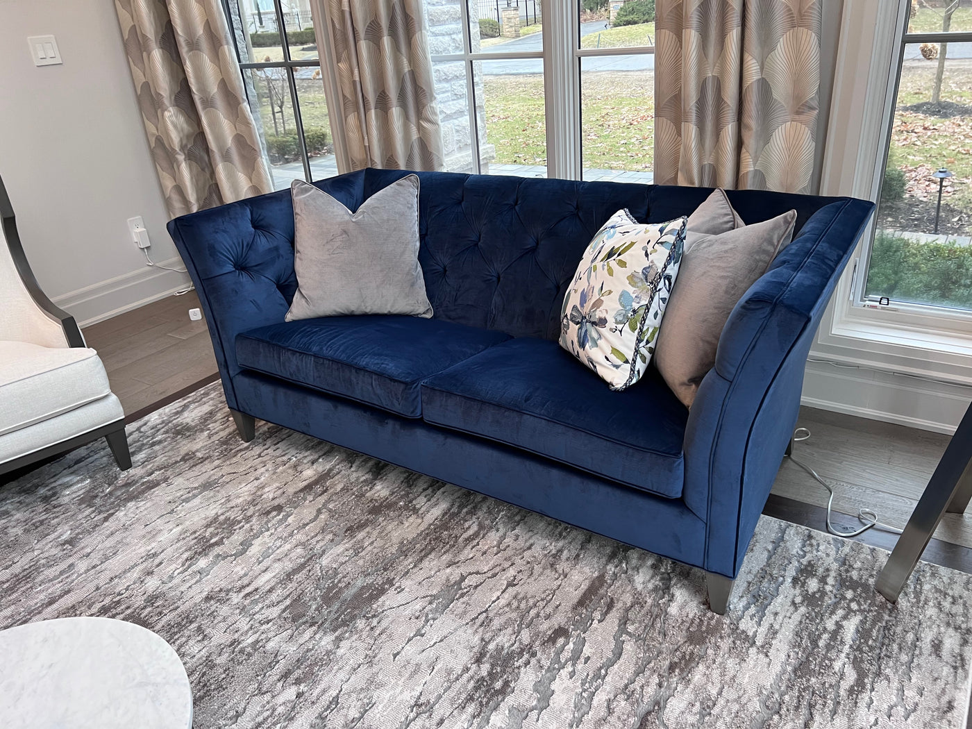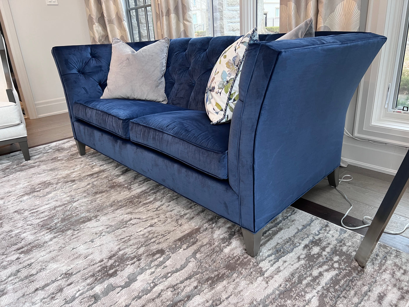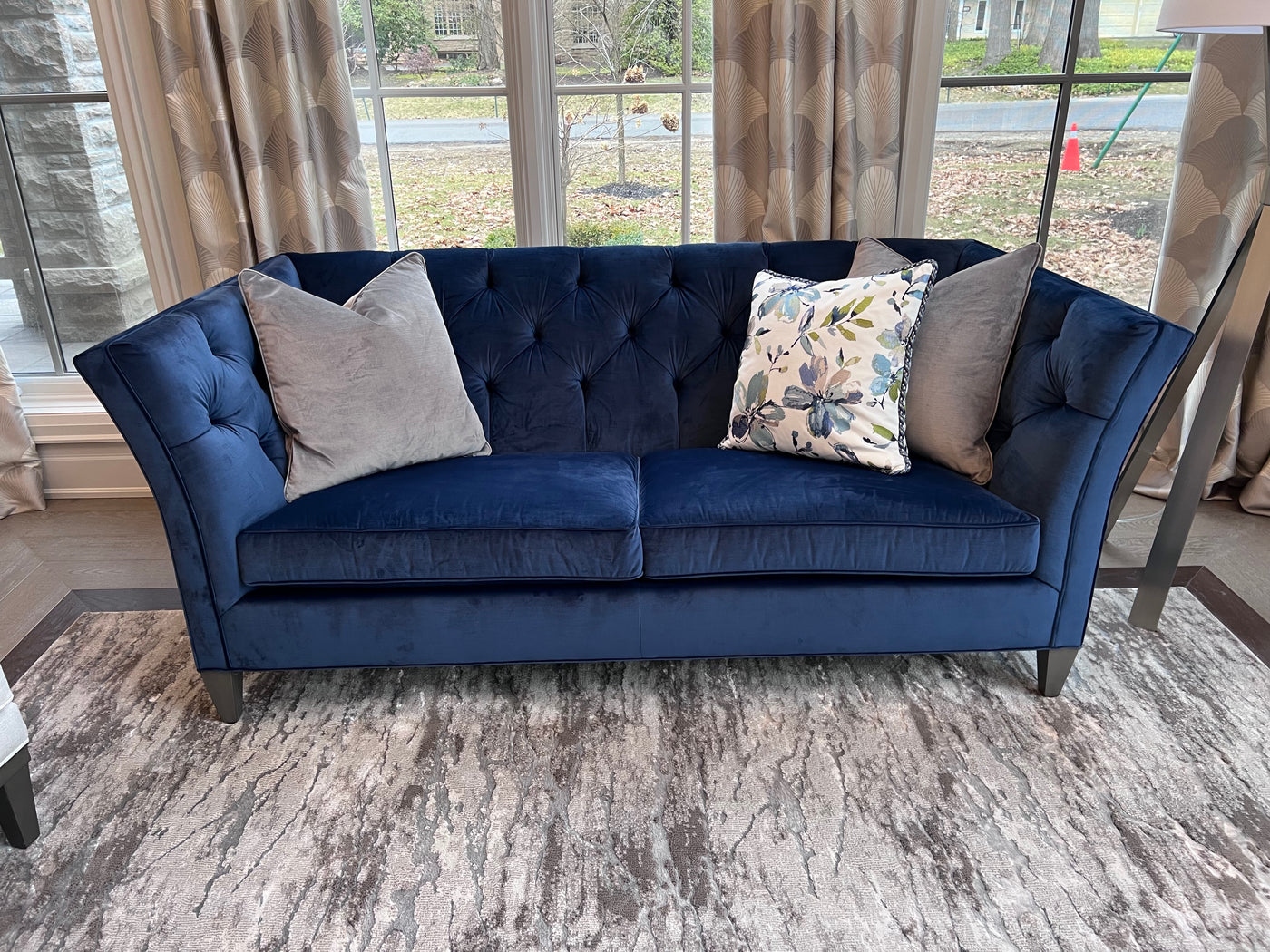 Ethan Allen Shelton Blue Tufted Sofa # 2 (*retail $4,200). Accent pillows shown on the sofa are included.