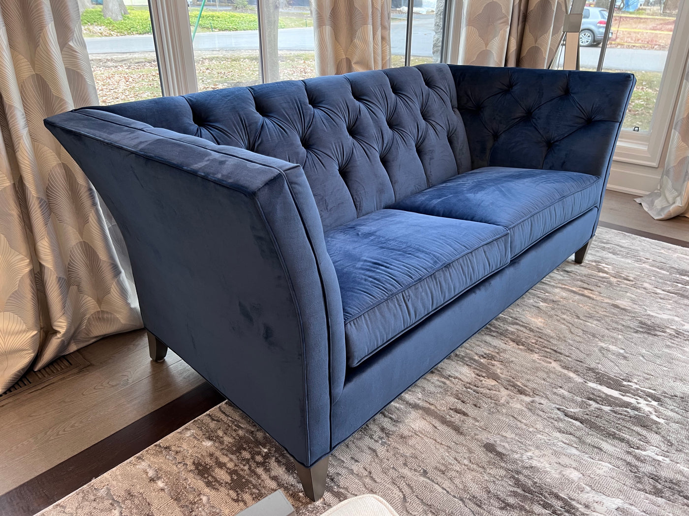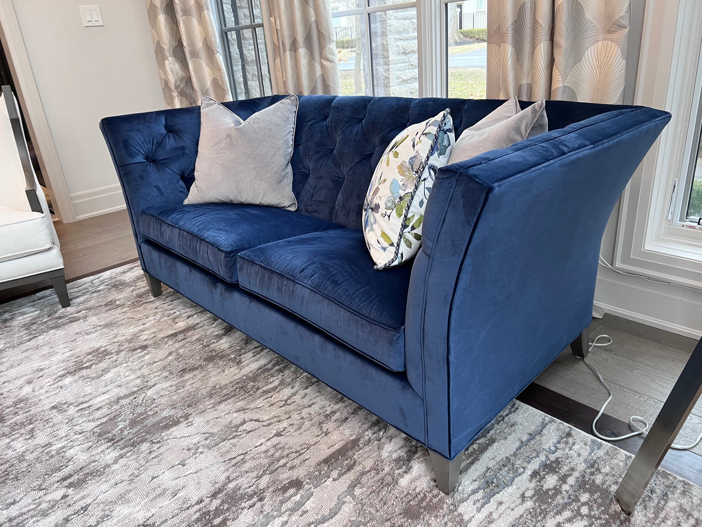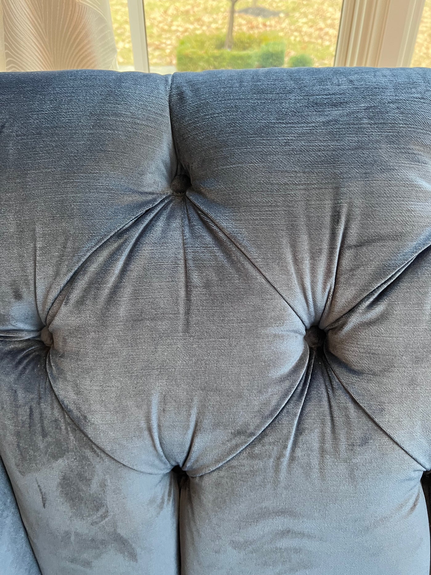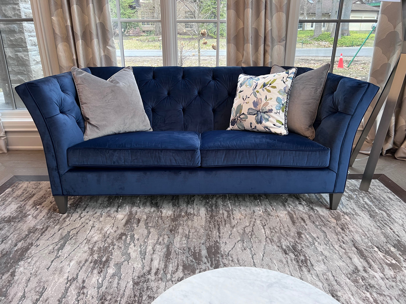Ethan Allen Shelton Blue Tufted Sofa # 2 (*retail $4,200). Accent pillows shown on the sofa are included.