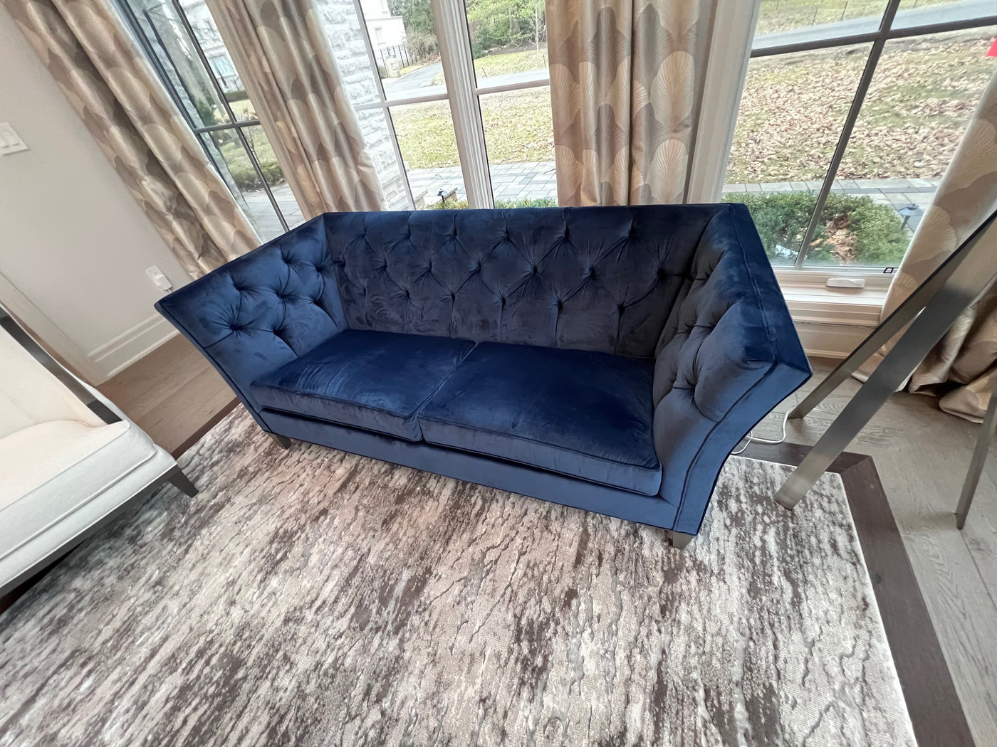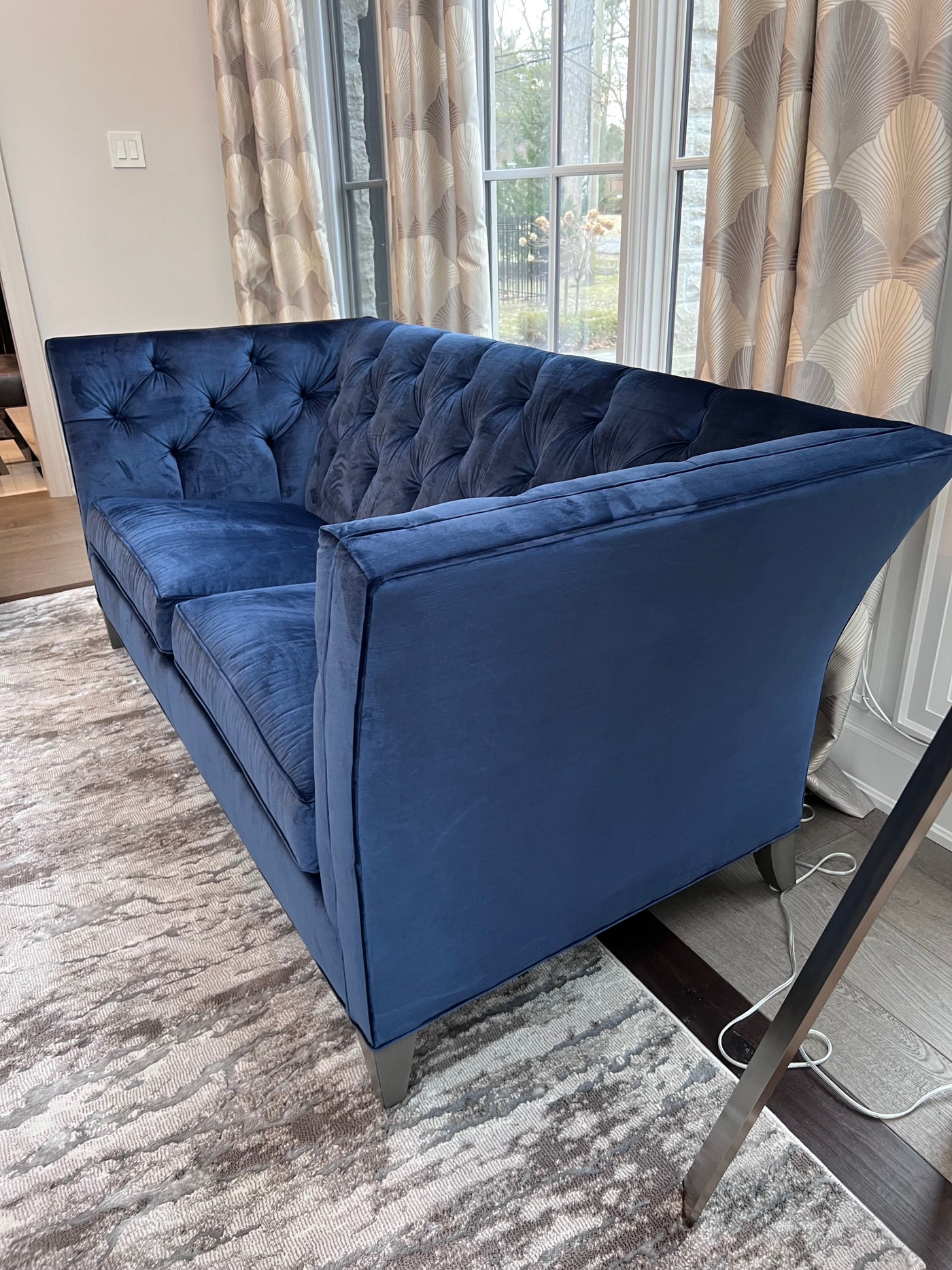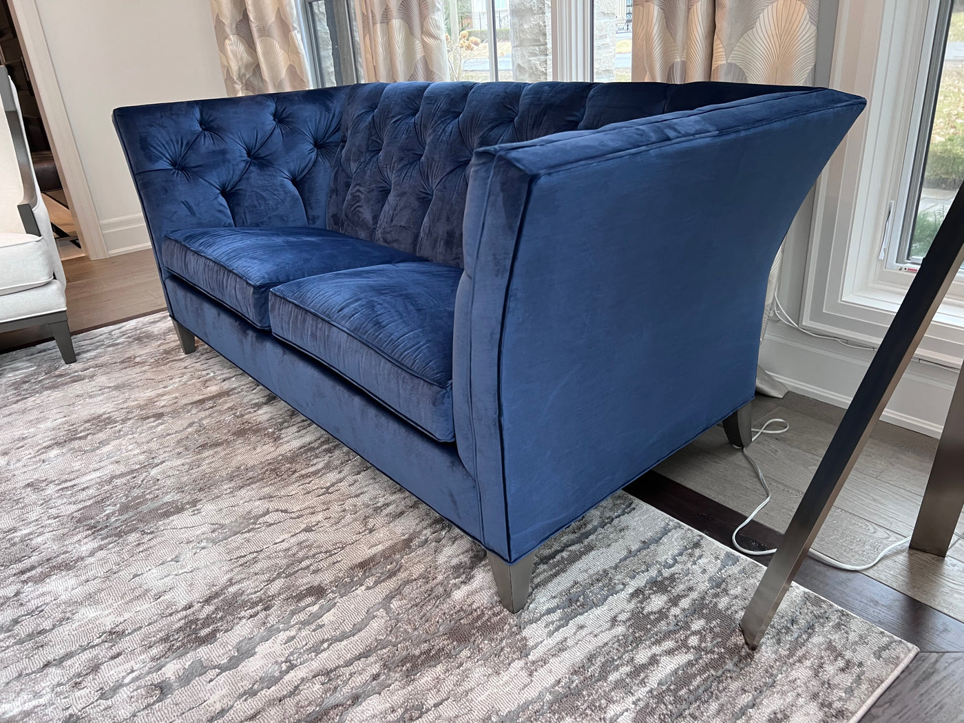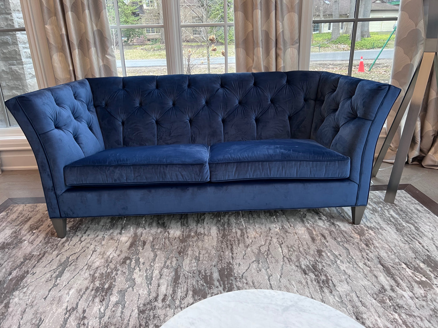 Ethan Allen Shelton Blue Tufted Sofa # 2 (*retail $4,200). Accent pillows shown on the sofa are included.