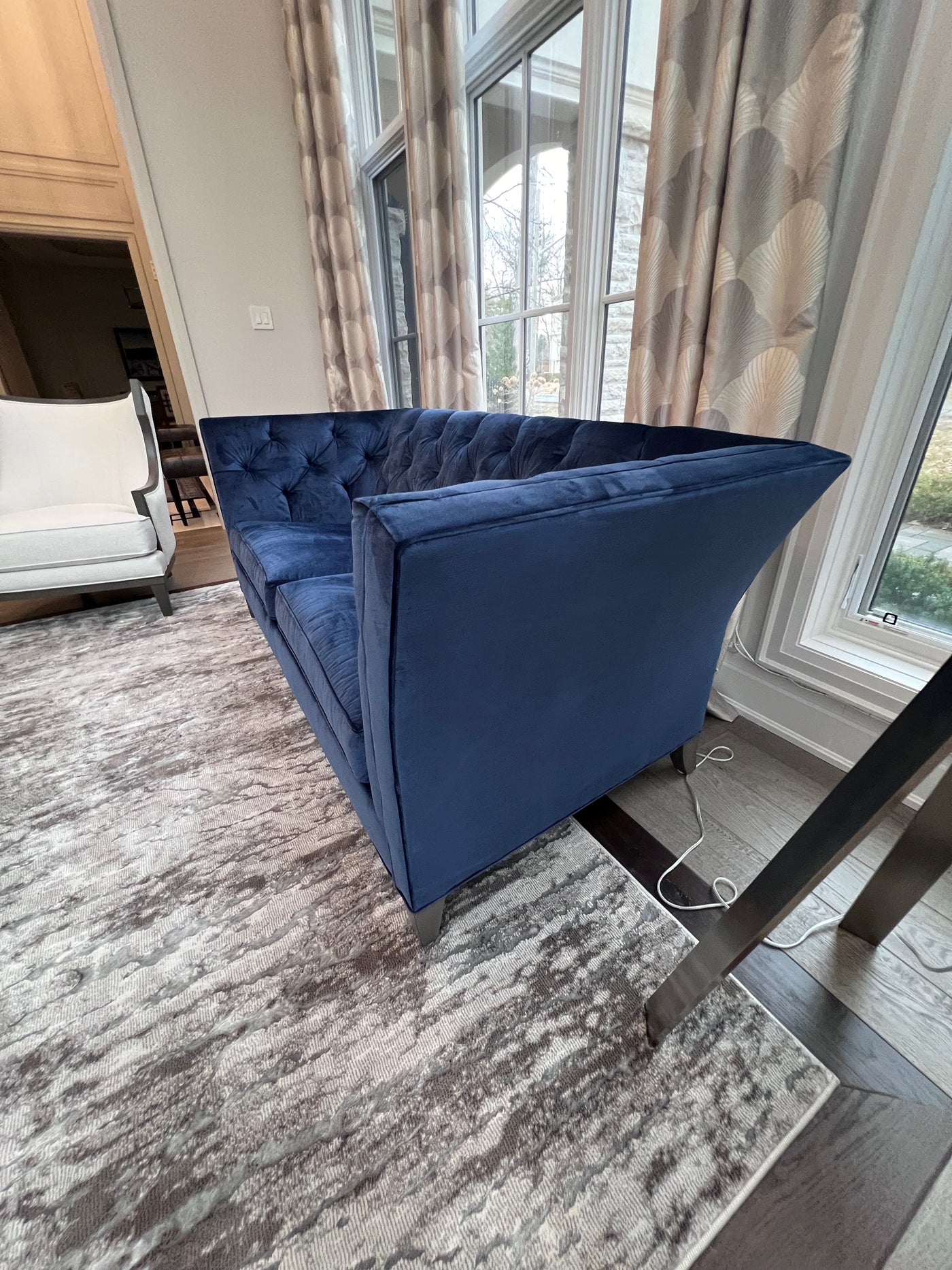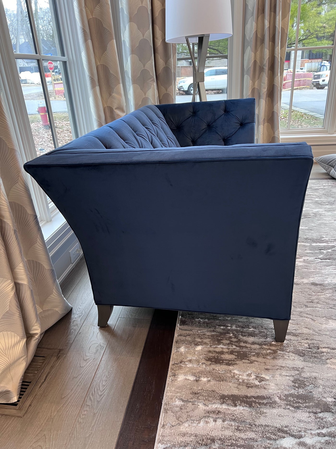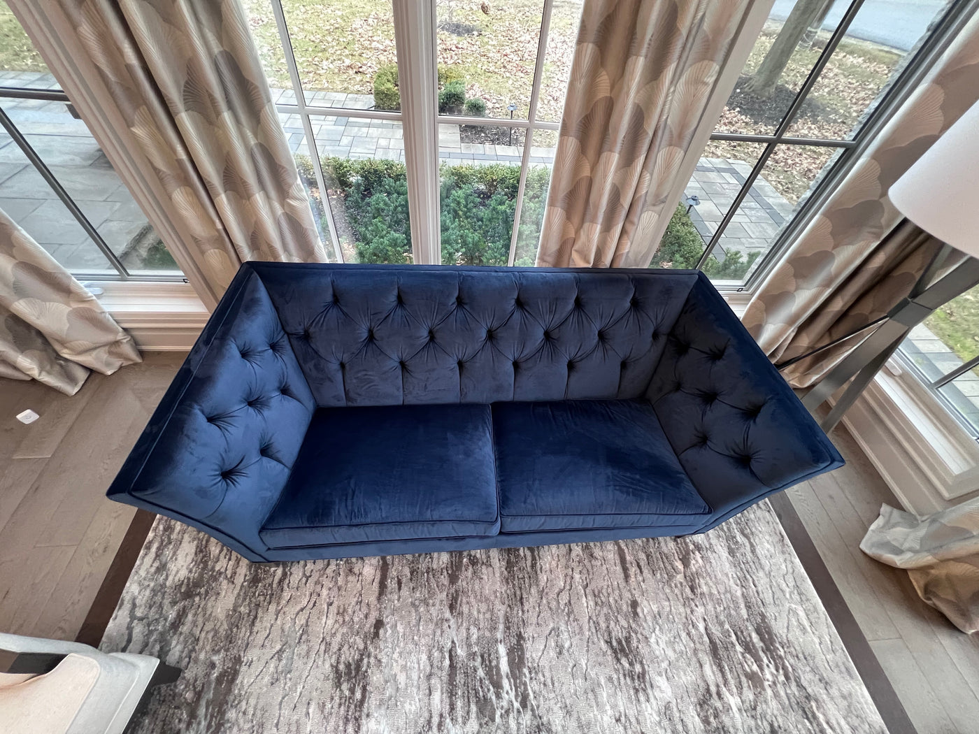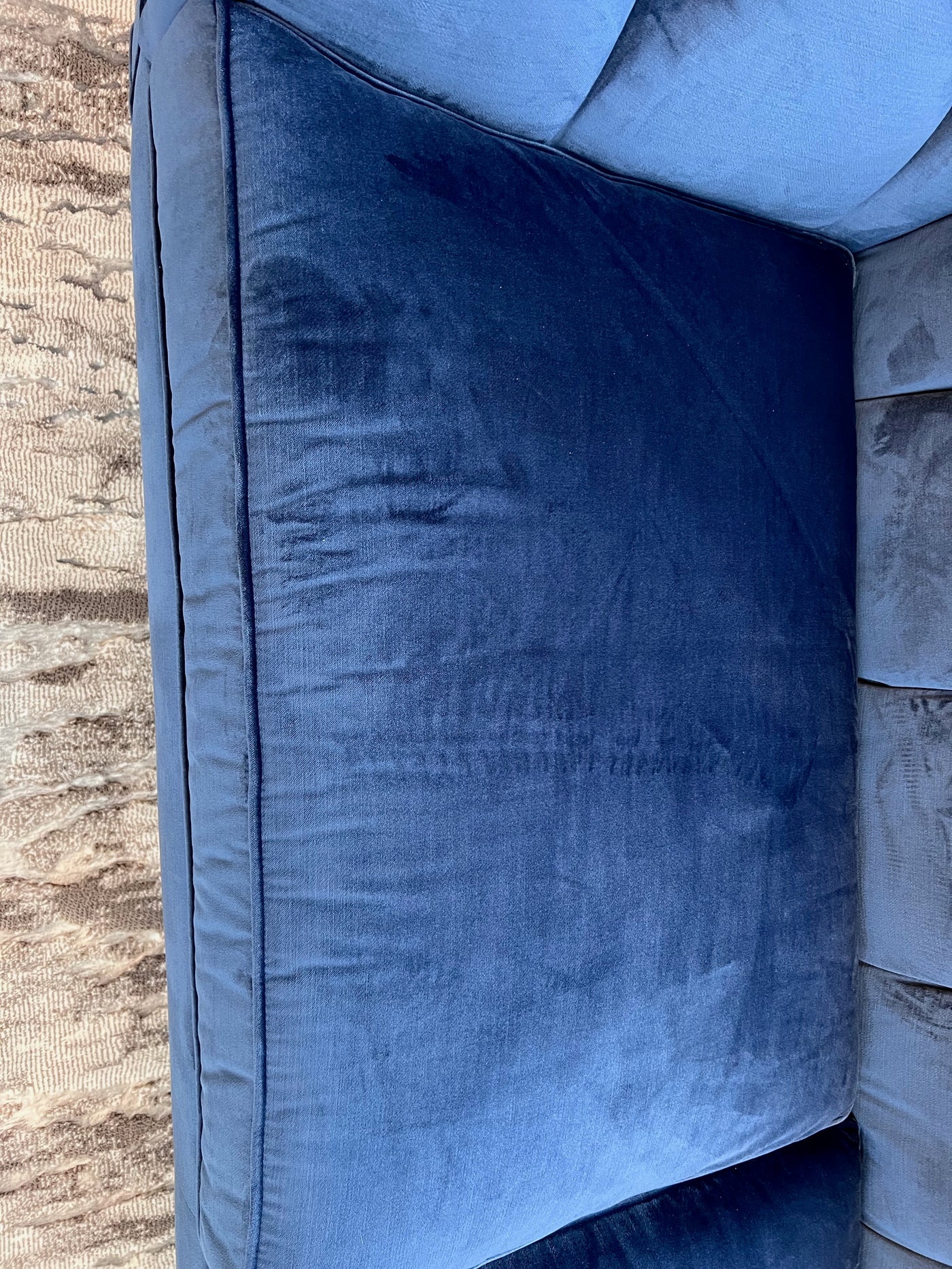 Ethan Allen Shelton Blue Tufted Sofa # 2 (*retail $4,200). Accent pillows shown on the sofa are included.