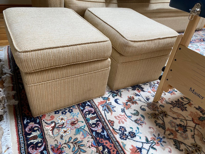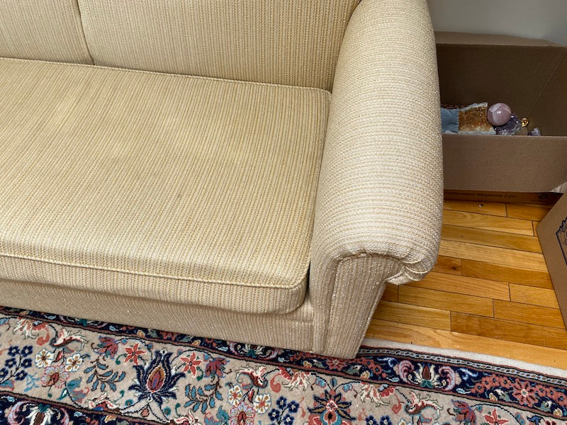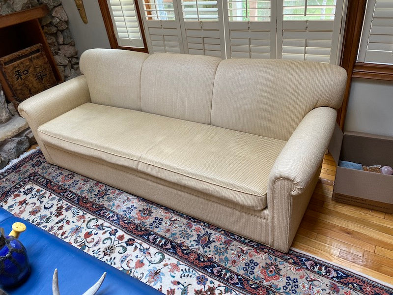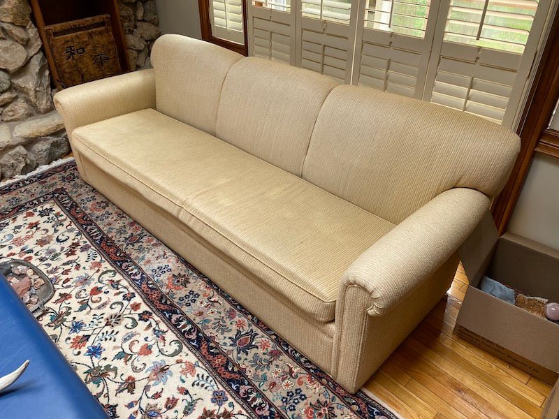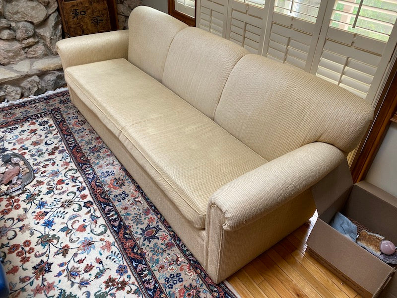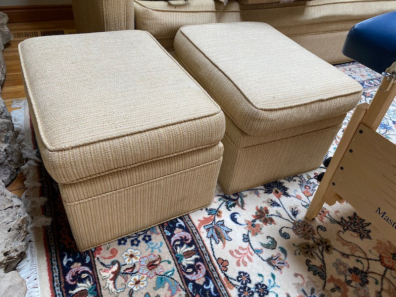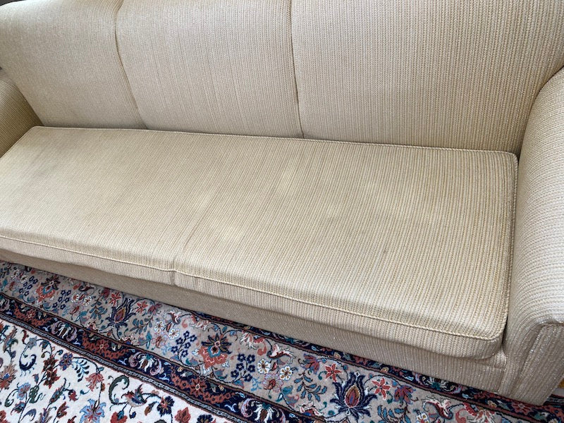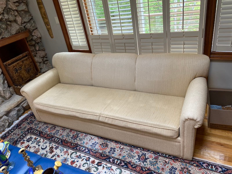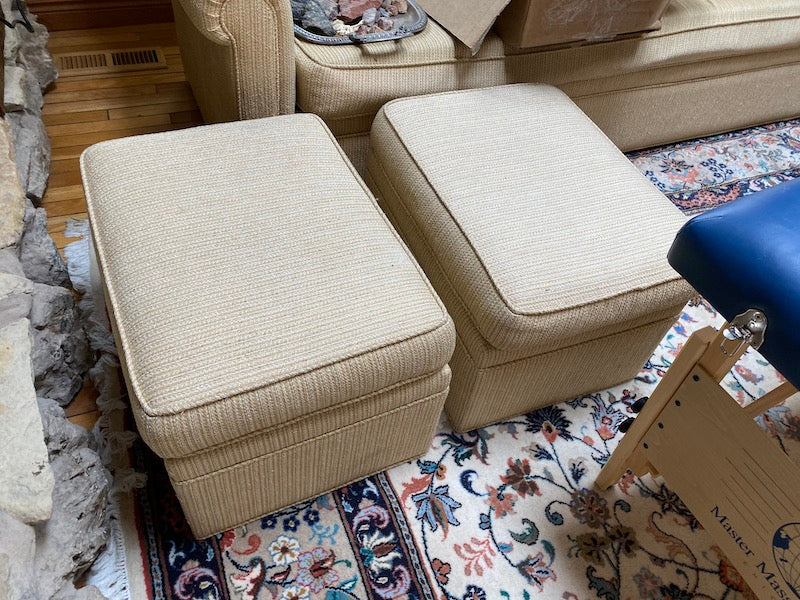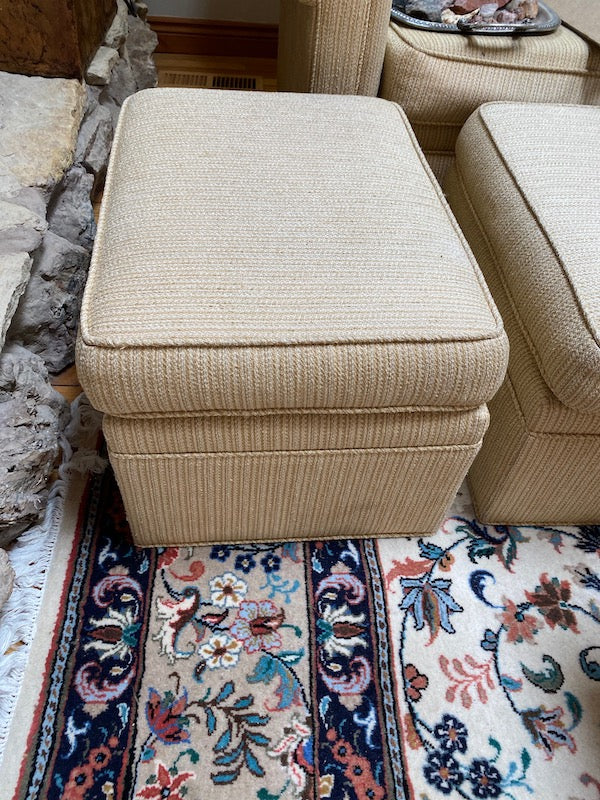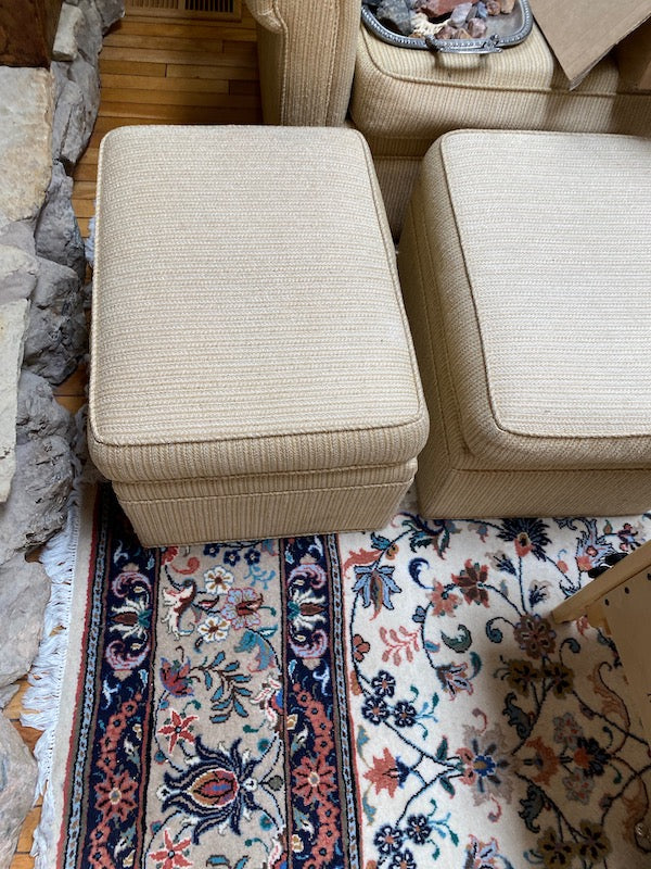 Vintage Beige Upholstered Sofa + 2 Ottomans/Footstools.
