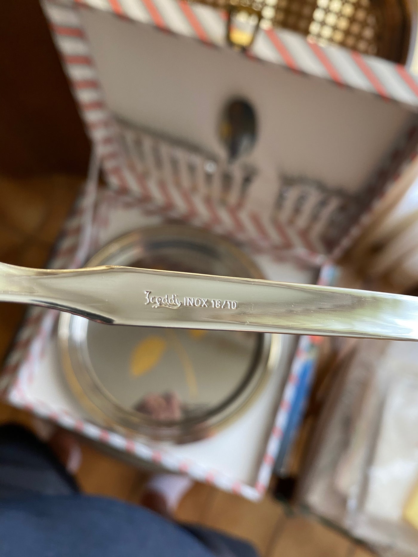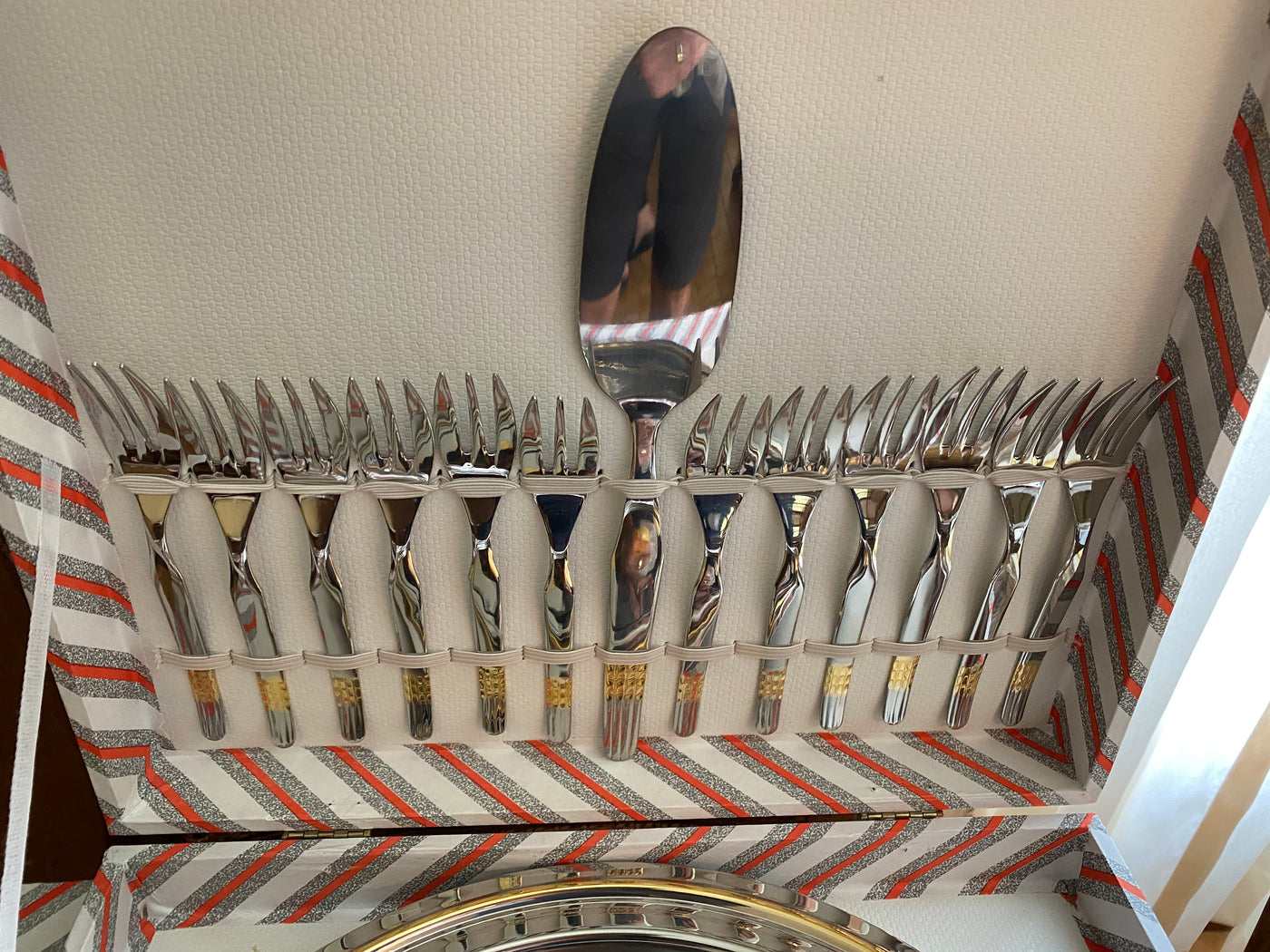 Freddi Oro 24kt Stainless Steel Round Cake Plate + Forks and Cake Knife.