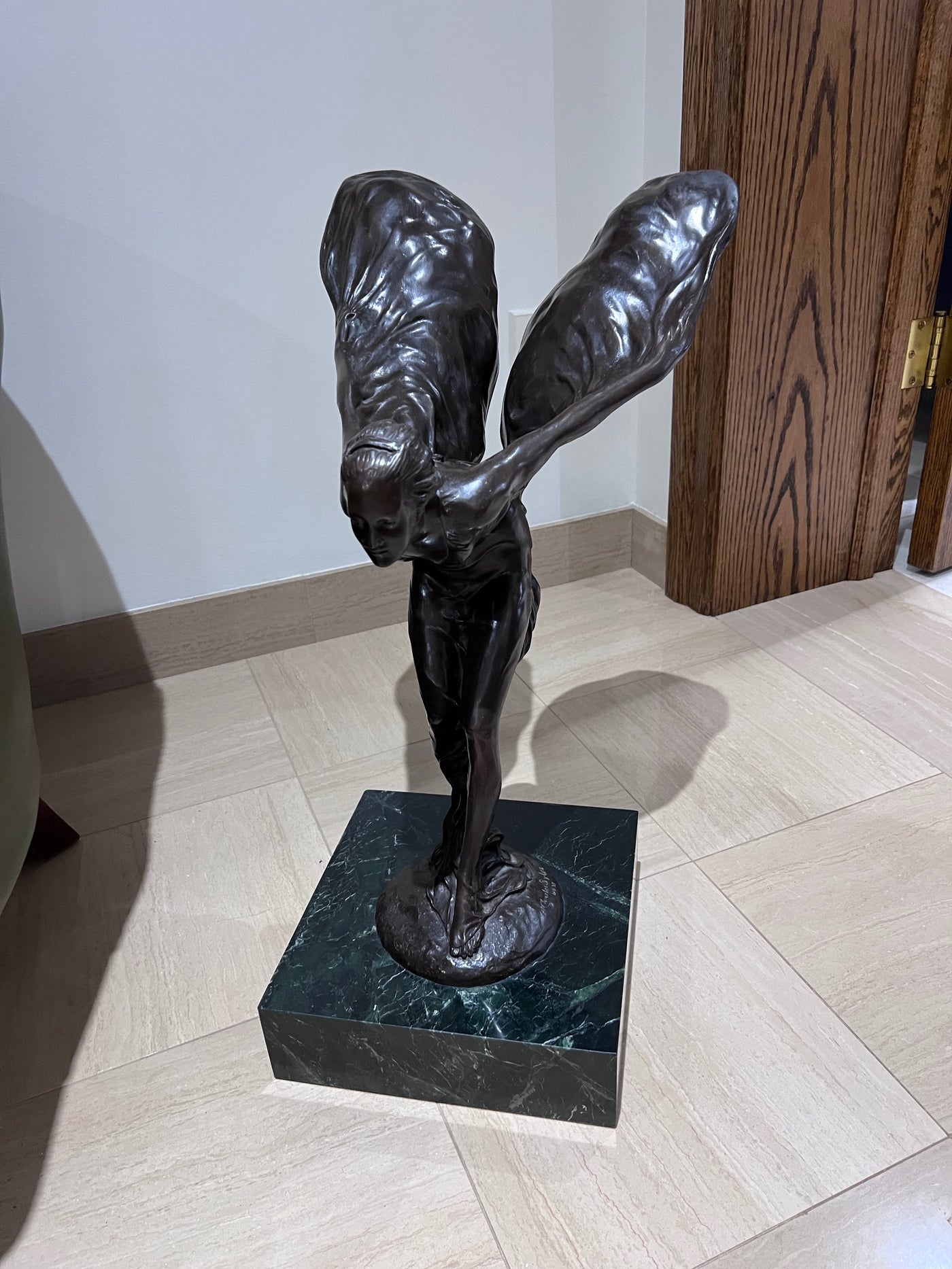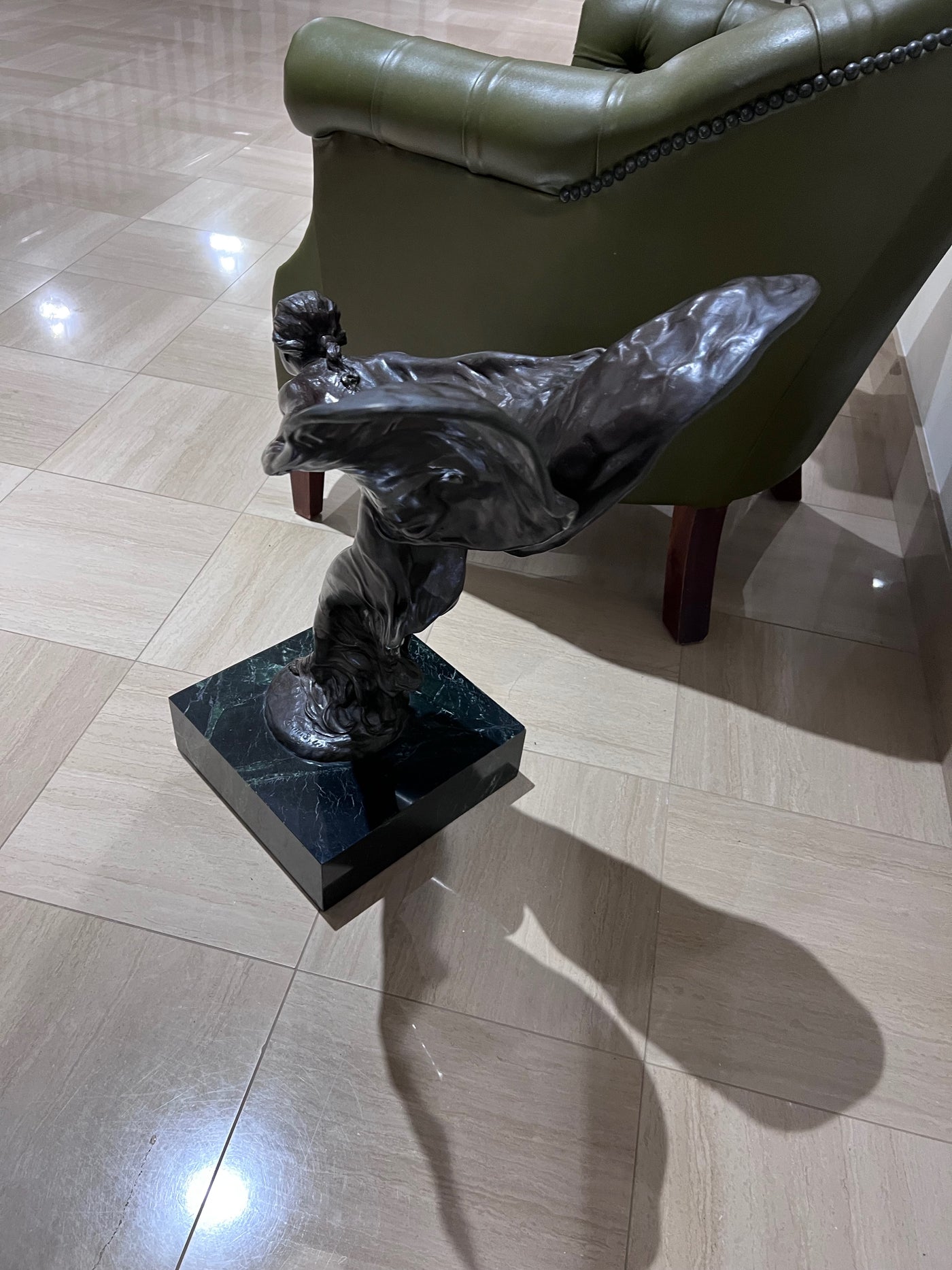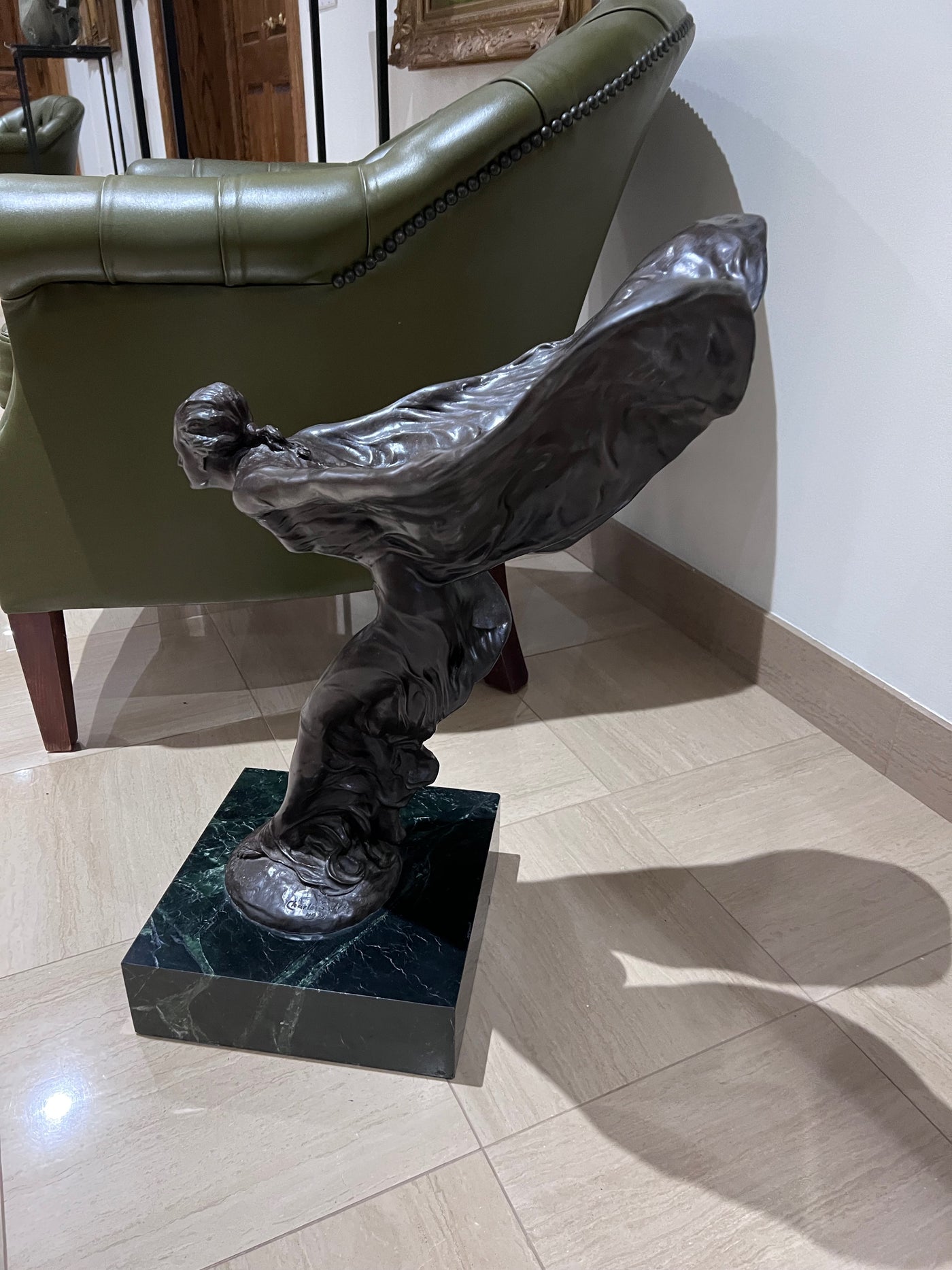 Mid-20th Century bronze of the legendary Rolls-Royce mascot which was designed by Charles Sykes R.A, the dark patinated bronze sculpture is set on a thick marble plinth. Signed by the artist Charles Sykes No.28, - later cast.