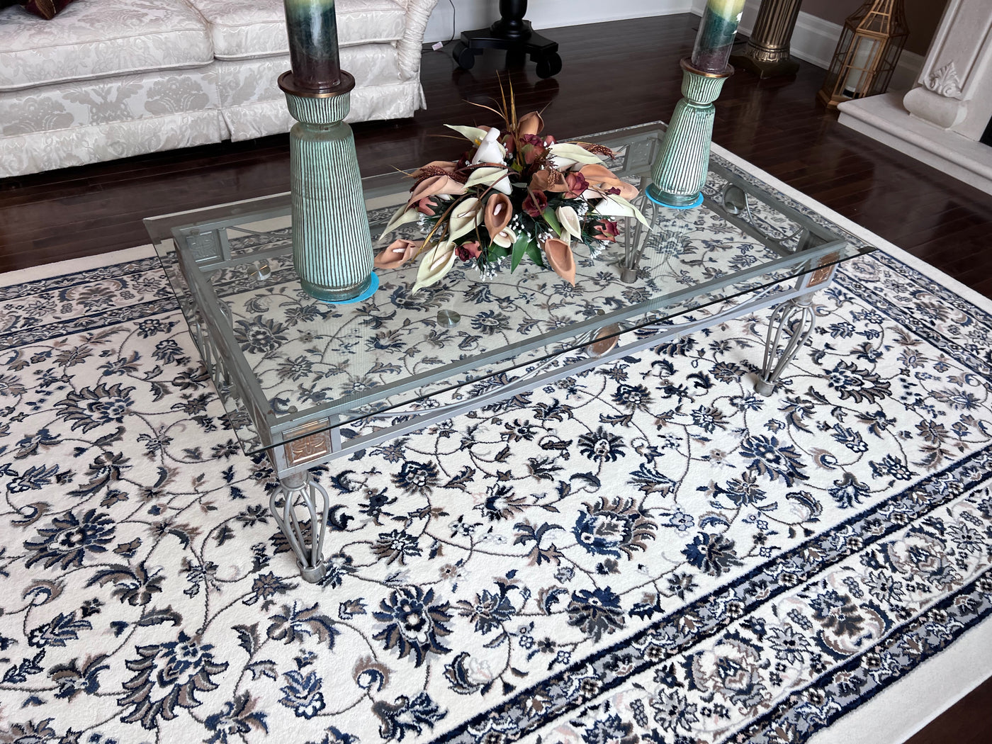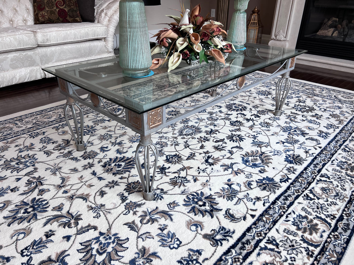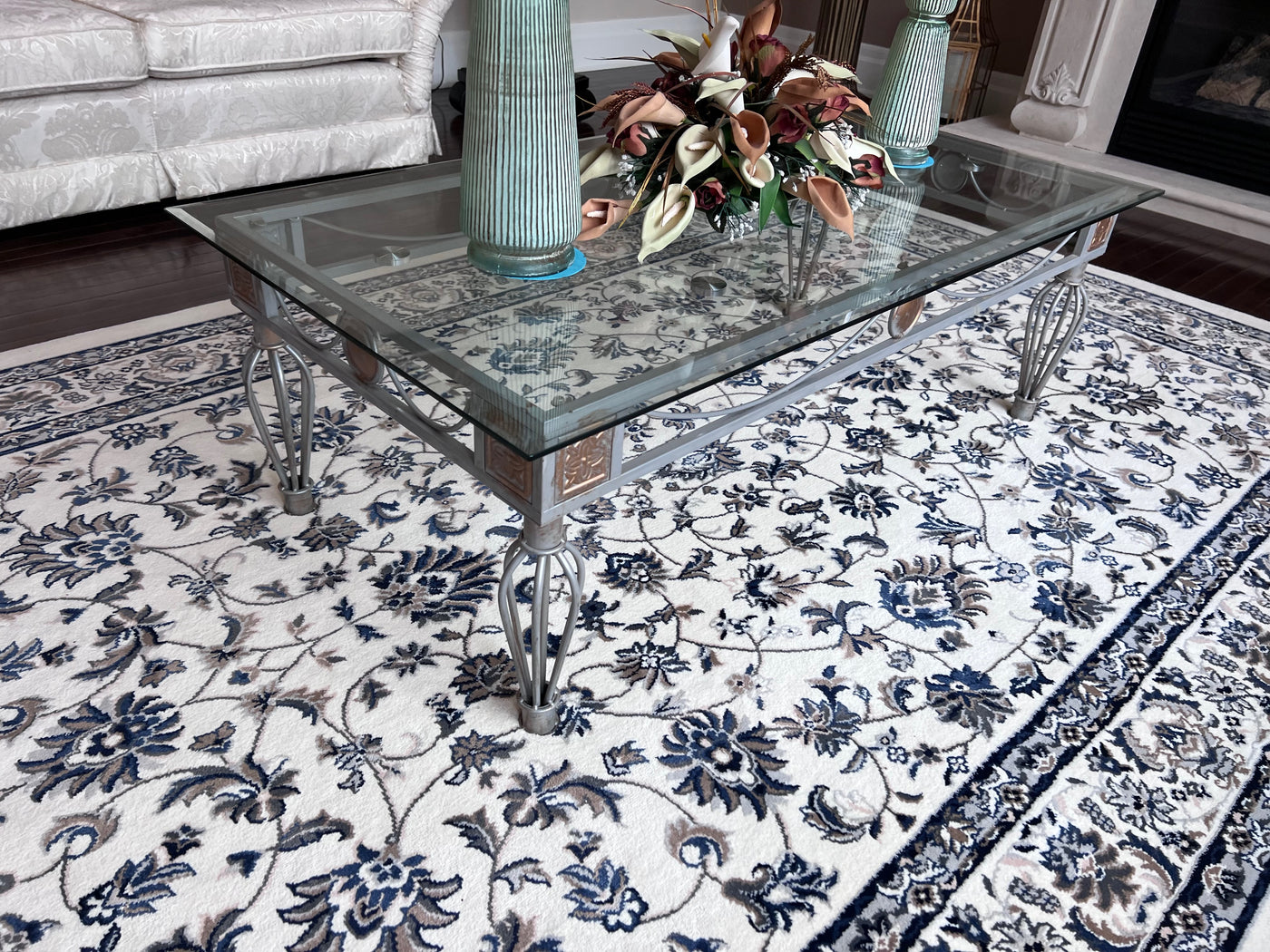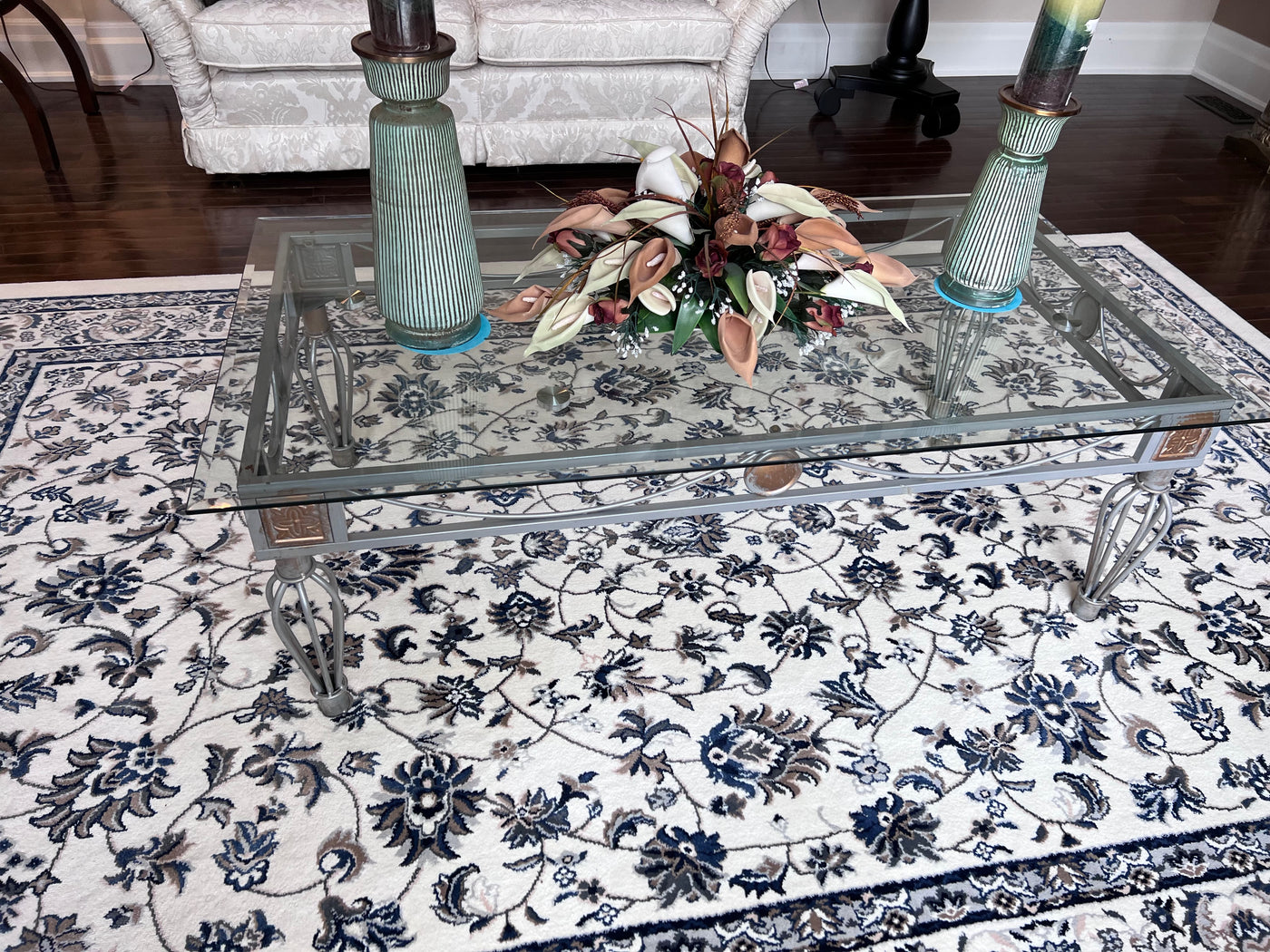 Glass Top Coffee Table, Silver and Gold Metal Base.