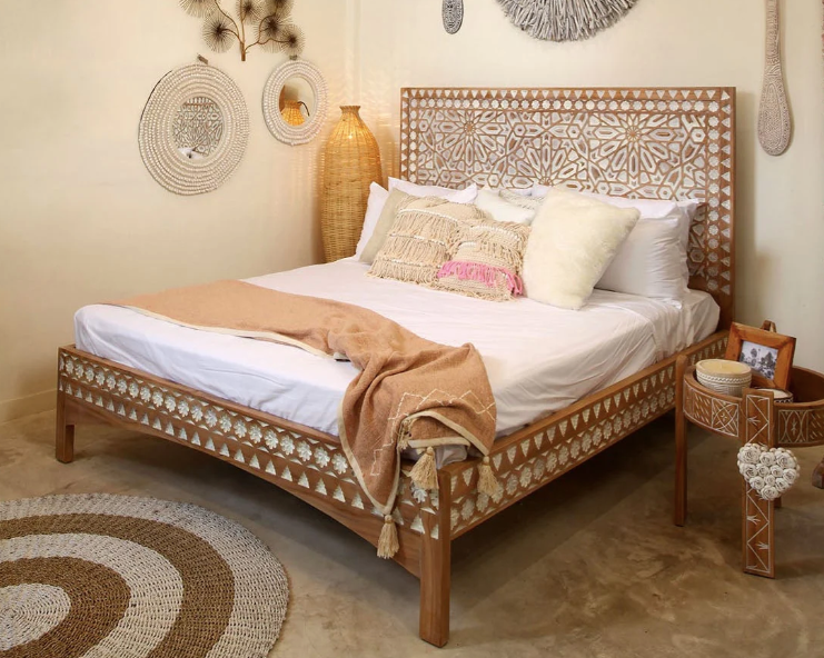 This handcarved bedroom centerpiece features a two-toned motif - inspired by a dramatic Moroccan entryway - carved along its headboard, footboard and rails.