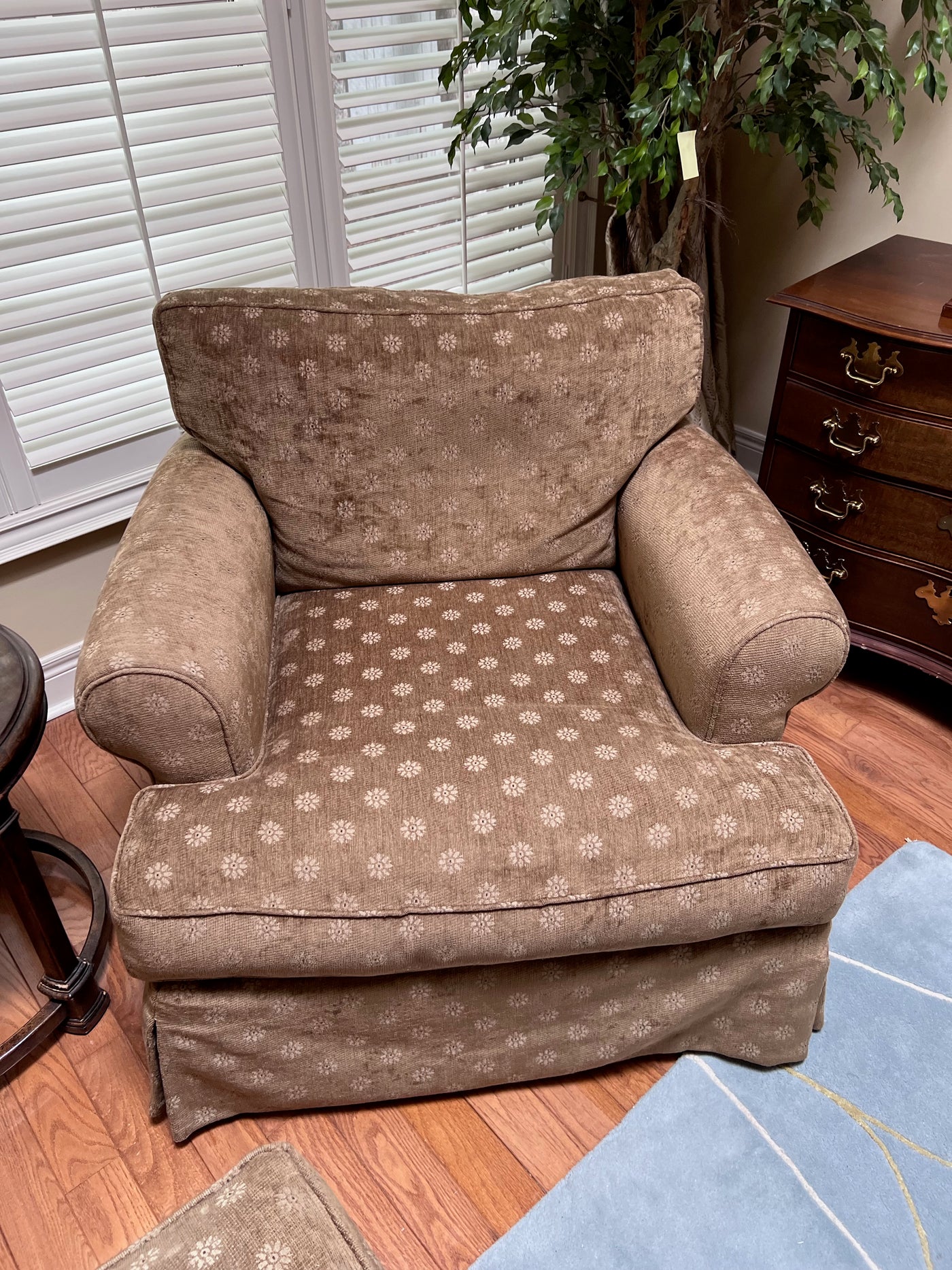 2 Upholstered 'The Art Shoppe' Armchairs + Ottoman.