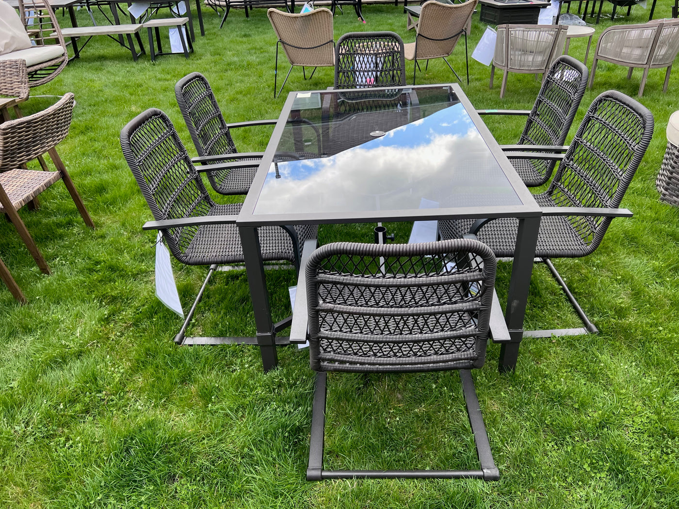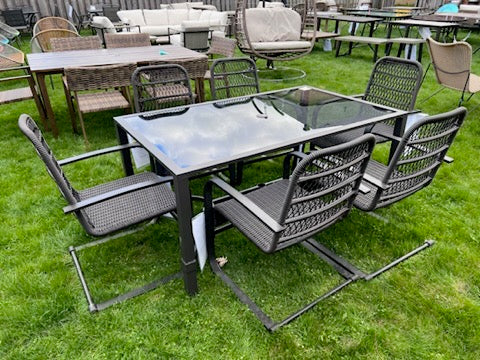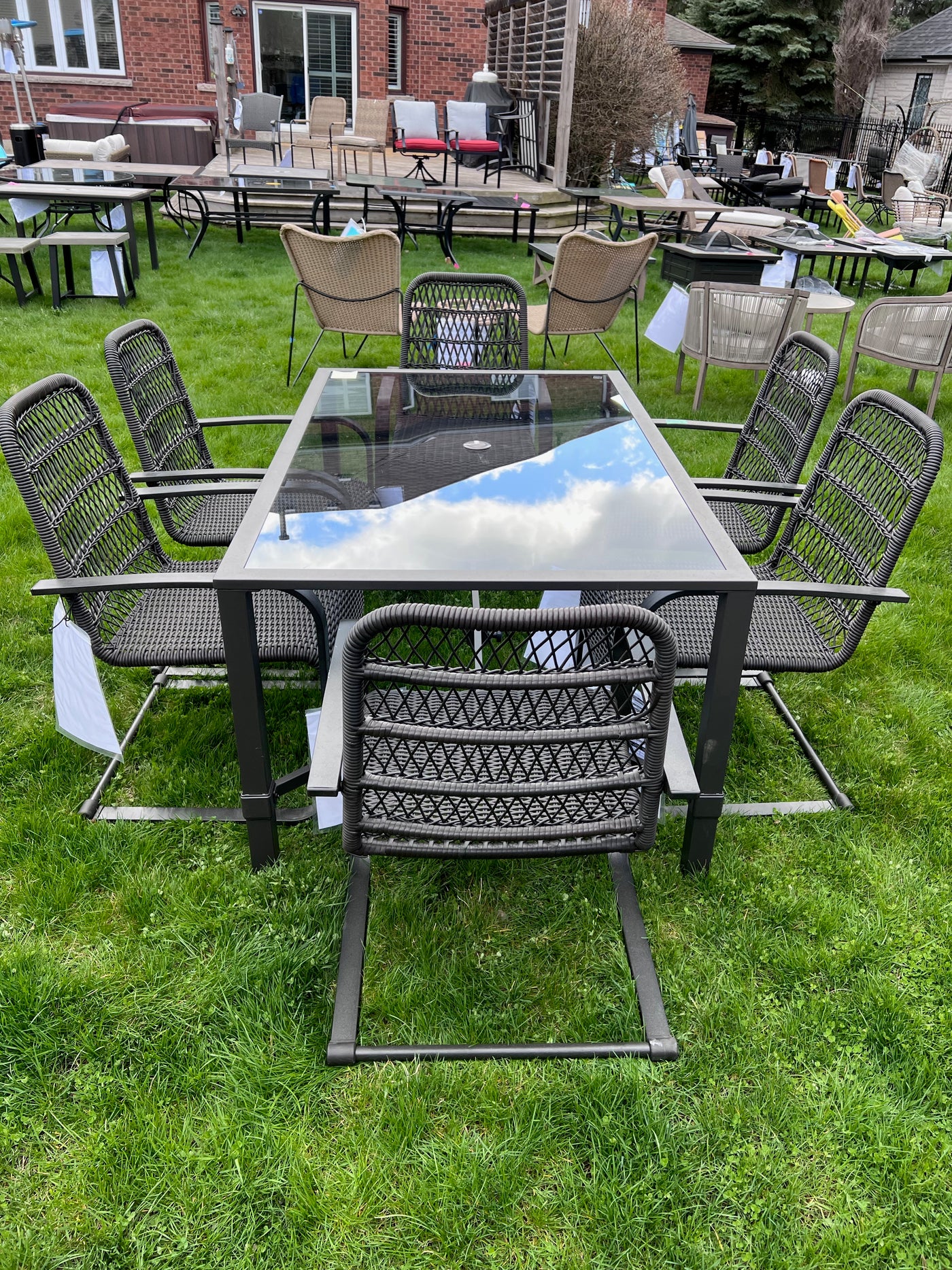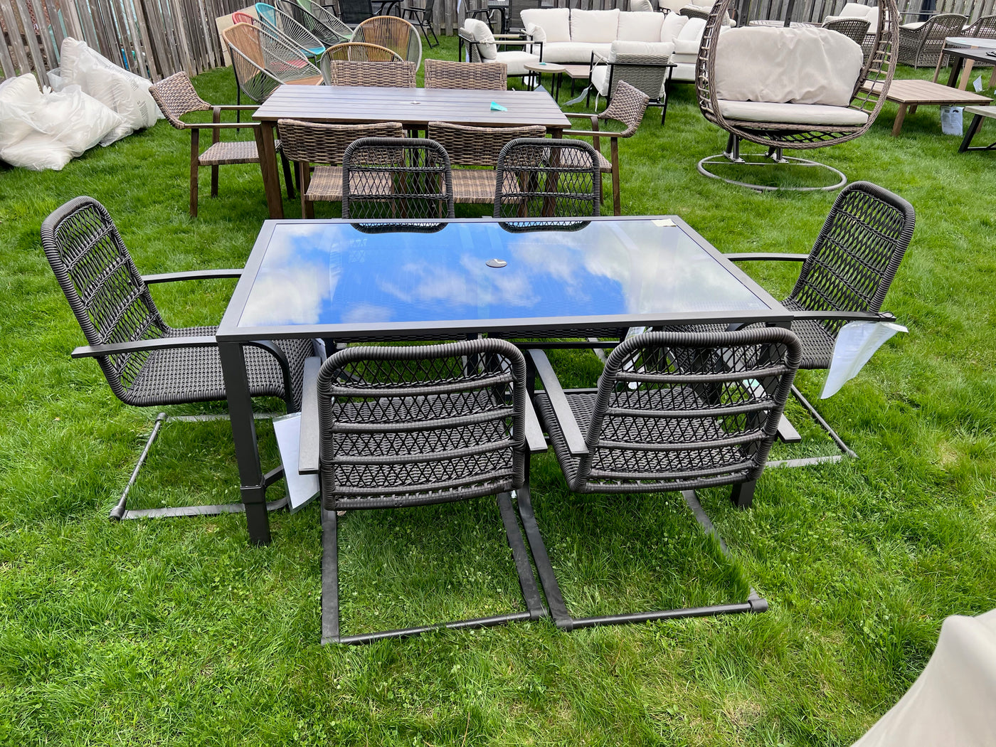Dark Brown Patio Dining Table + 6 Rocker Chairs.