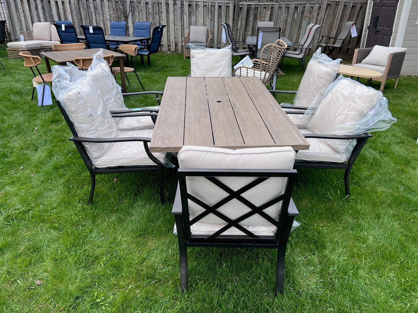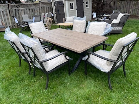 Patio Dining Table + 6 Chairs. Black frame, steel (faux wood) top and the cushions are a light beige.