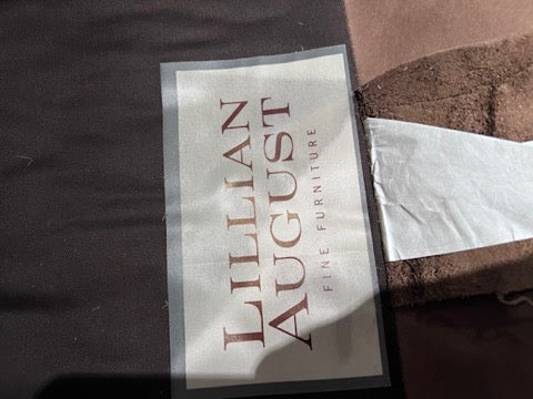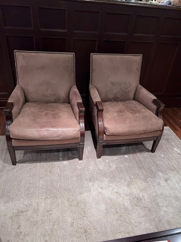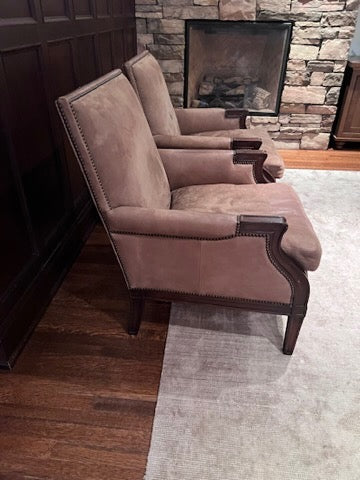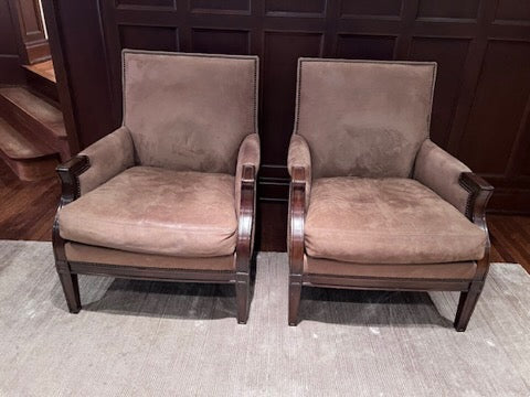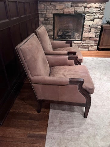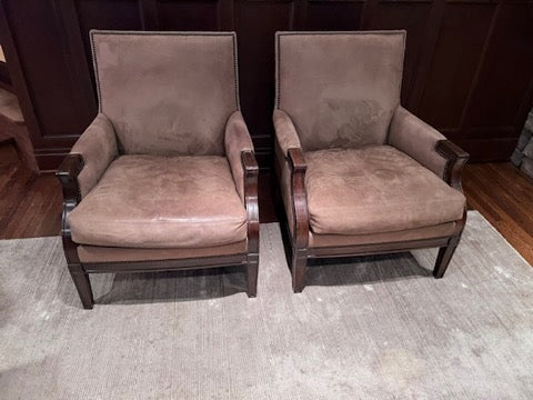Pair of "Lillian August" Brown Leather Armchairs w/Nailhead Trim. Overall in good condition. May find some minor wear on the frame.