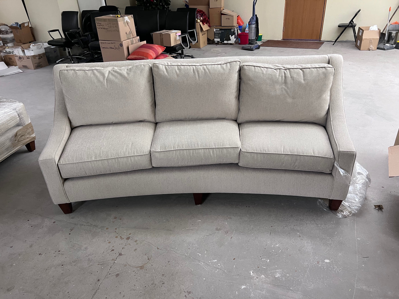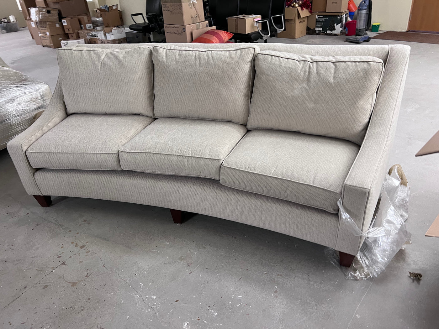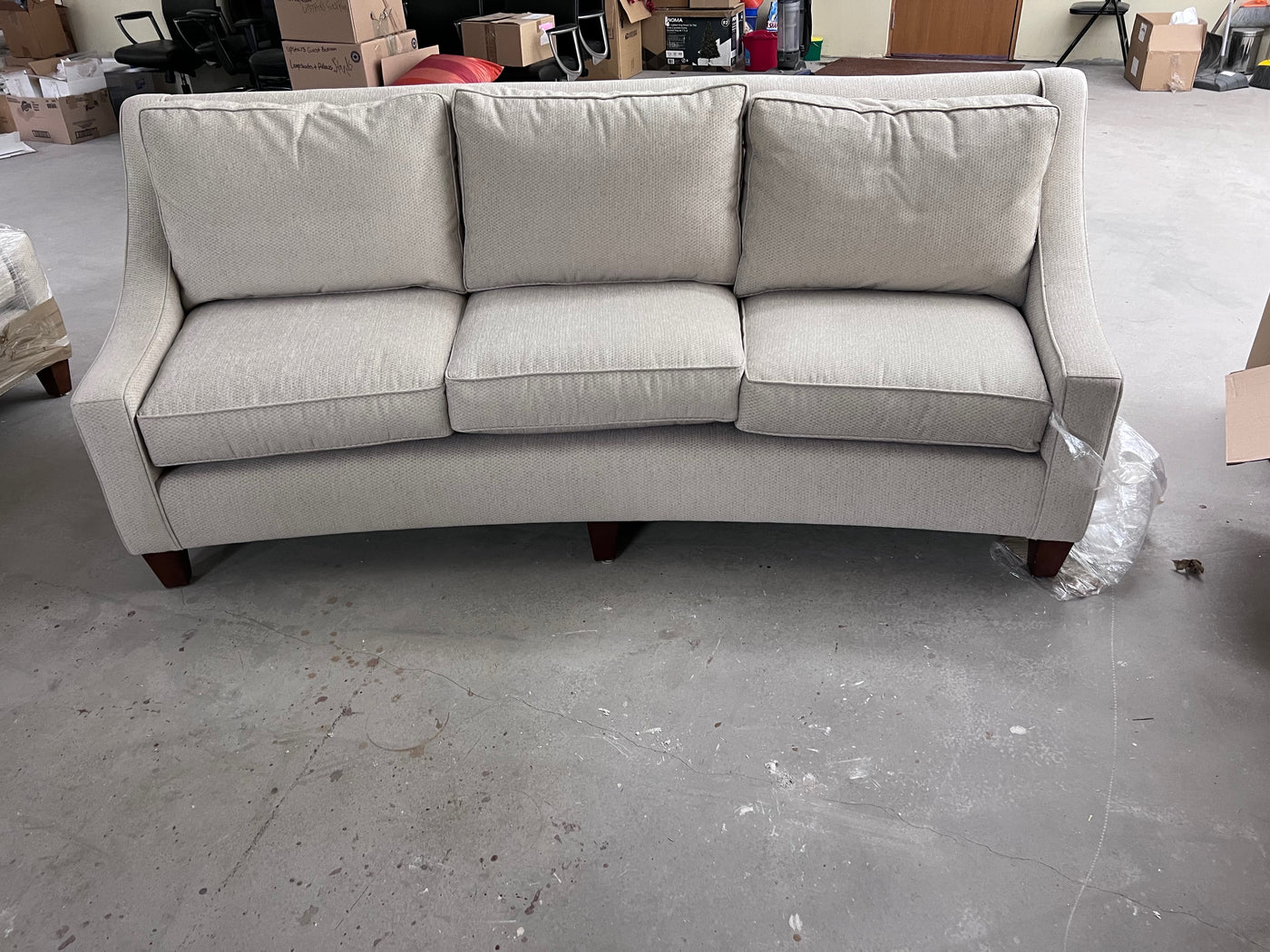 Grey Curved Back Sofa # 1. Custom made, manufacturer unknown. *We THINK the manufacturer is Silva although there is no tag to confirm it.