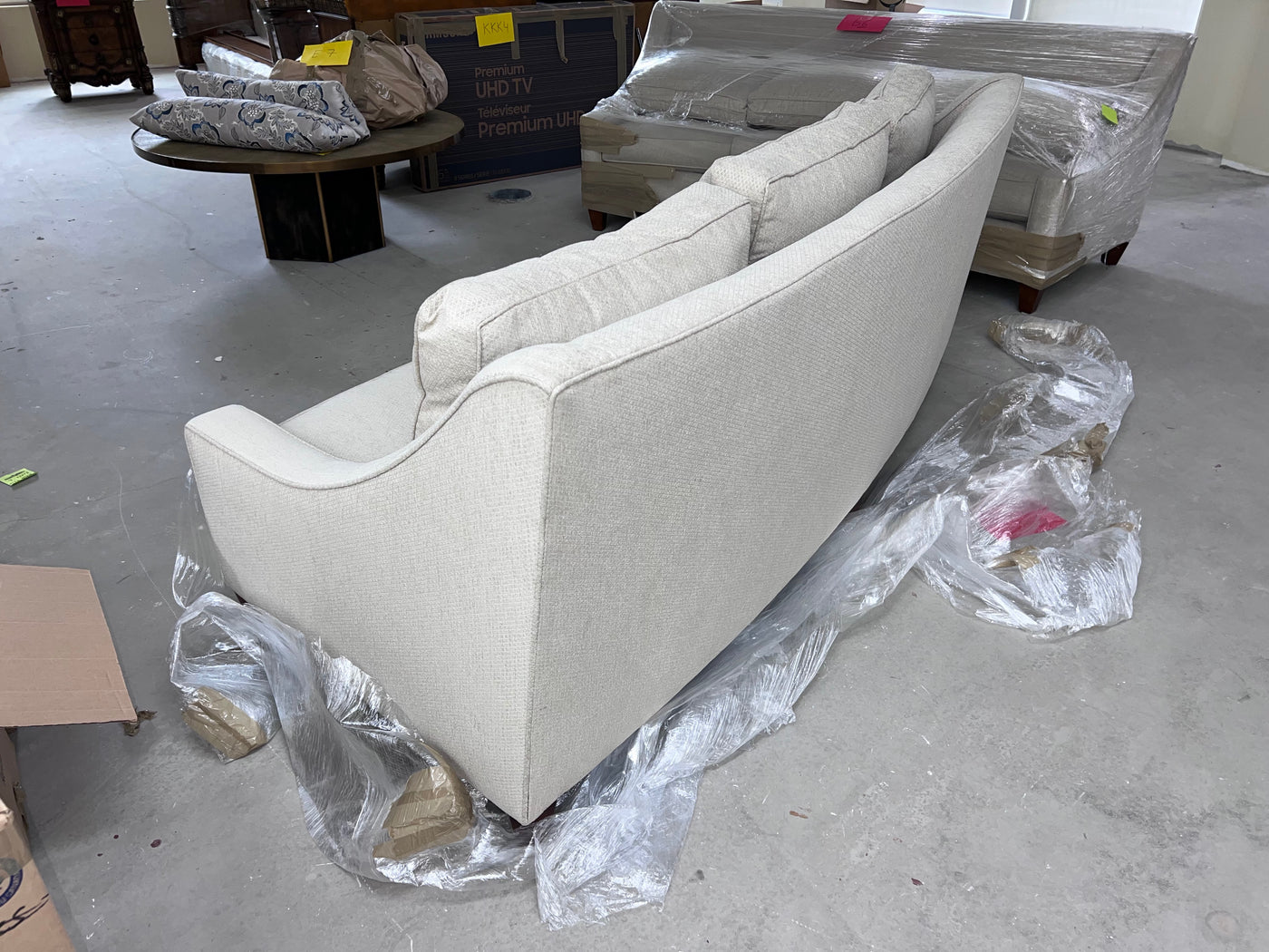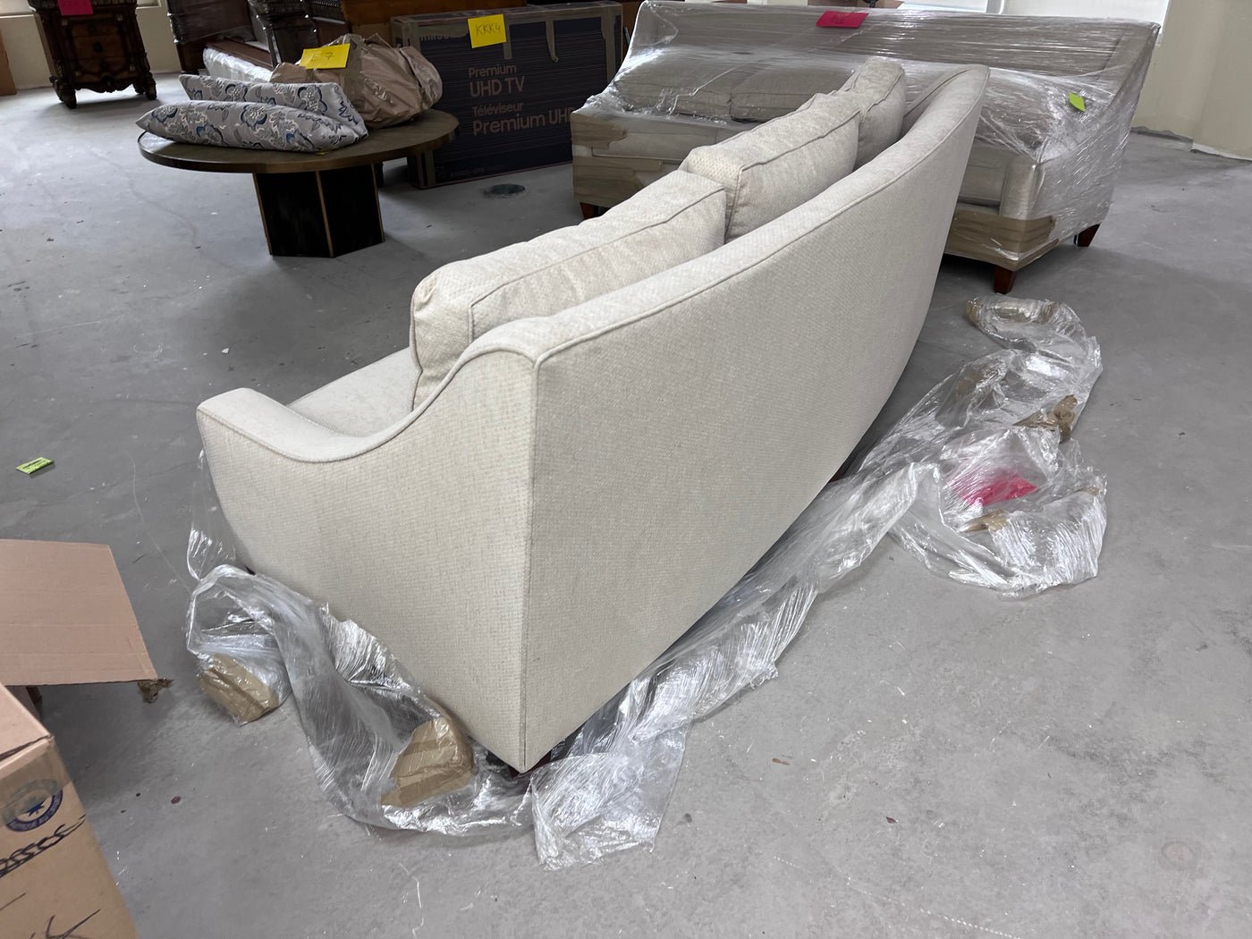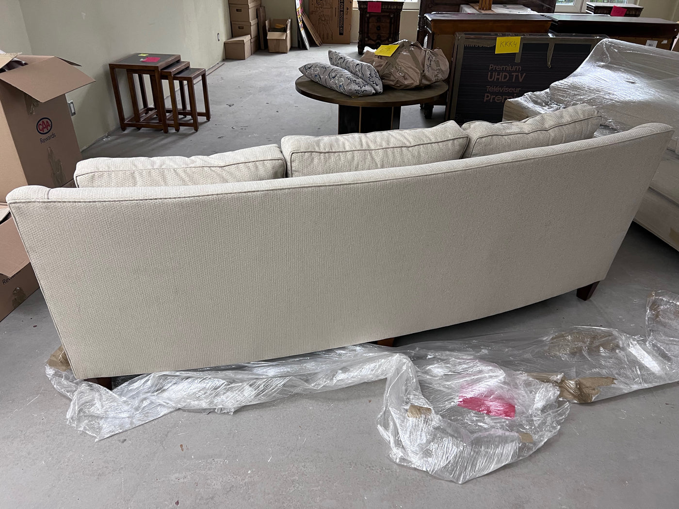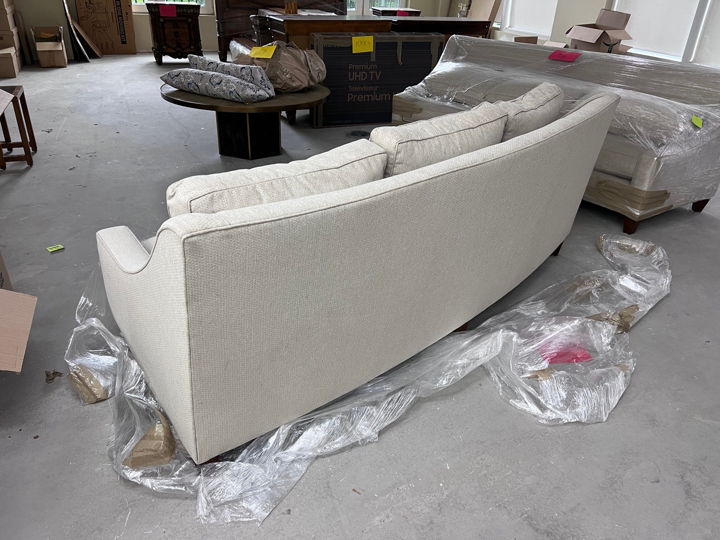 Grey Curved Back Sofa # 1. Custom made, manufacturer unknown. *We THINK the manufacturer is Silva although there is no tag to confirm it.