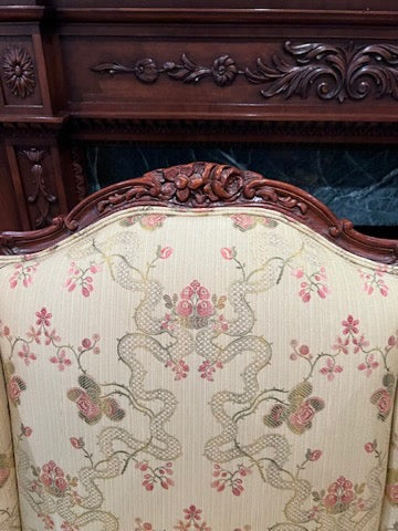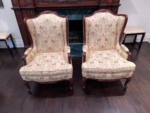 Pair of Beautiful Wingback Chairs, Carved Wood Frame, Upholstery by John & Chris Interiors