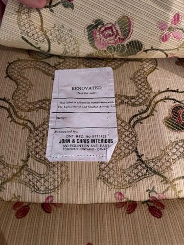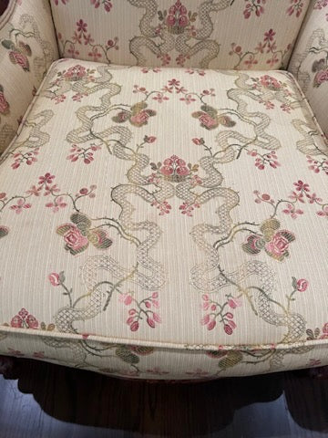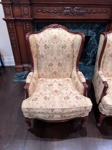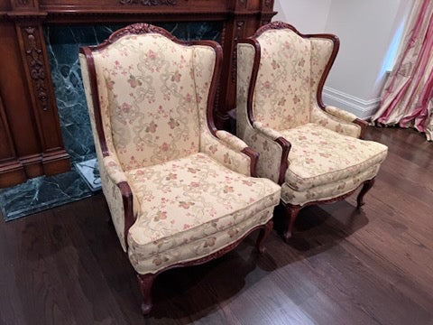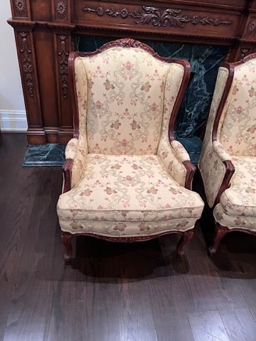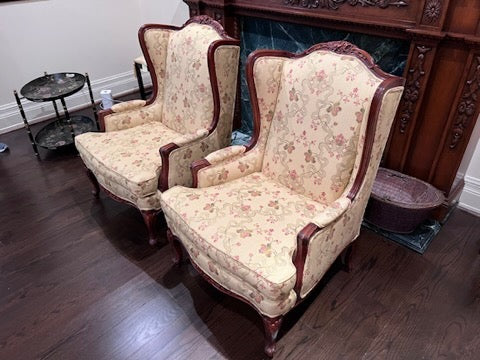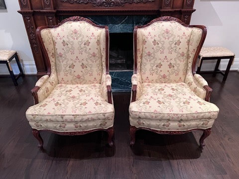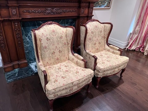 Pair of Beautiful Wingback Chairs, Carved Wood Frame, Upholstery by John & Chris Interiors. In excellent condition!